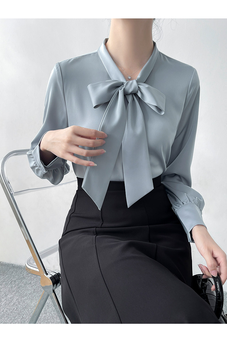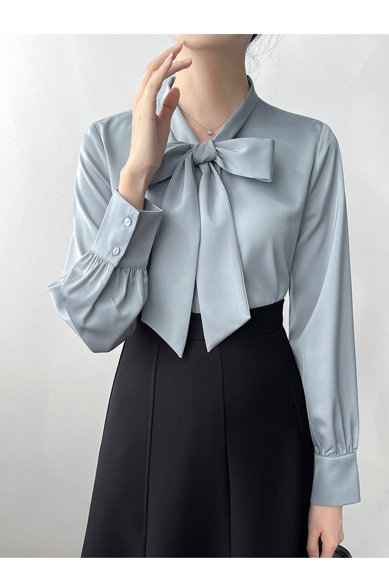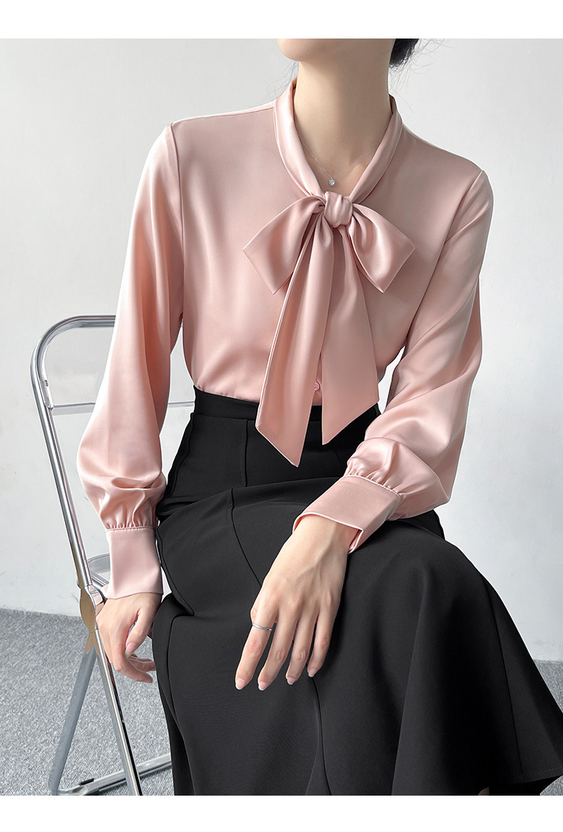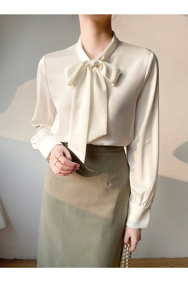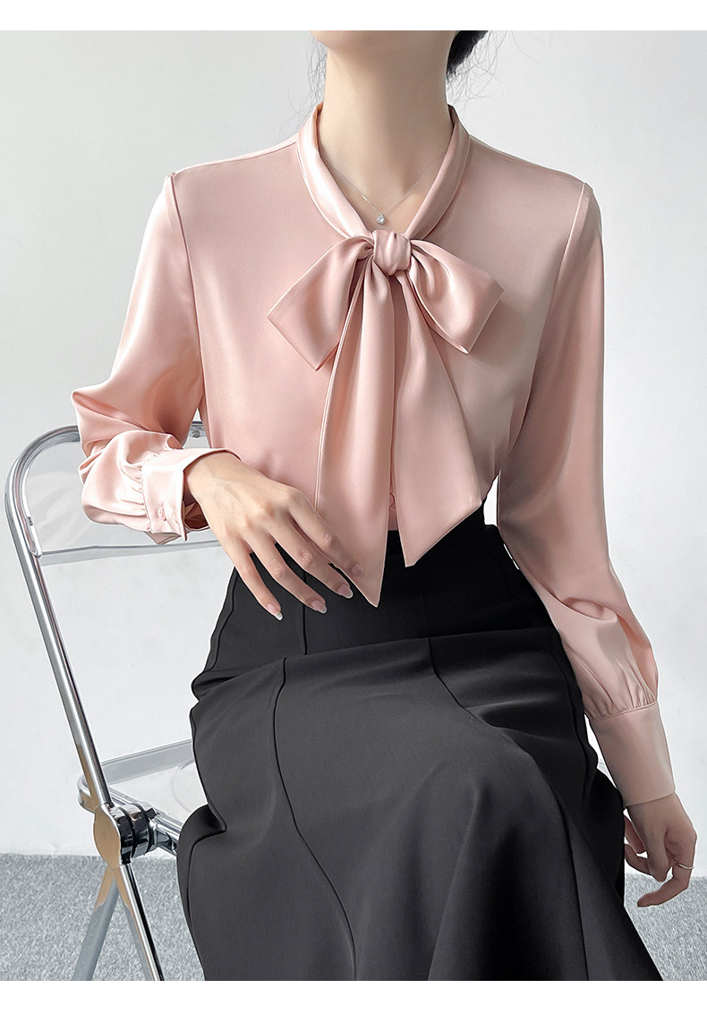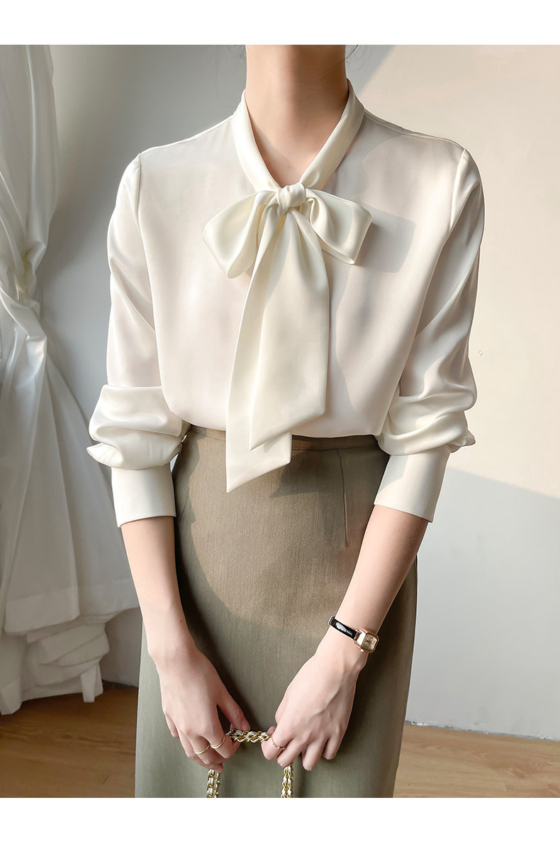 【缎面白色衬衫】春秋长袖通勤职业衬衣 气质蝴蝶结飘带衣柔光缎面