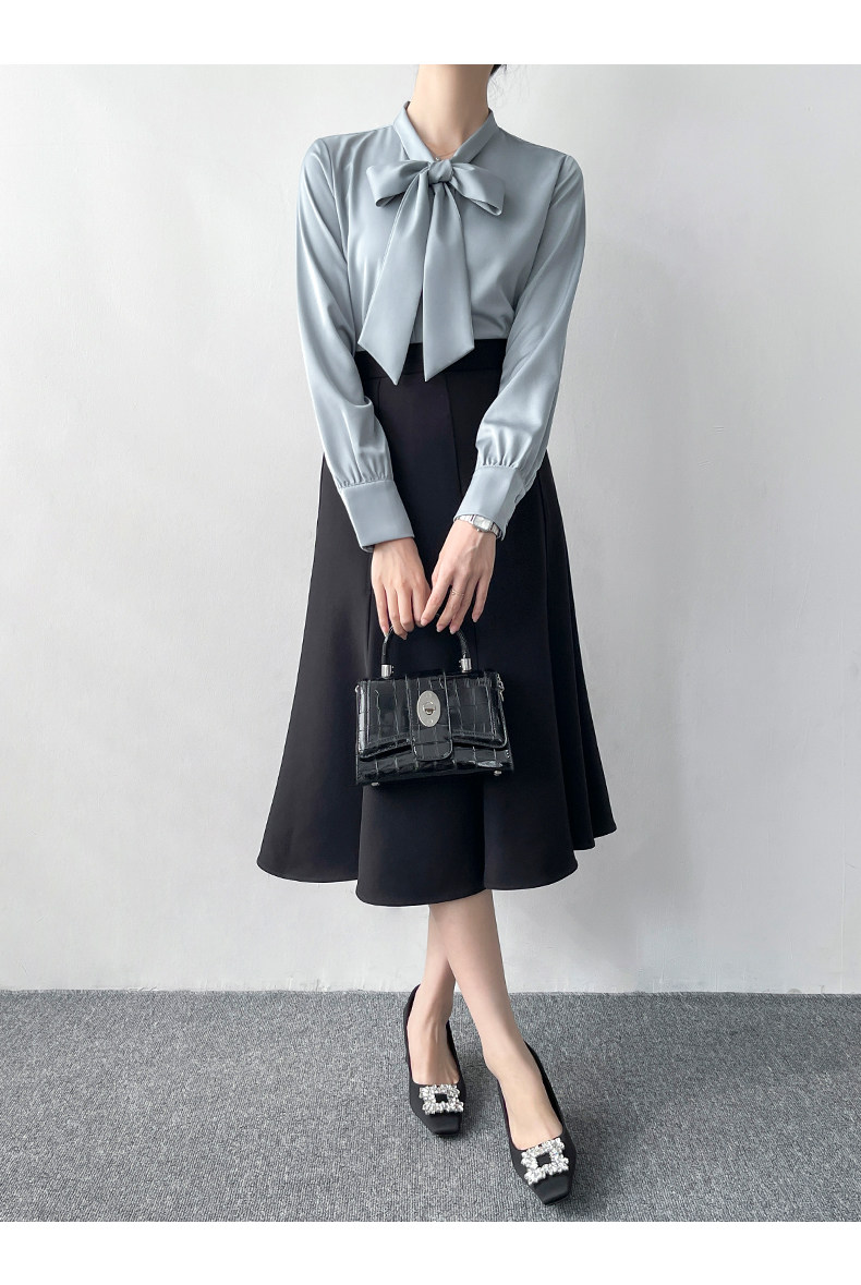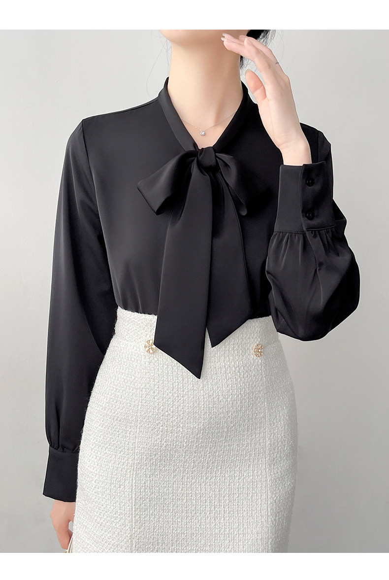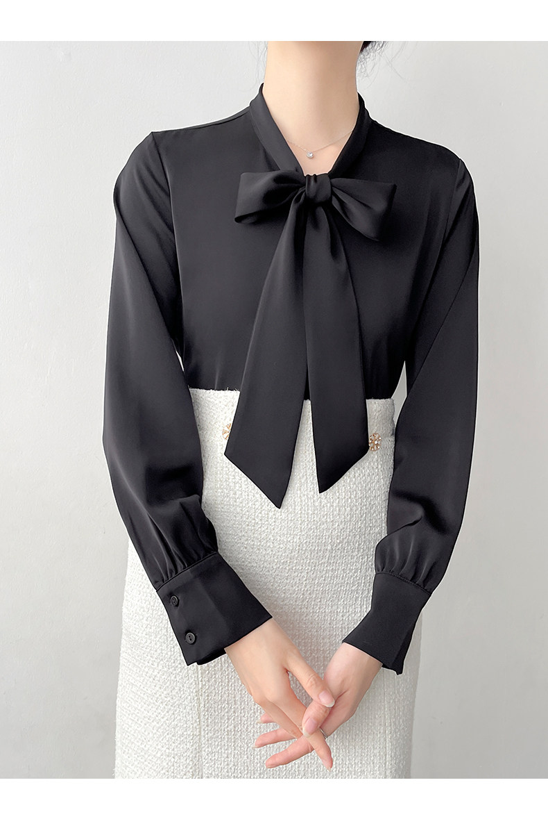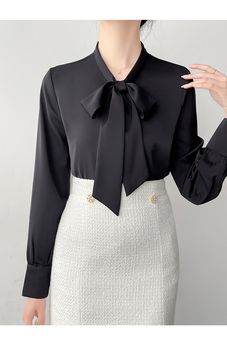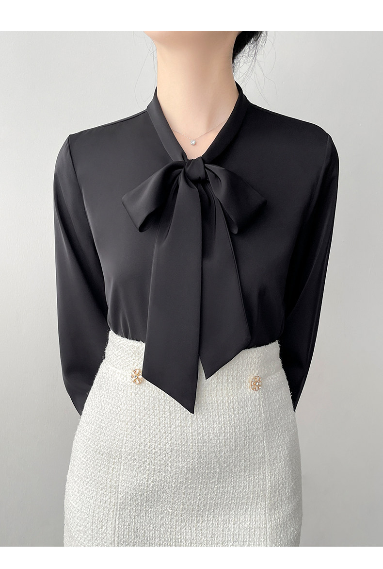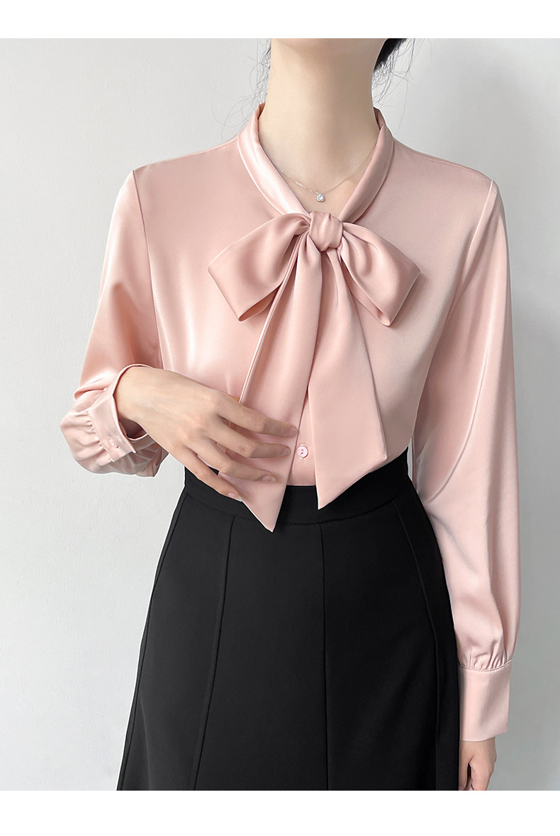 【缎面白色衬衫】春秋长袖通勤职业衬衣 气质蝴蝶结飘带衣柔光缎面