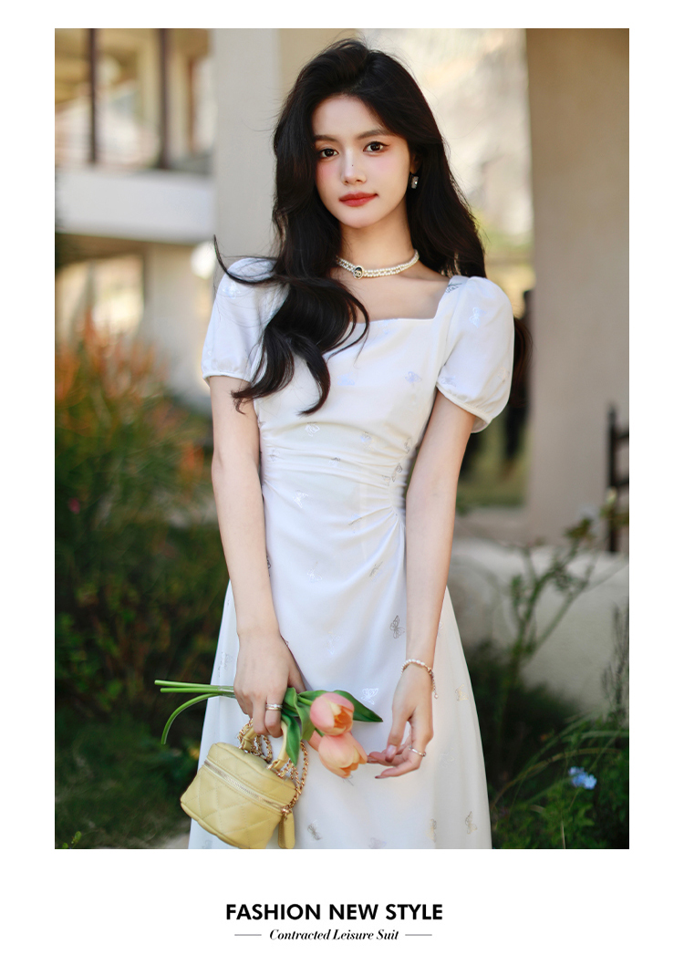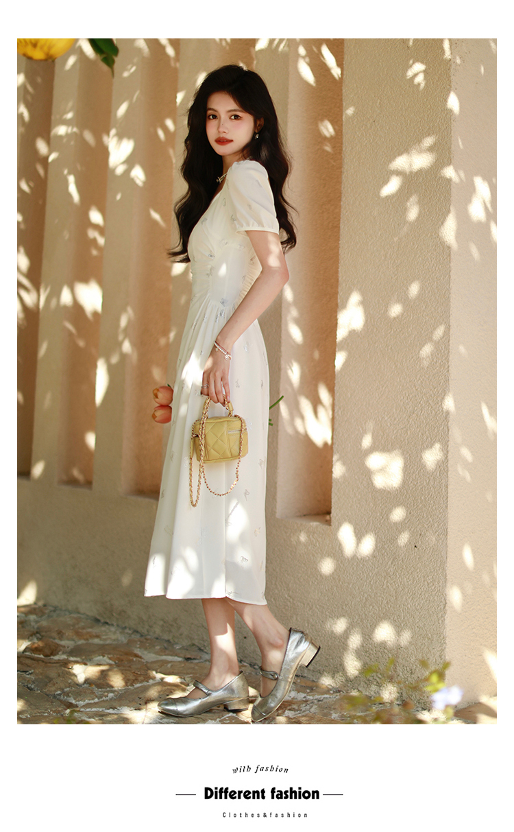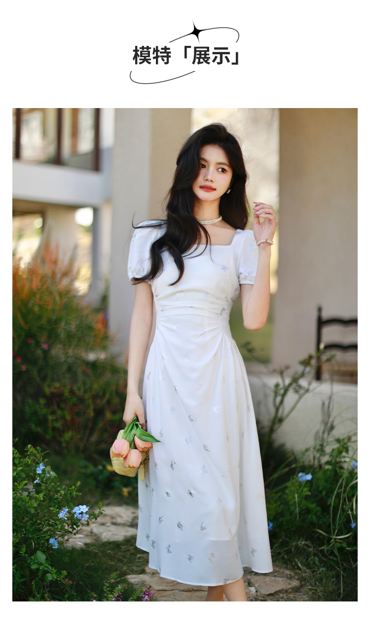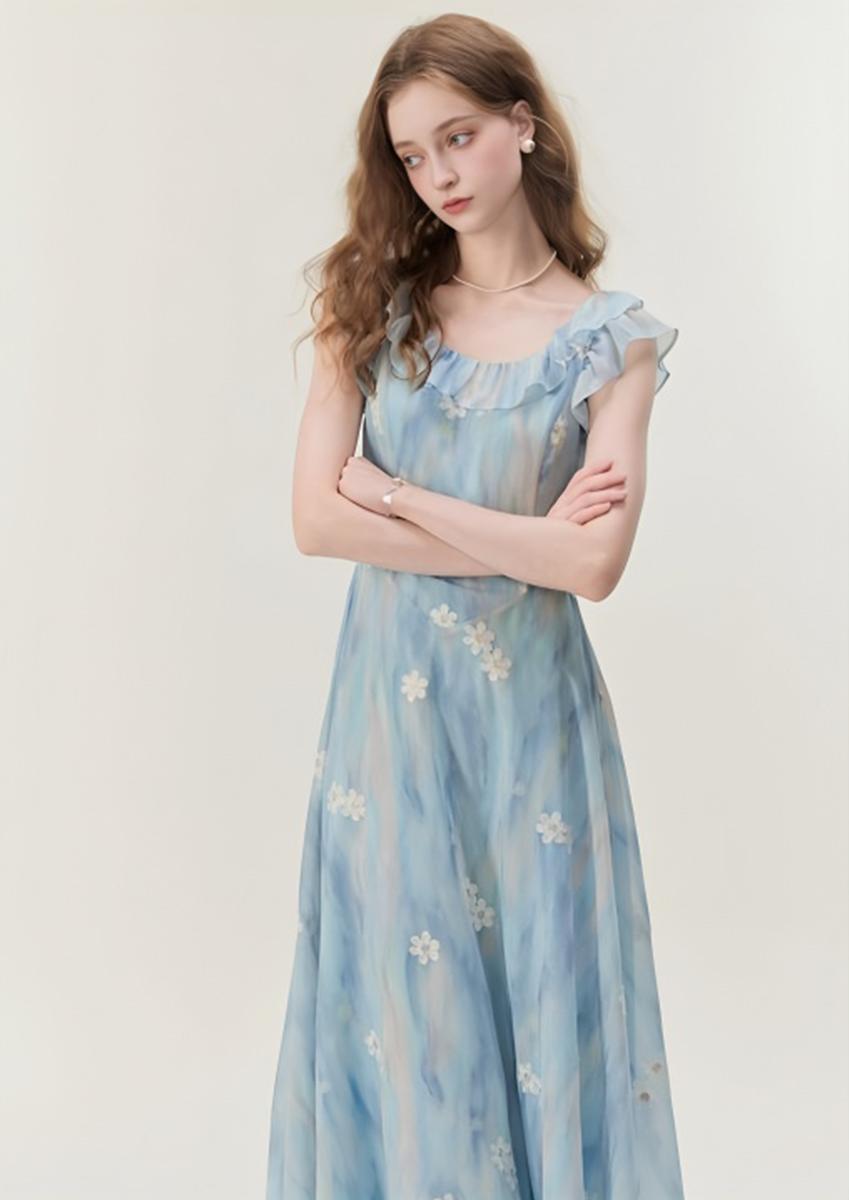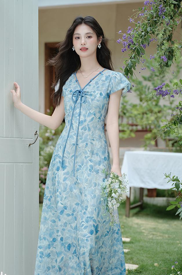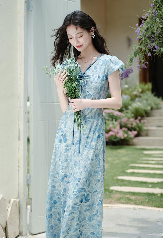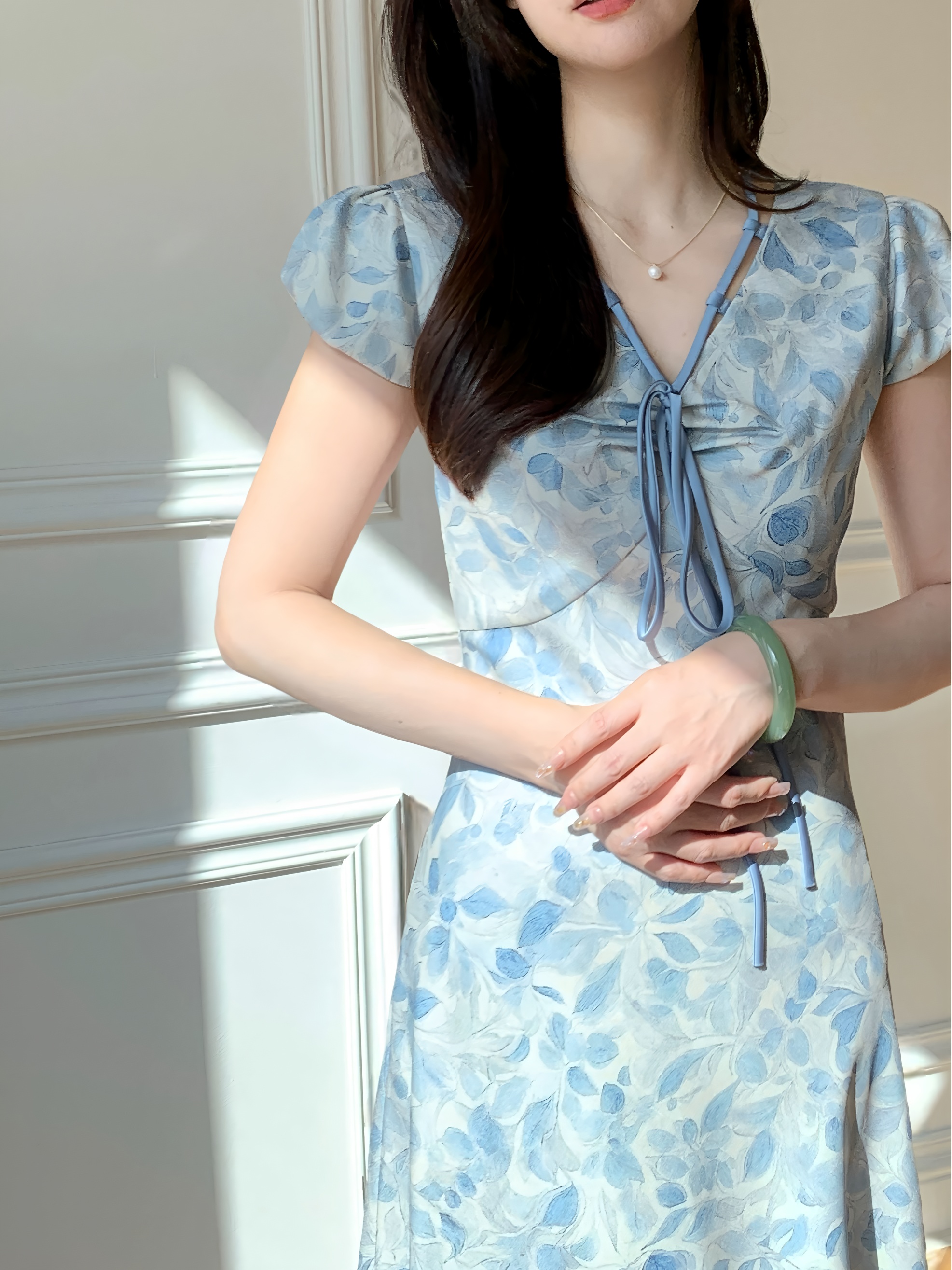 ACUE9060优雅气质显白蓝色印花法式短袖连衣裙-S-2XL-