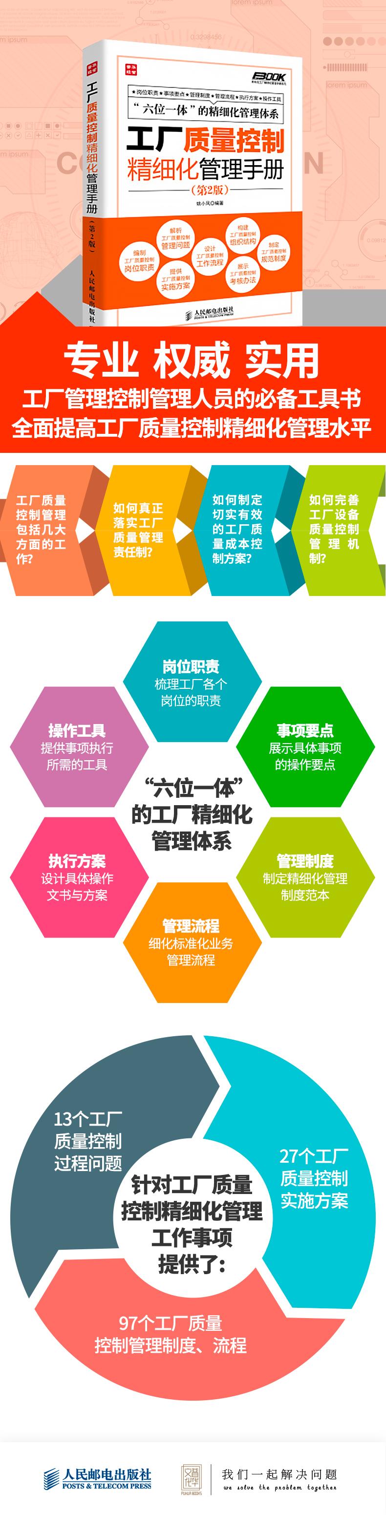 姚小风编著的《工厂质量控制精细化管理手册(第2版)》是一本细化工厂质量管理的指导性图书,作者从职责、要点、制度、流程、方案、工具六大维度出发,详细介绍了工厂质量管理组织设计与质量责任、质量目标与计划、产品设计质量控制、采购质量控制、制程质量控制、仓储质量控制、设备质量控制、外协质量控制、质量检验控制、品管圈活动控制、质量改善控制、质量成本控制、质量管理体系等多个方面的内容,形成了一整套切实可行的工厂质量控制精细化管理体系。本书所提供的内容可以帮助读者有效提升工厂质量管理的水平。