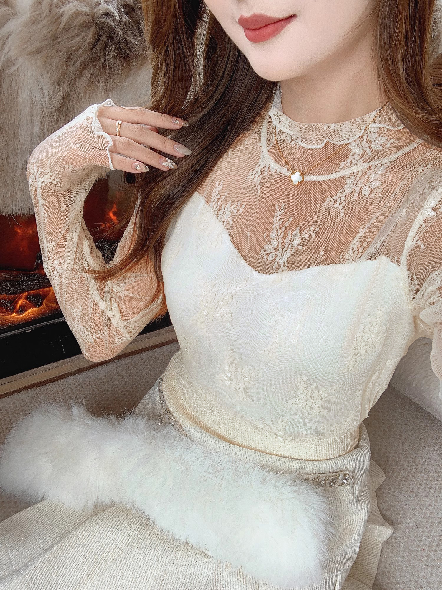 张心子【月光天鹅颈】浪漫透视刺绣网纱拼接打底衫女秋冬新款女装 U2411040