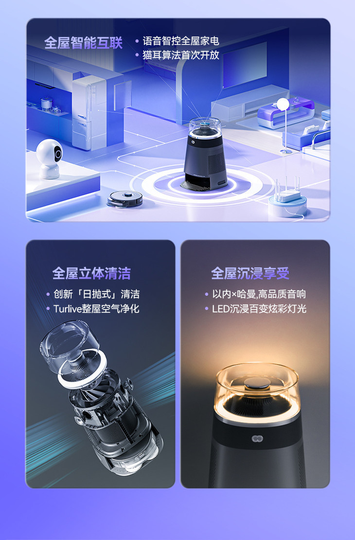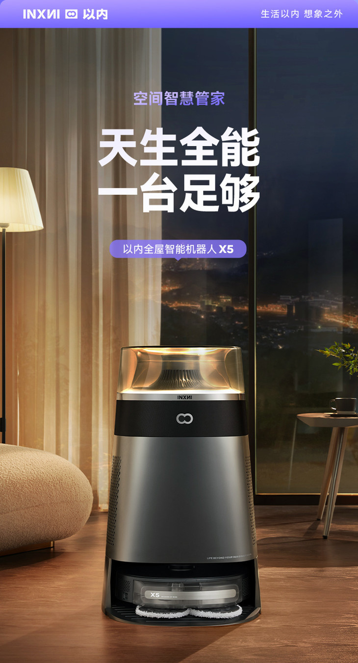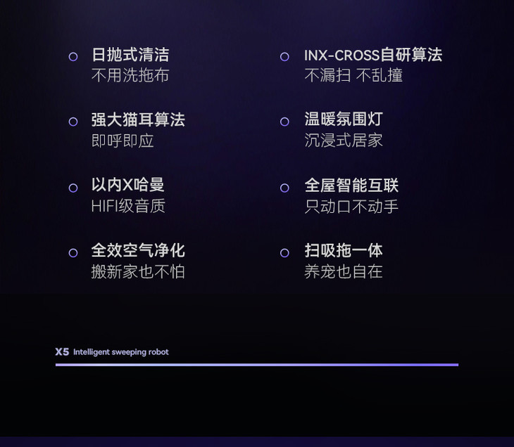 INXNI以内多功能全屋智能机器人X5: ✅INXNI以内首次携手哈曼高定设计,🌟Harman AudioEFX专业调音,成就殿堂级听觉享受! ✅自带LED无极氛围灯,联手艺术设计师,重塑现代家居美学,客厅里的颜值C位,情绪氛围到位! ✅搭载IOT生态,🌈全屋智能中枢系统,可操控所有天猫精灵生态系统,❤️ 真正做到智能家居! ✅2700pa大吸力,150转/分钟高速旋转去污,仿人工10N加压摩擦,双转盘甩走污渍! ✅猫耳算法加持,历经上千次的AI训练,唤醒清晰;💦400万曲目内容库,海量音频任君选! ✅采用Turlive空气净化技术,使用离心风轮推送垂直气流,实现整屋空气高效循环净化! ✅选用东丽H13级 HEPA,稳定、高效,有效过滤10种污染物,仅需8min,室内空气焕然一新! ✅日抛式清洁设计,告别基站陷阱,拖布用完即抛,无需上下水,无需清洁,拖布环保可降解! ✅3档水量调节,应对不同地面的清洁需求;扫吸拖三合一体,前扫中吸后拖,全屋走一遍即干净! ✅机身搭载LDS激光雷达导航系统,走的准、躲得开、不乱撞、不怕黑;智能地图,可自由设定禁区 ✅超长续航,搭载4390mAh大容量电池,续航清扫时间高达180min,清洁面积约为200㎡的家庭空间