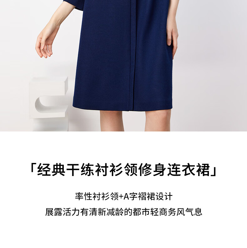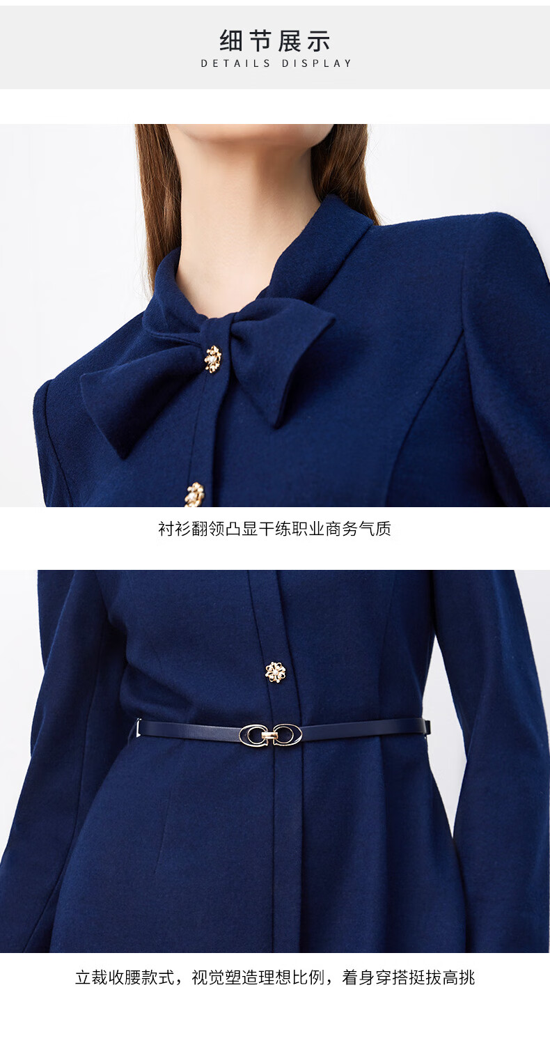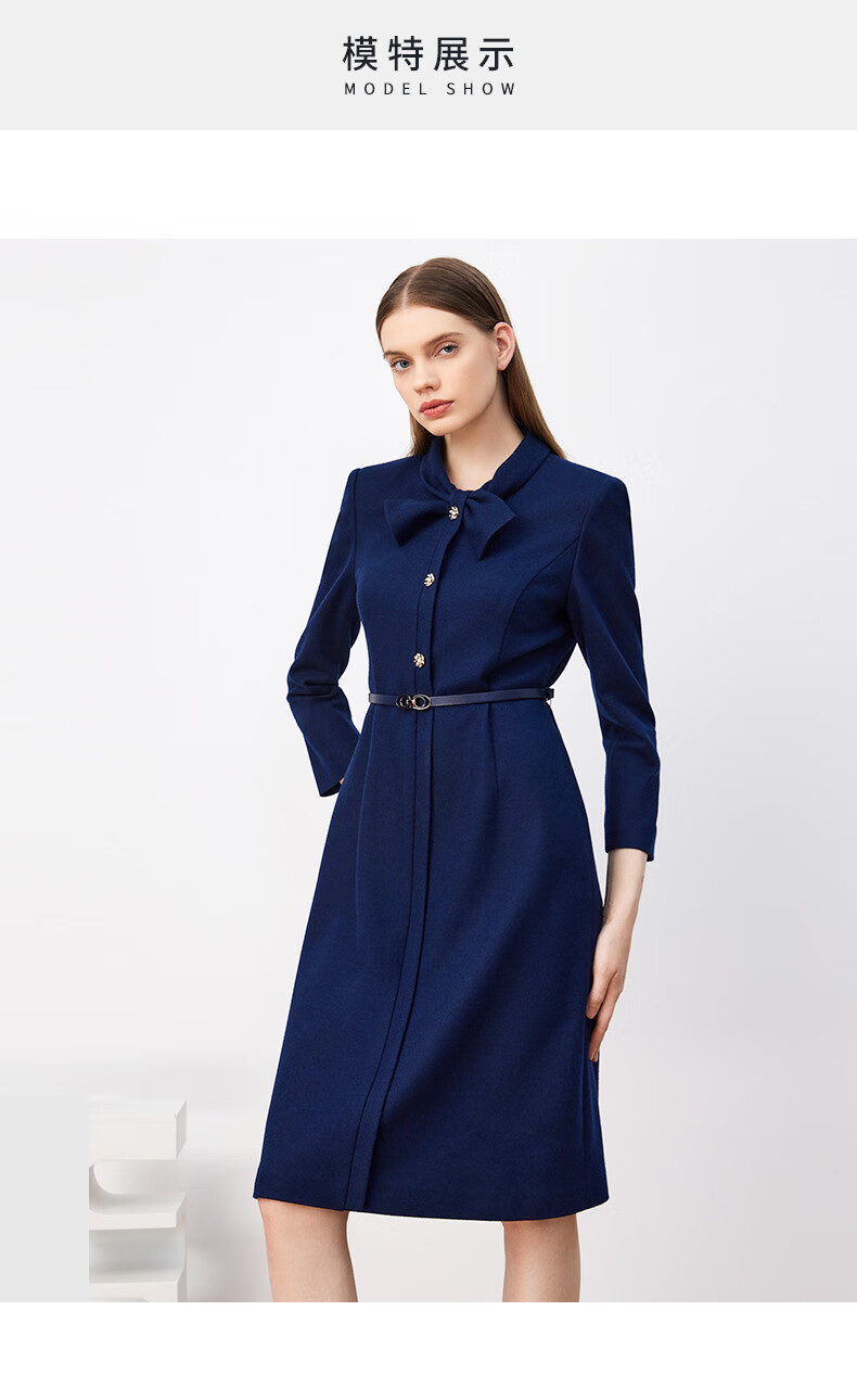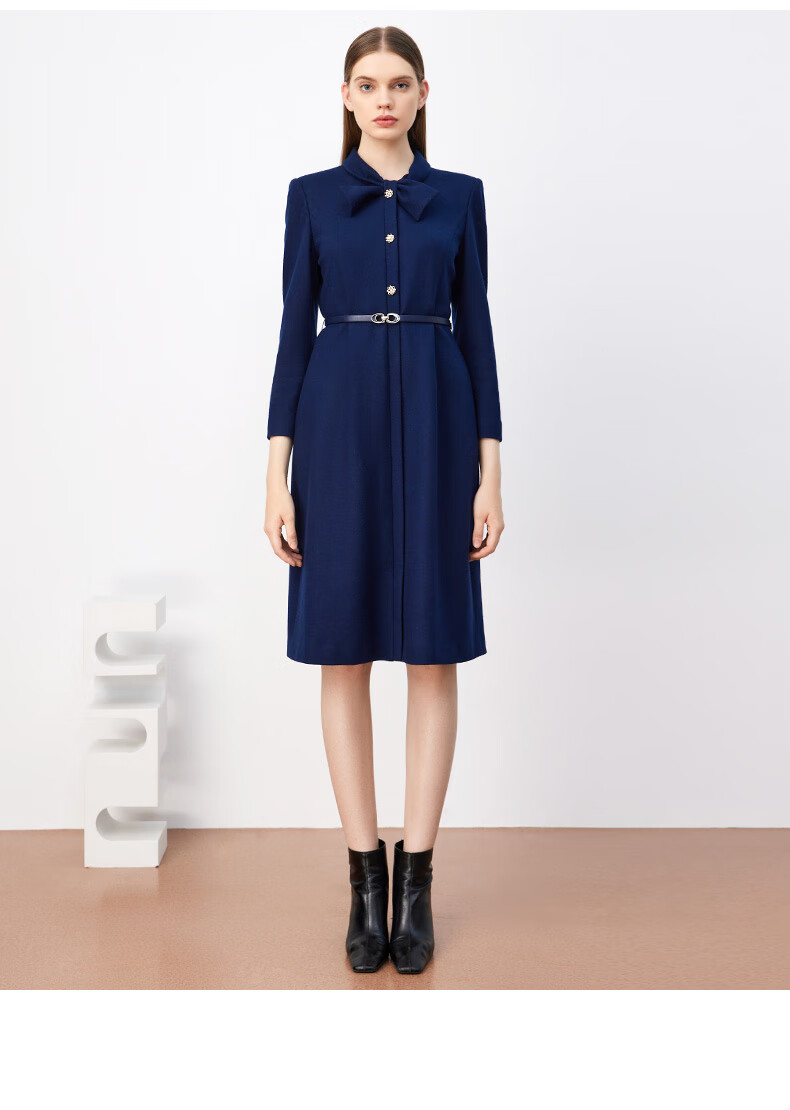 皮尔卡丹女装连衣裙秋冬蓝色长袖长款端庄气质羊毛裙P3410E3933N0
