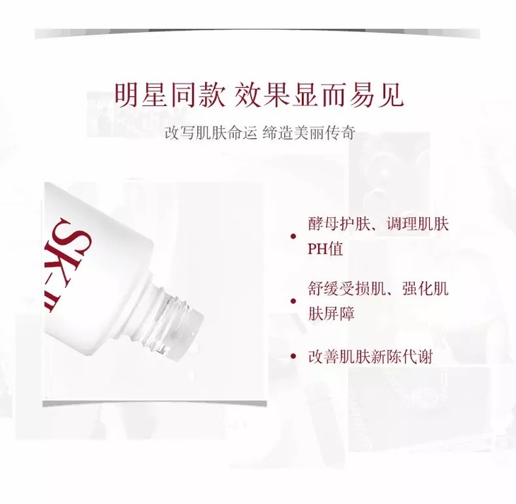 3、功效:如果你没有用过神仙水,就等于没有没有用过SKII。“28年,承诺不变;28天,肌肤焕变”。皮肤细腻度和通透度都可以看到改善,谁用谁知道,sk2神仙水,适合所有肤质~