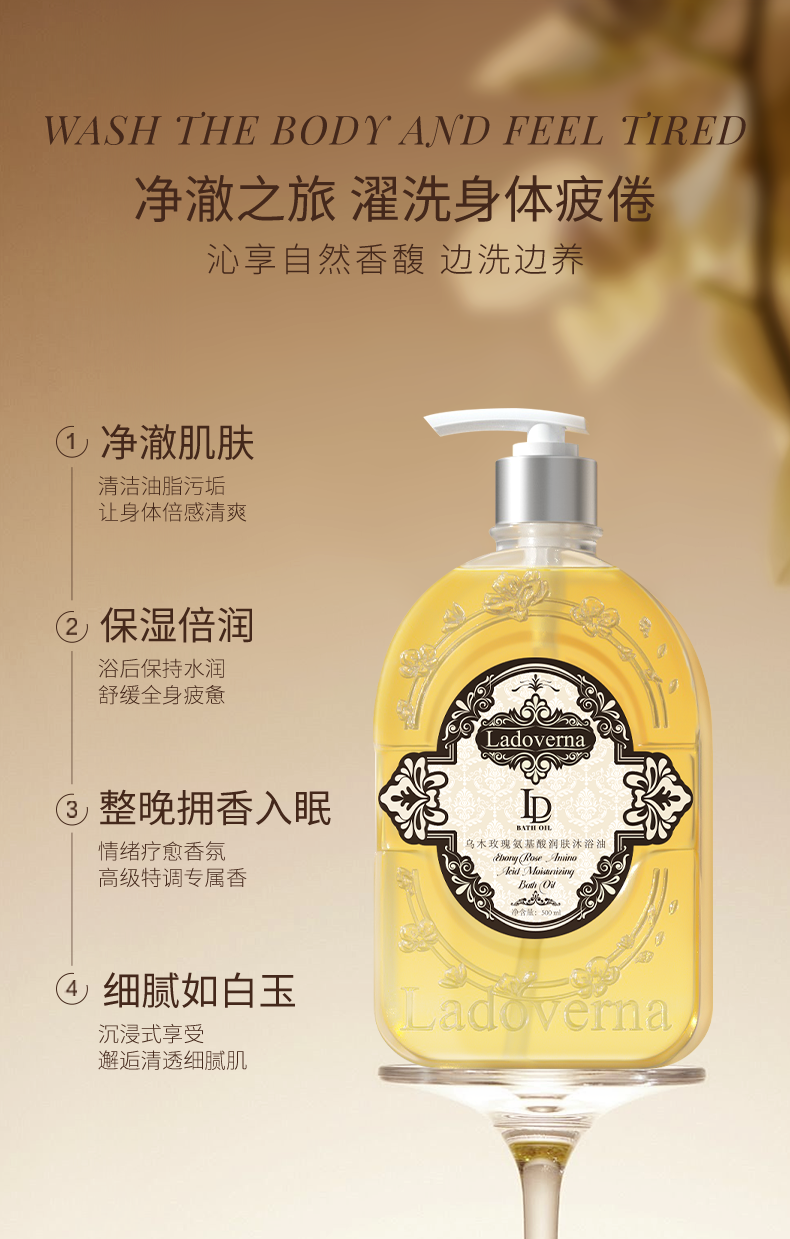 【两瓶装】Ladoverna沐浴油,天然椰子油提取物养肤嫩肤,遇水秒乳化泡沫丰富好冲洗,经典特调乌木玫瑰香调,SPA级沐浴体验1000ml
