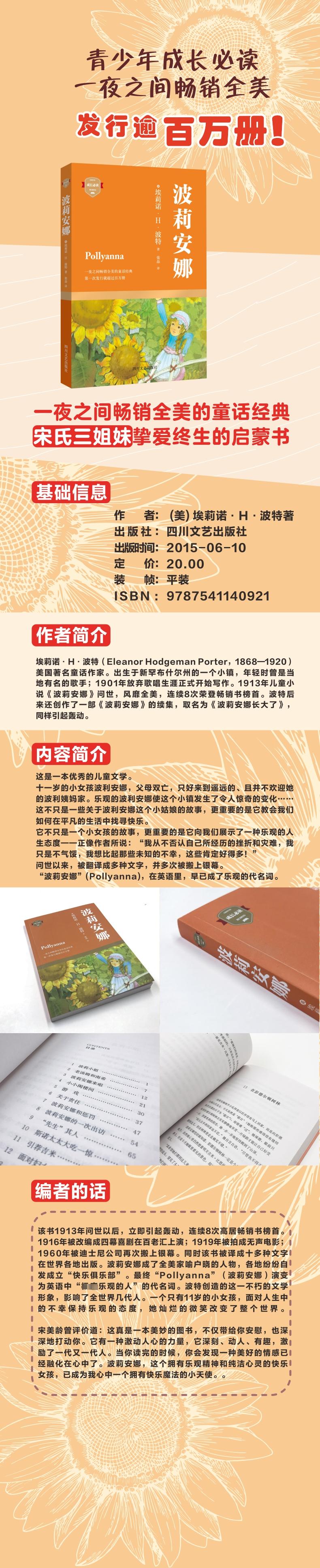 美国著名童话作家埃莉诺?H?波特拥有代表性的作品《波莉安娜》。一夜之间畅销全美一第一次发行就超过百万册!