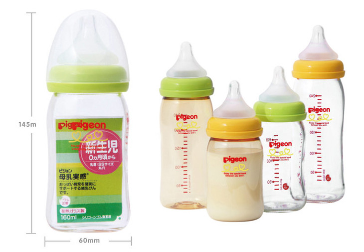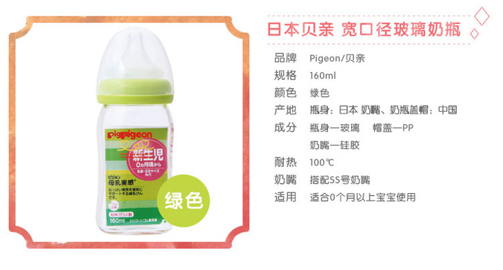 【一般贸易】【精品推荐】日本原装进口贝亲Pigeon耐热玻璃阔口奶瓶绿色 160ml(绿色)
