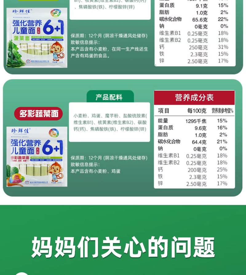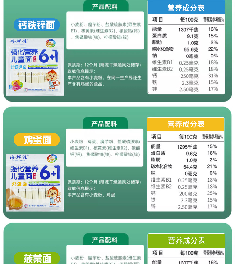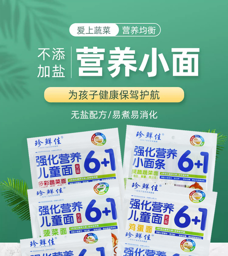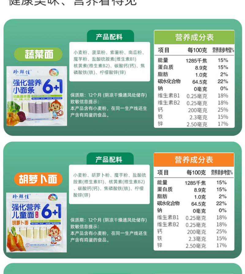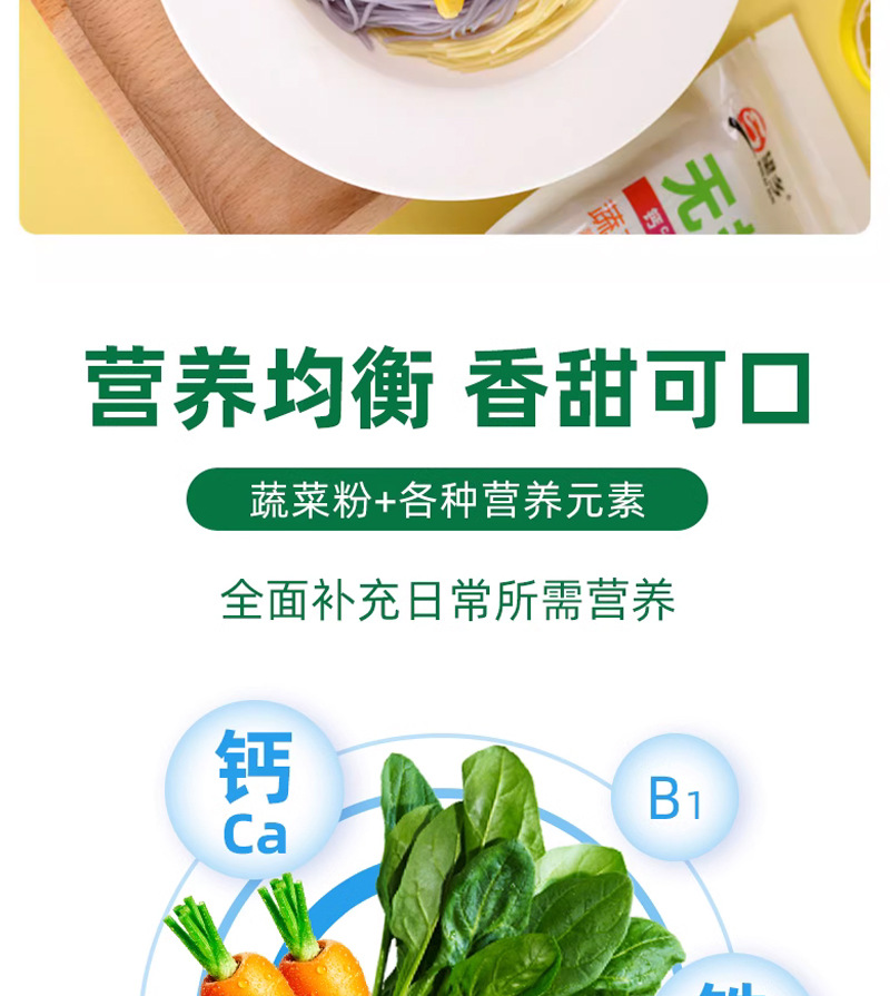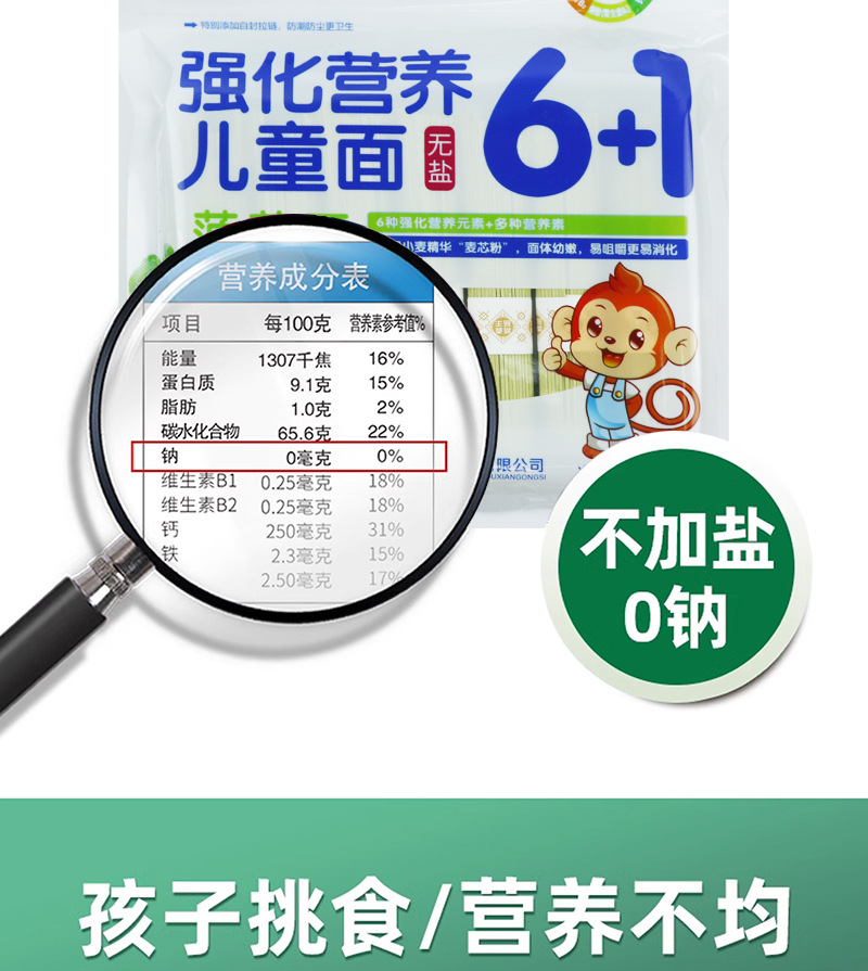 强化营养6+1儿童小面条,6种元素;钙、铁、锌、维生素B1、维生素B2、(烟酸维生素B3),无盐配方、无香精、无色素、无防腐剂、健