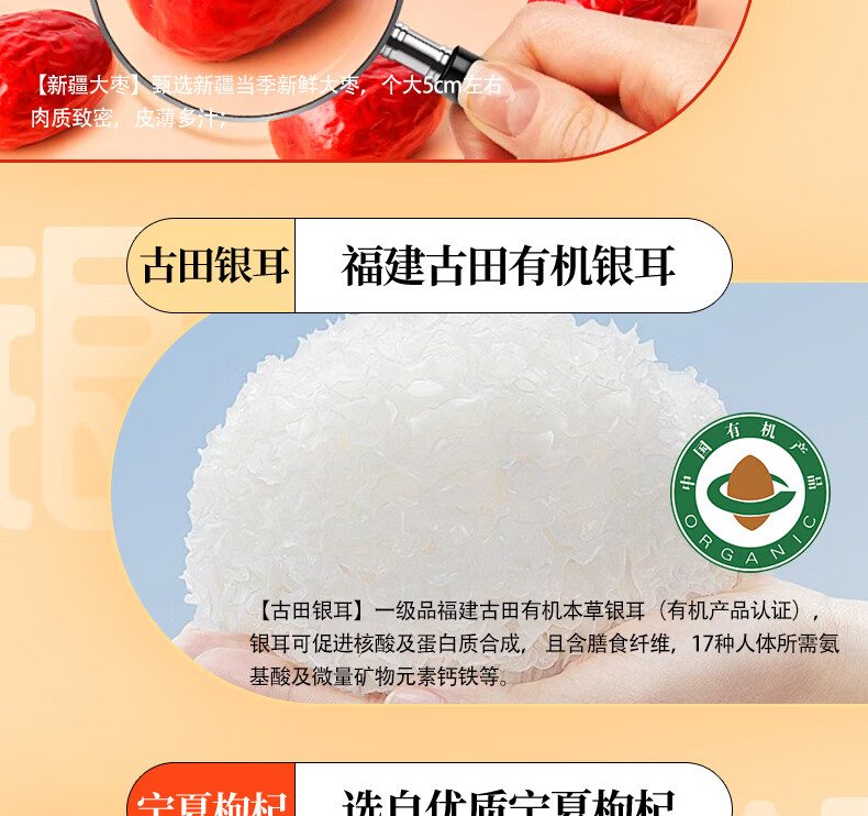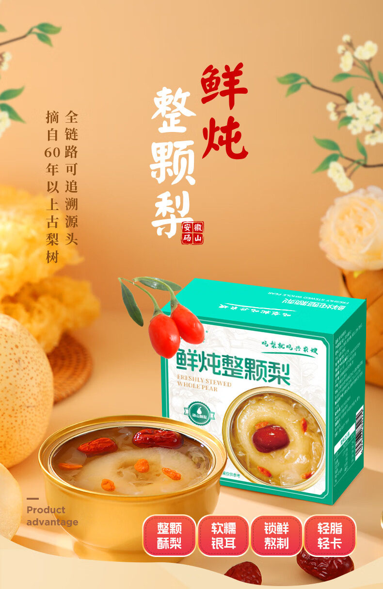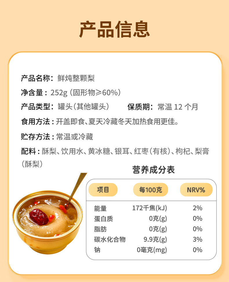 鲜炖整颗梨,11碗装,甄选地标美食砀山酥梨,新疆有机大枣、宁夏有机枸杞,福建有机银耳,工艺上炖到火候了,梨香味扑鼻,汤汁清澈拉丝,营养丰富,解馋好吃,常温保存开罐即食,送人有新意M