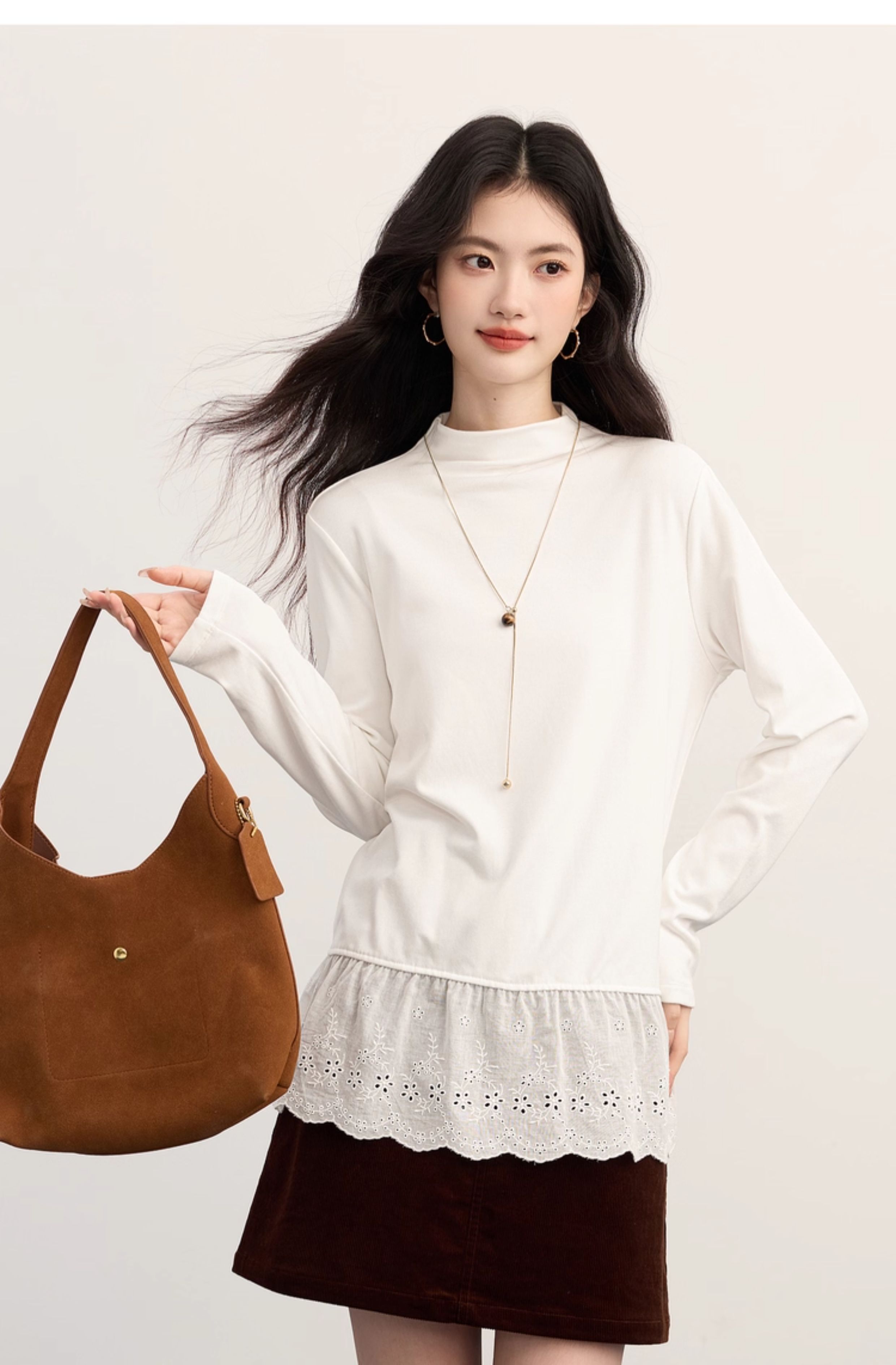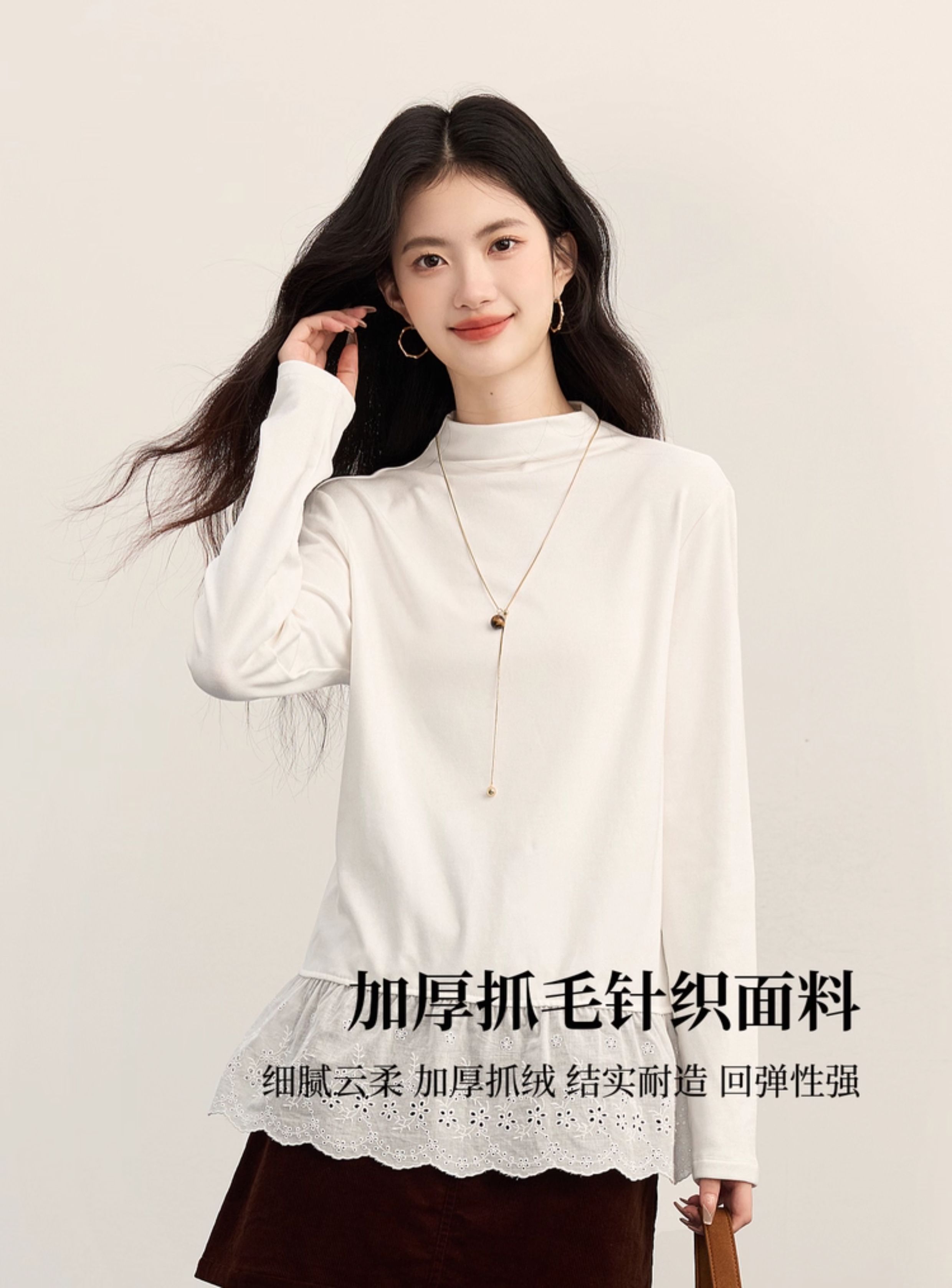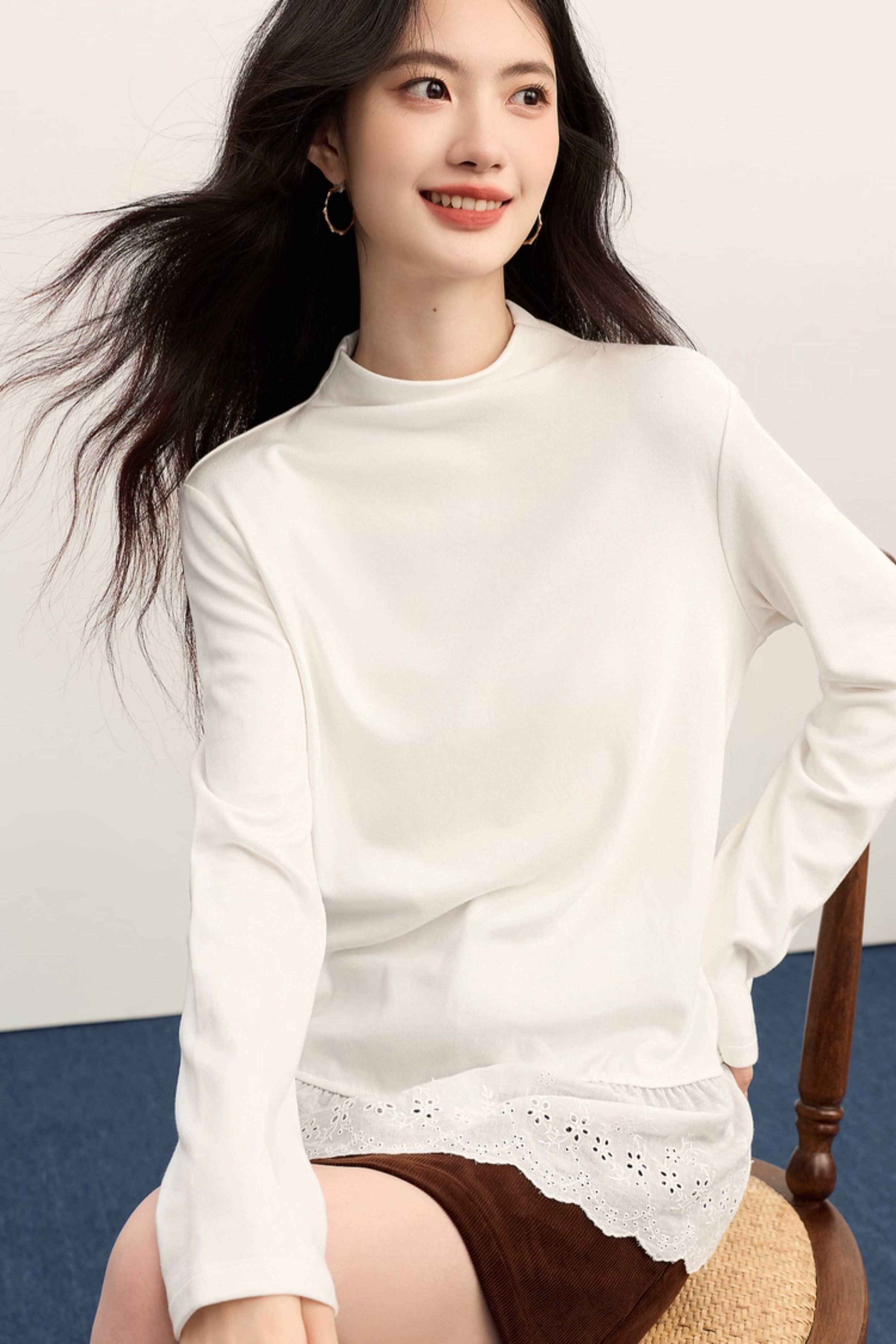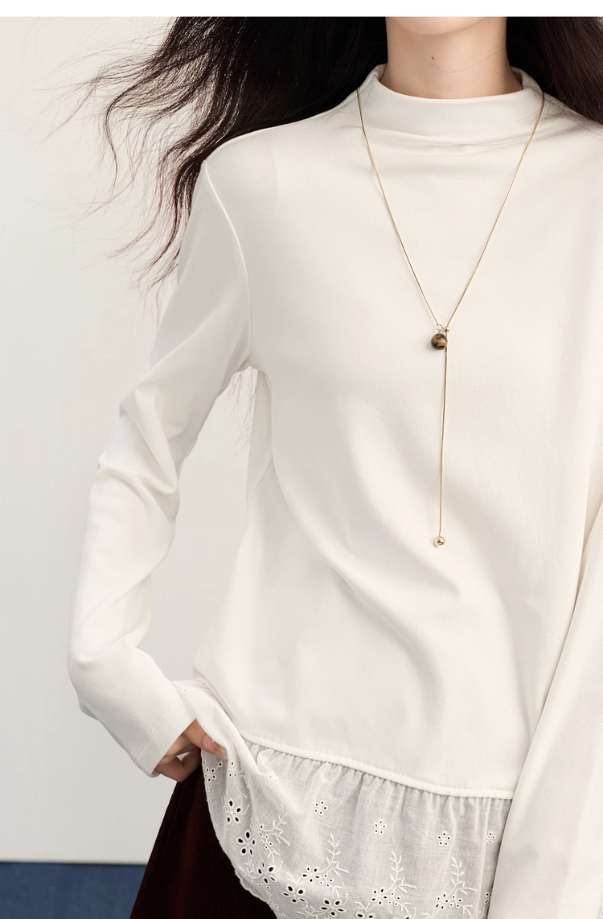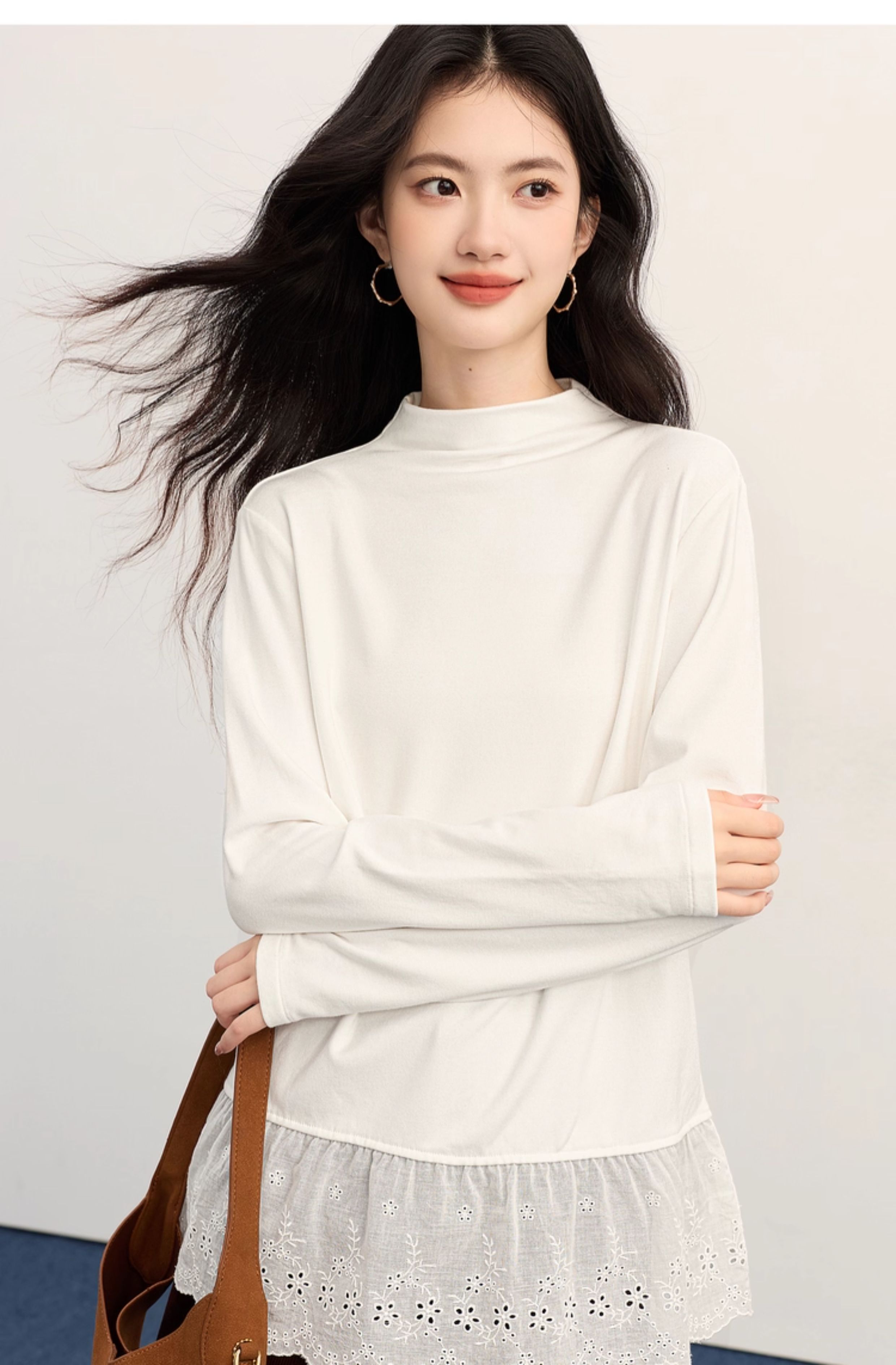 【11/5新品】熙世界假两件蕾丝边拼接内搭半高领白色T恤打底衫女2025秋冬新款