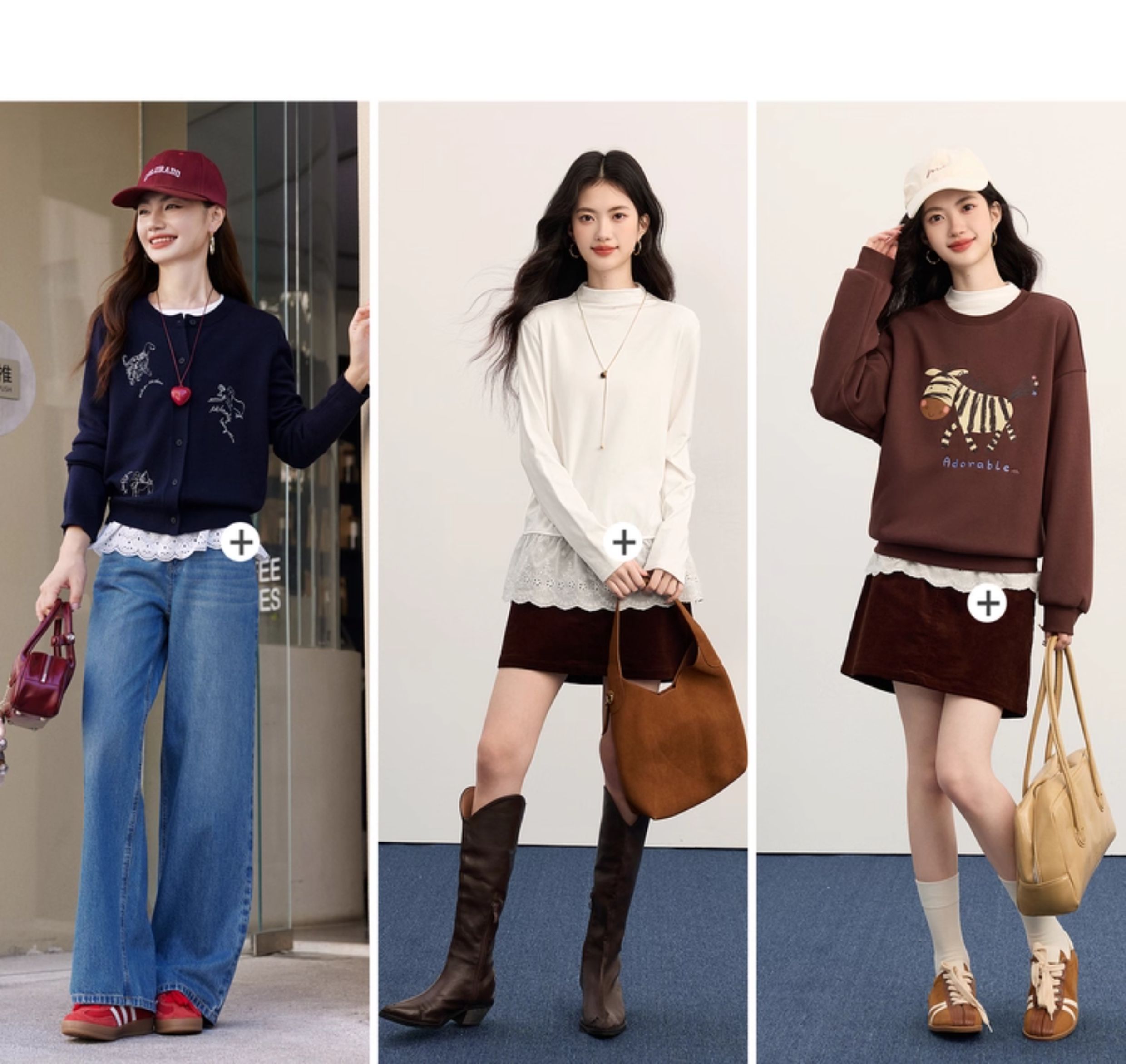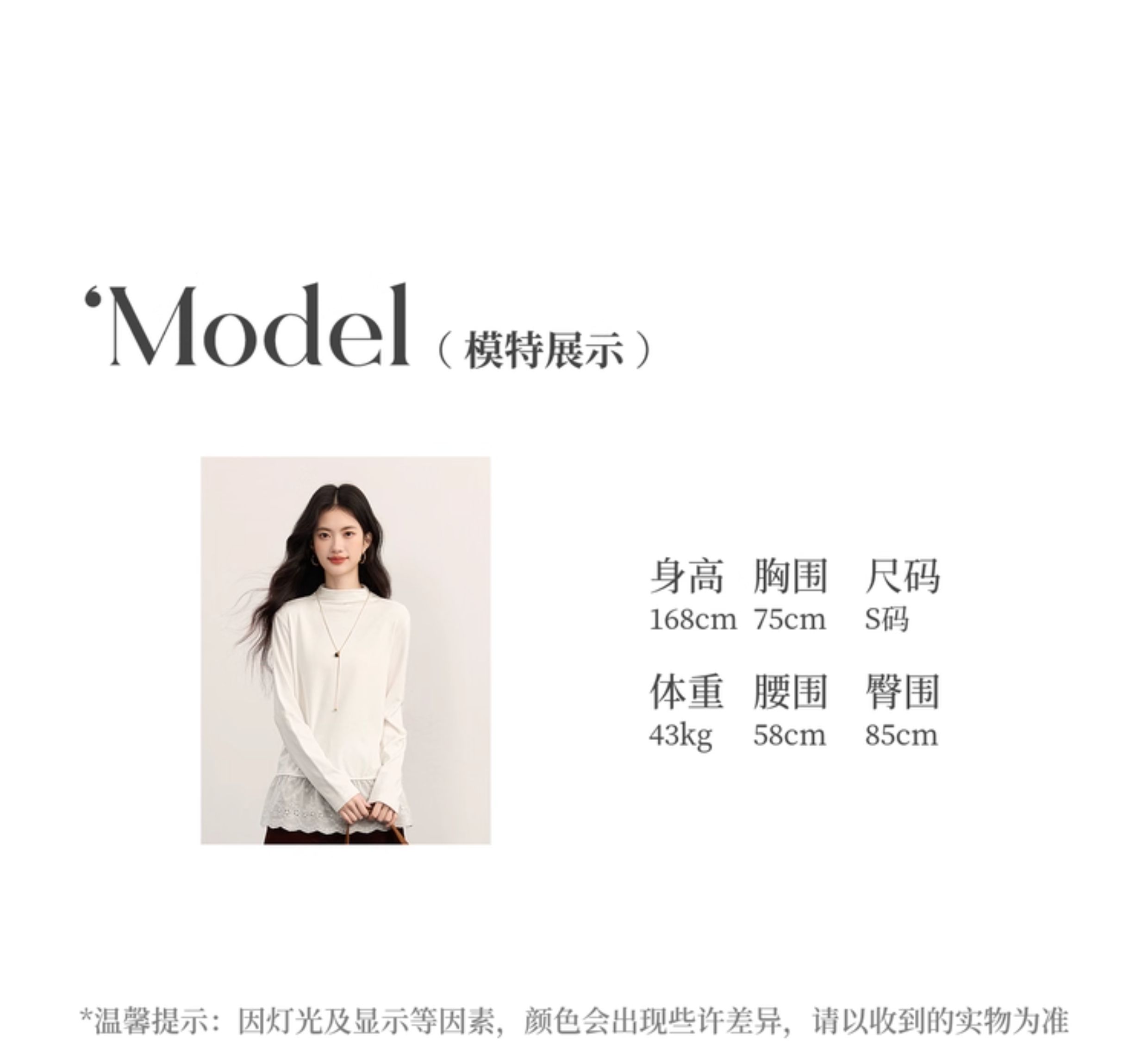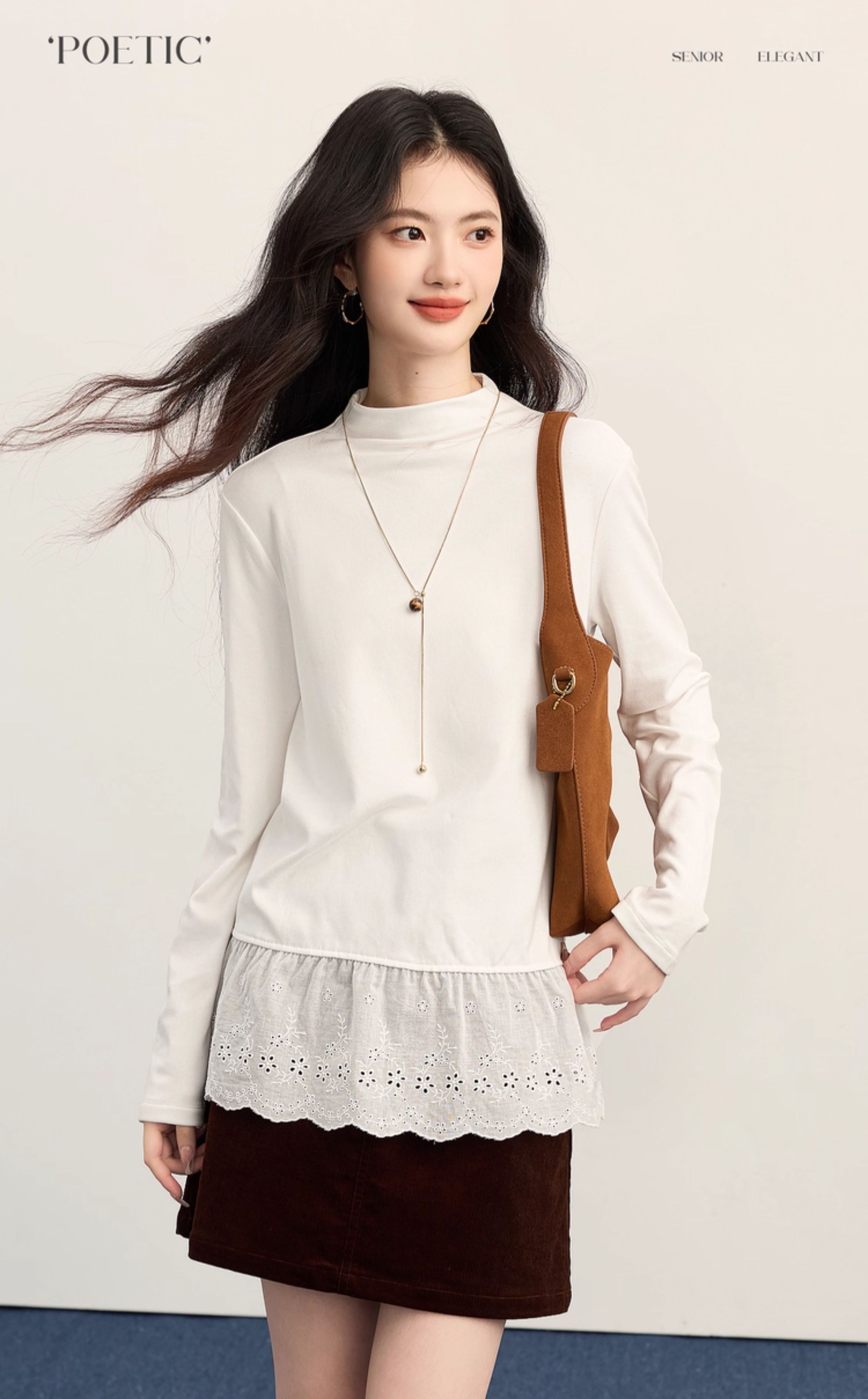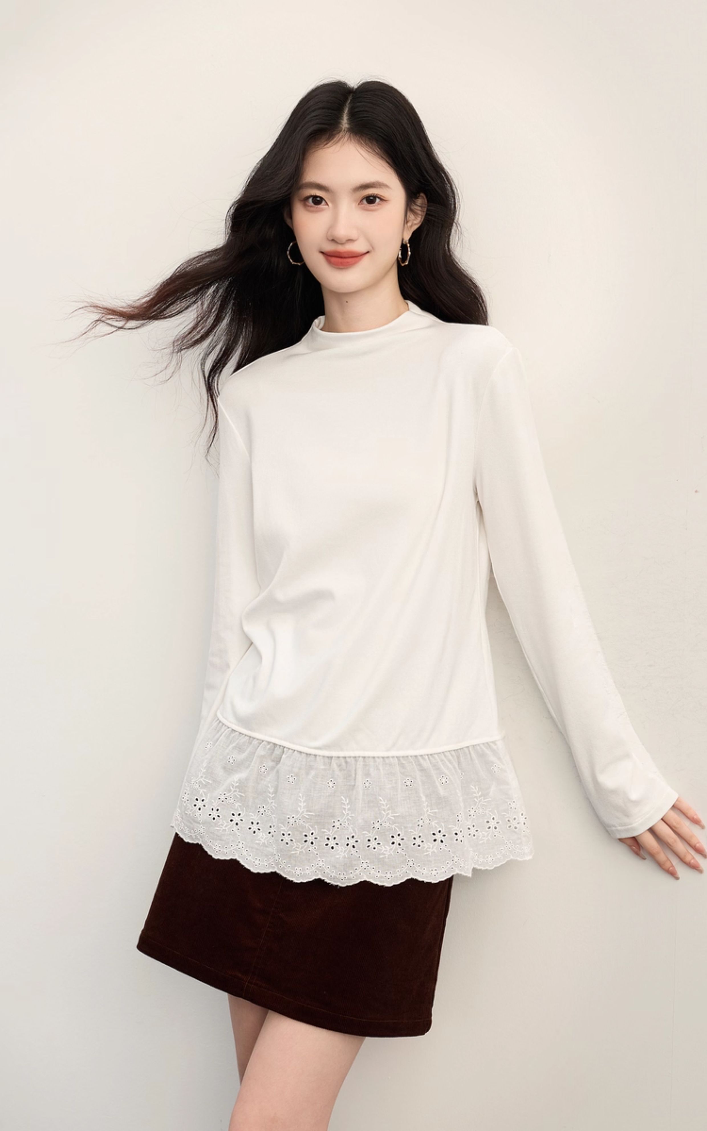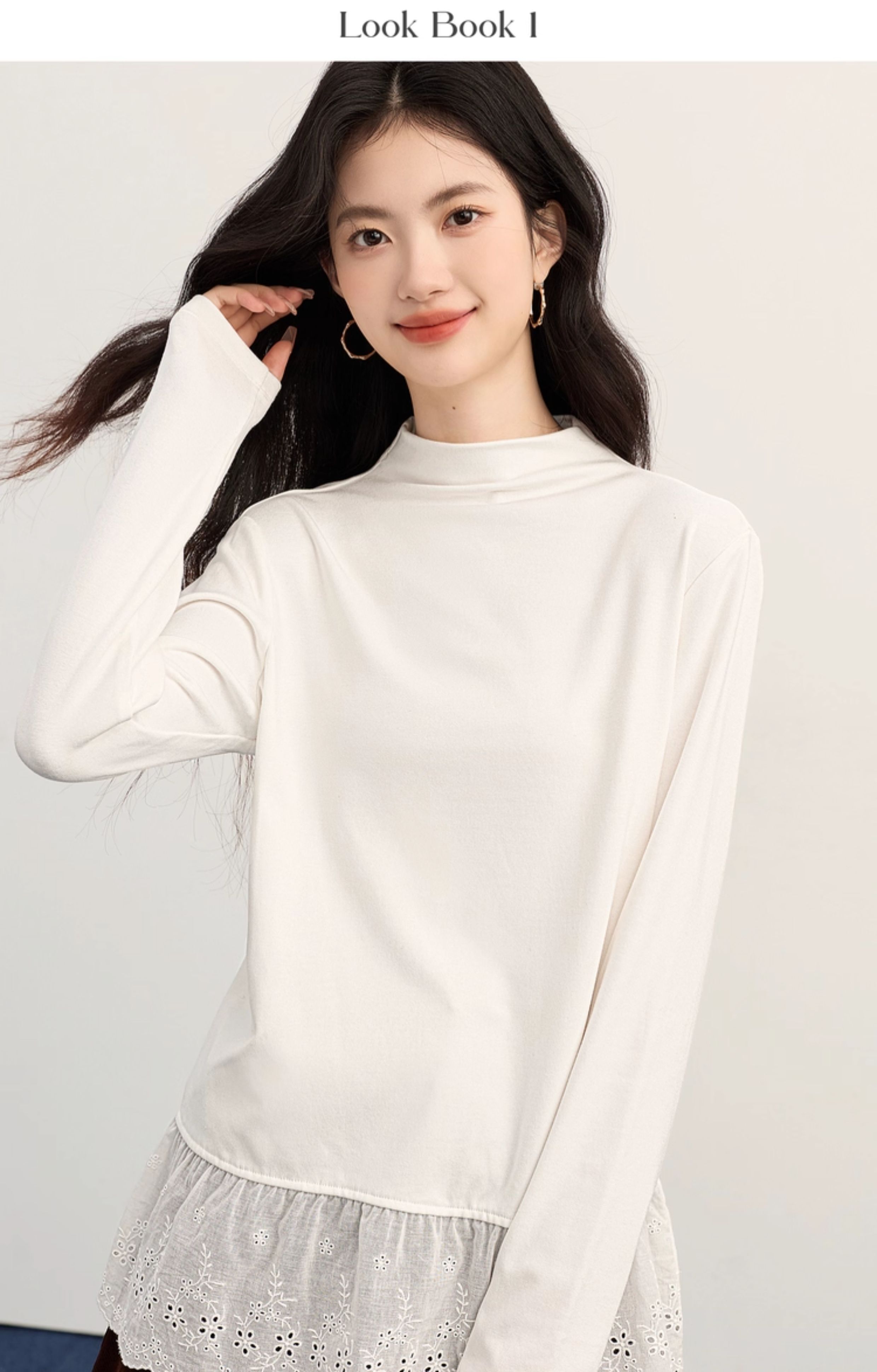 【11/5新品】熙世界假两件蕾丝边拼接内搭半高领白色T恤打底衫女2025秋冬新款