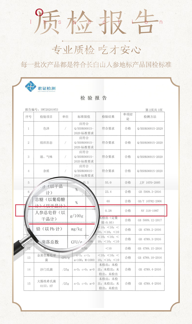 1.原料:人参(人工种植 ≤5年)、蜂蜜;配料表非常干净、只有人参和蜂蜜,不添加防腐剂、不含色素、不含香精;