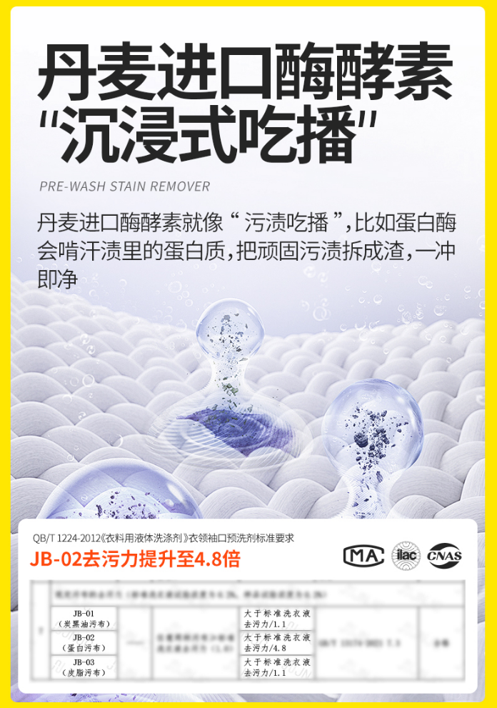 二:丹麦进口酶酵素,精准靶向分解,告别粗放式搓洗我们善待衣物,更追求精准护理。产品核心的进口酶酵素,是名副其实的“污渍分解师”。它用“生物催化”代替“物理摩擦”,在静置间无声地将顽固污渍分解为水溶小分子,把顽固污渍拆成渣,一冲就跑!从此娇贵面料和心爱衣物再无搓洗磨损的担忧。