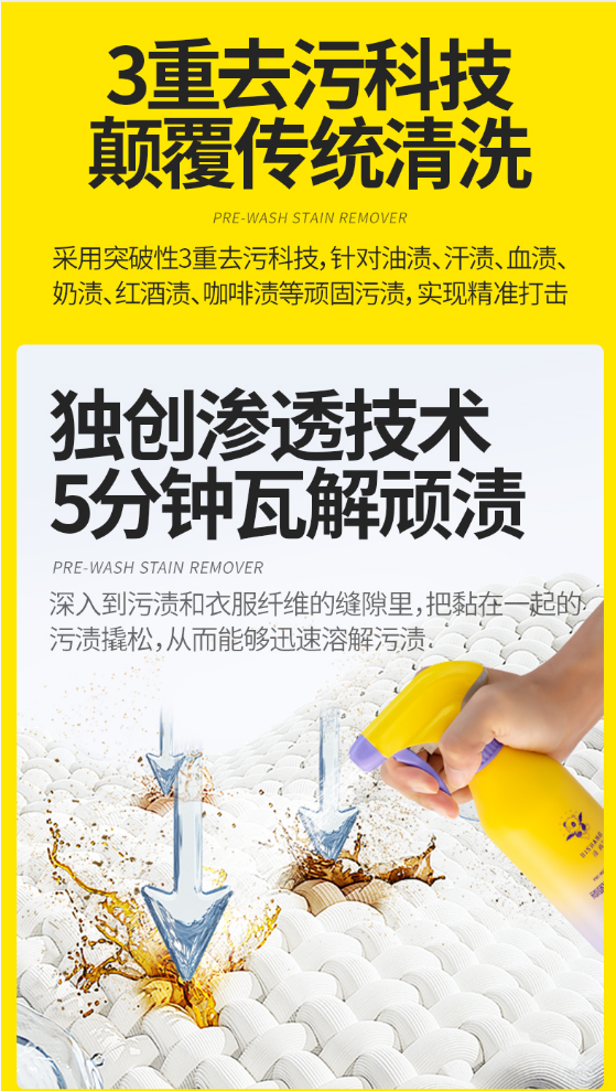 一:渗透技术、高活性含量,分秒必争,强效去除各类难洗污渍时间是最奢侈的成本。涤尚的活性物浓度近乎普通标准的三倍,这意味着更强悍的初始清洁力。喷上的瞬间,速洁因子便如智能磁吸微粒,迅速锁定污渍并将其从纤维上剥离。渗透技会像“液体小钻头”,钻到污渍和衣服纤维的缝隙里,把黏在一起的污渍撬松术。5分钟后你只要轻轻一搓,污渍就垮掉啦!