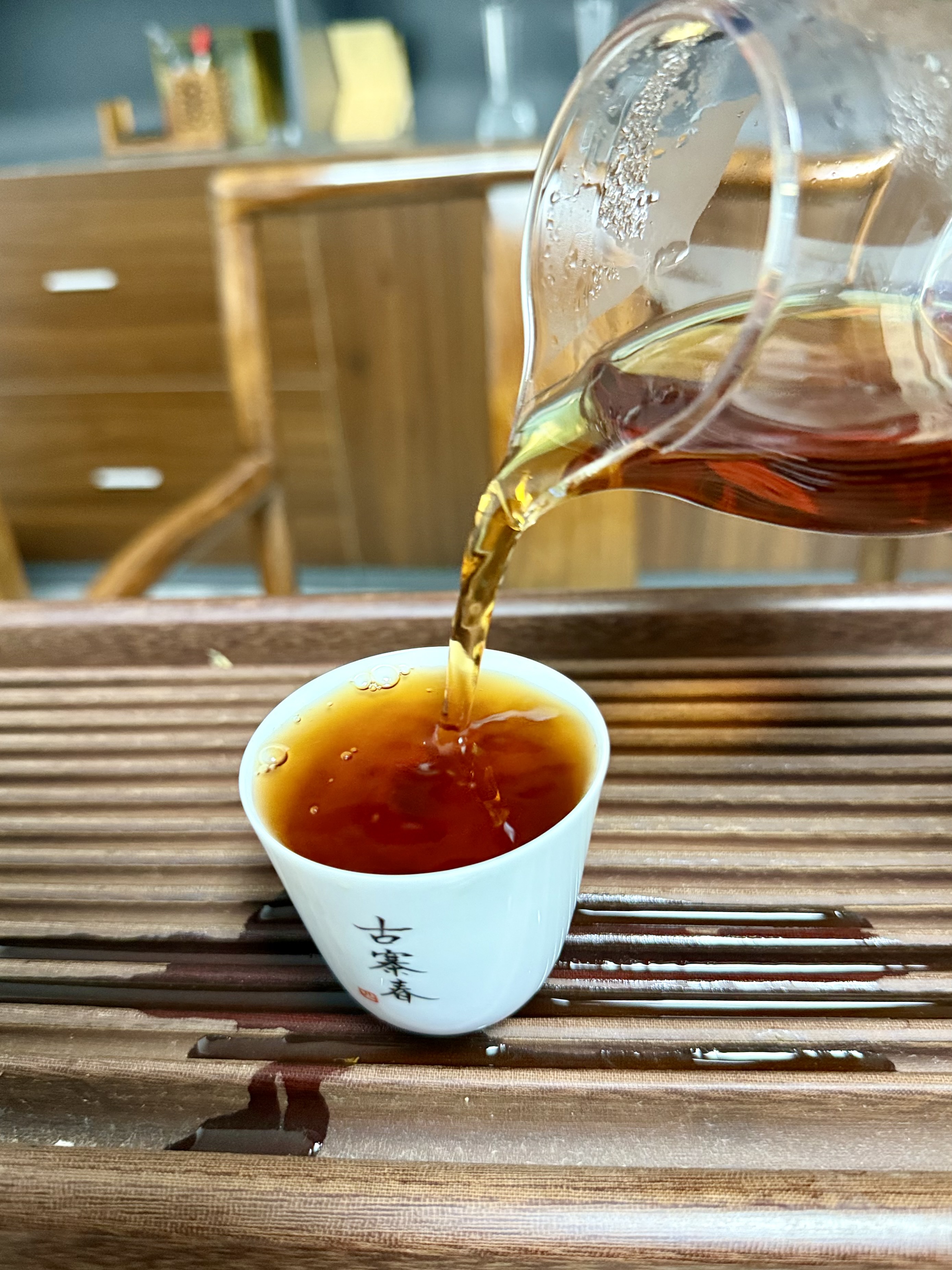 本品昔归熟茶,鲜活灵动,遒劲有力,香气表现馥雅而丰富,有醇厚的谷物香和清新的甜香,杯底是馥郁的桂圆香,茶汤入口甜滑细腻汤质饱满,如巧克力般浓醇细滑骨架清晰而又不失丰腴饱满茶汤包裹成团,协调性极佳活性十足,有生茶一般的回甘与生津茶气充沛,全身温暖舒润,轻汗微出韵幽气长,回味不绝,身心舒展。