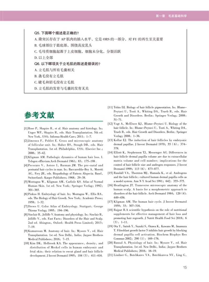 第一篇介绍成为一名出色的毛发移植外科医生所需的基础知识,包括毛发基础科学、脱发的诊断和鉴别诊断、诊断所需使用的工具、脱发的药物治疗(包括非那雄胺、米诺地尔和其他药物治疗),以及营养支持等相关内容。本篇末尾还介绍了毛发移植手术过程中紧急情况的诊断和管理,以及如何创建一家毛发移植诊所等内容。