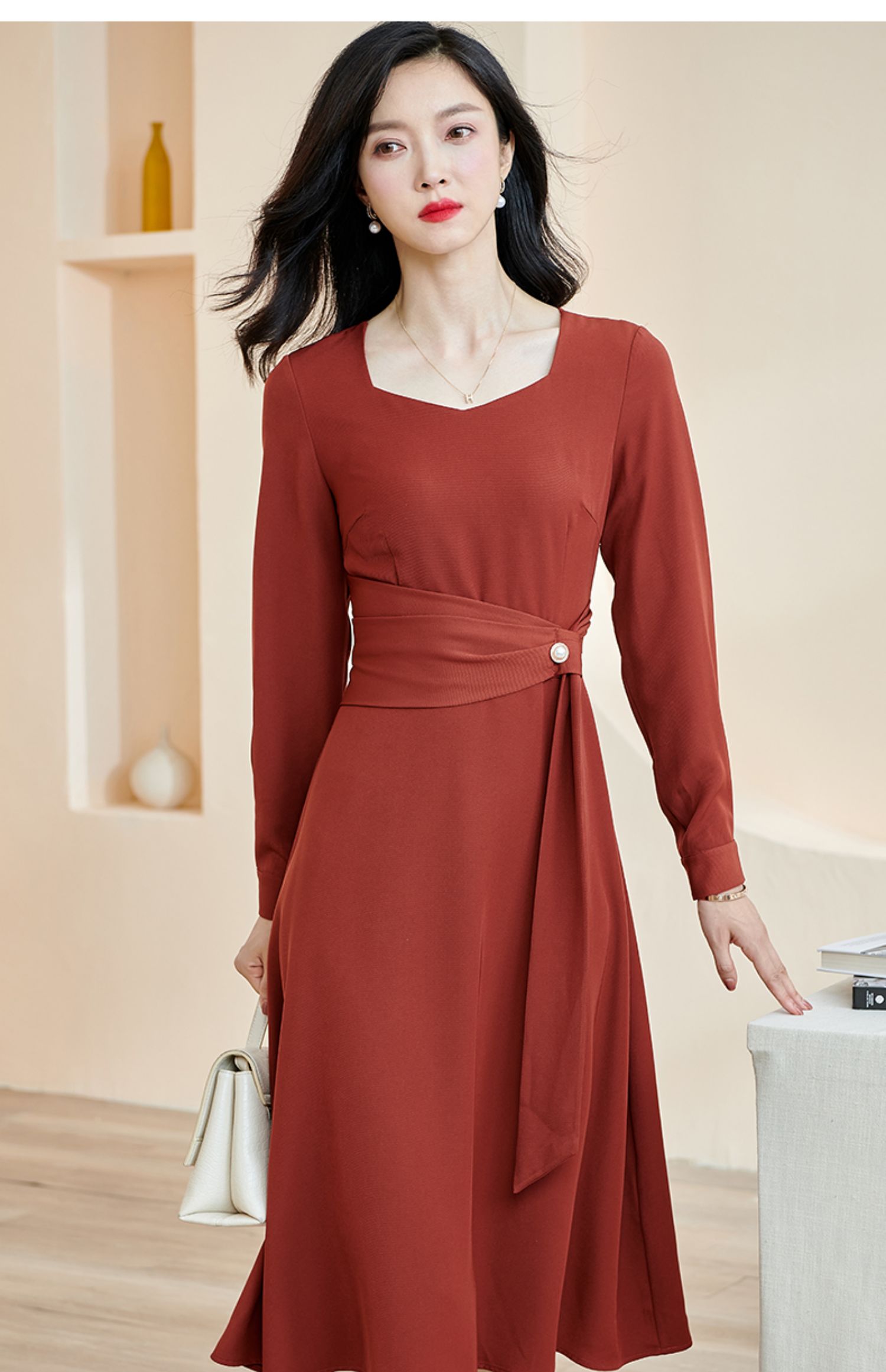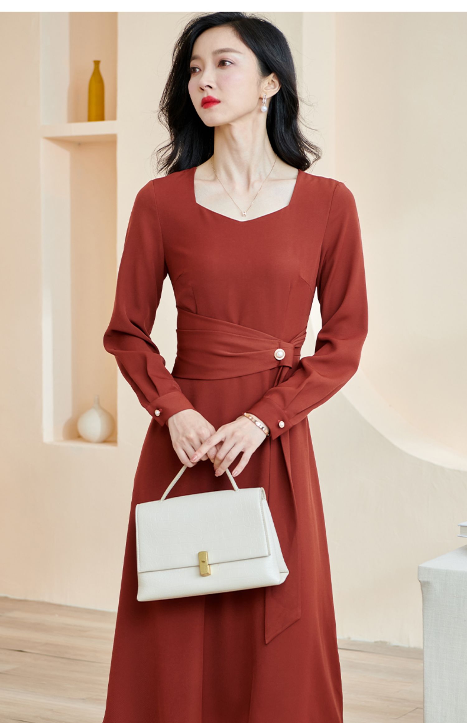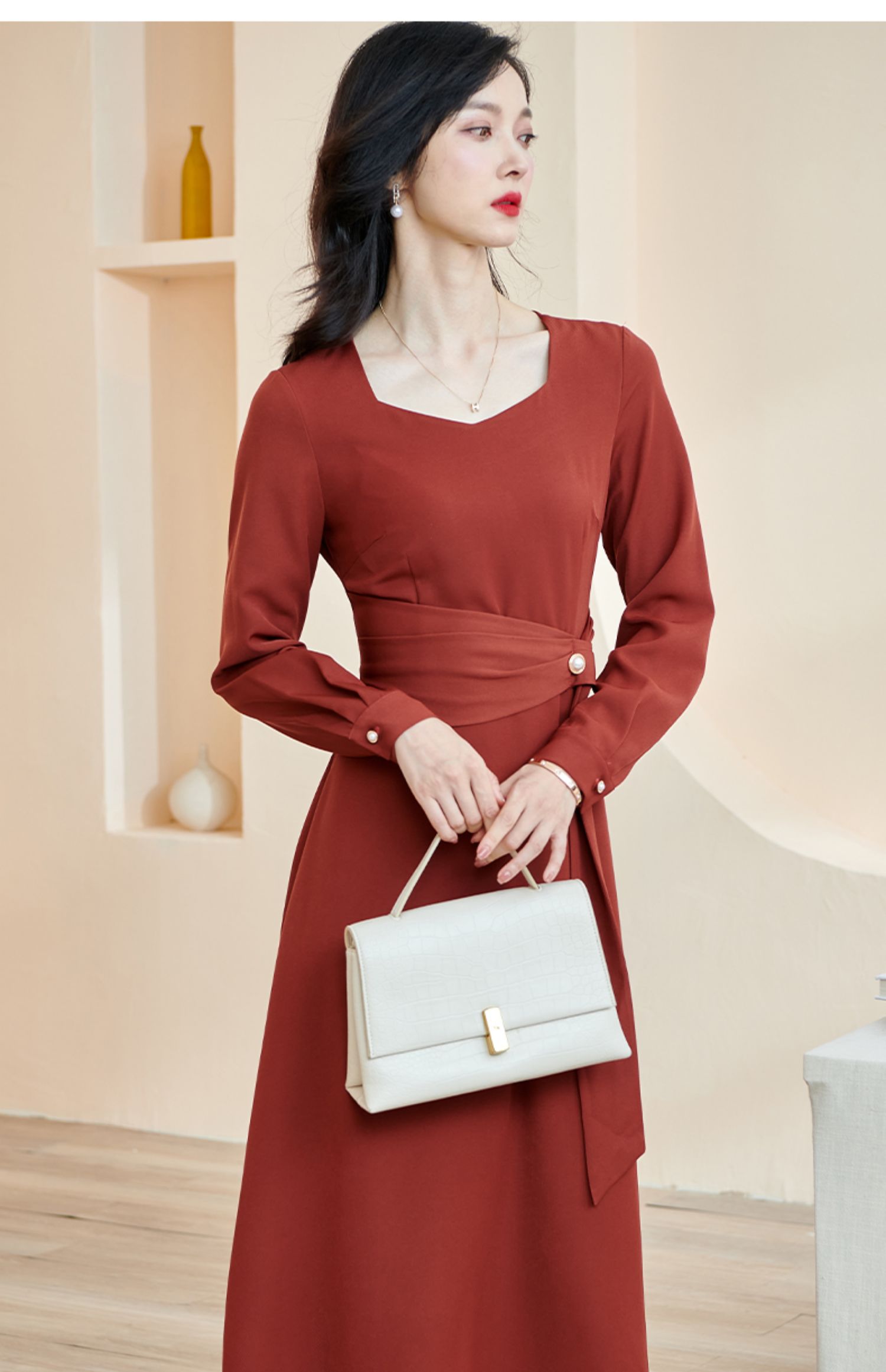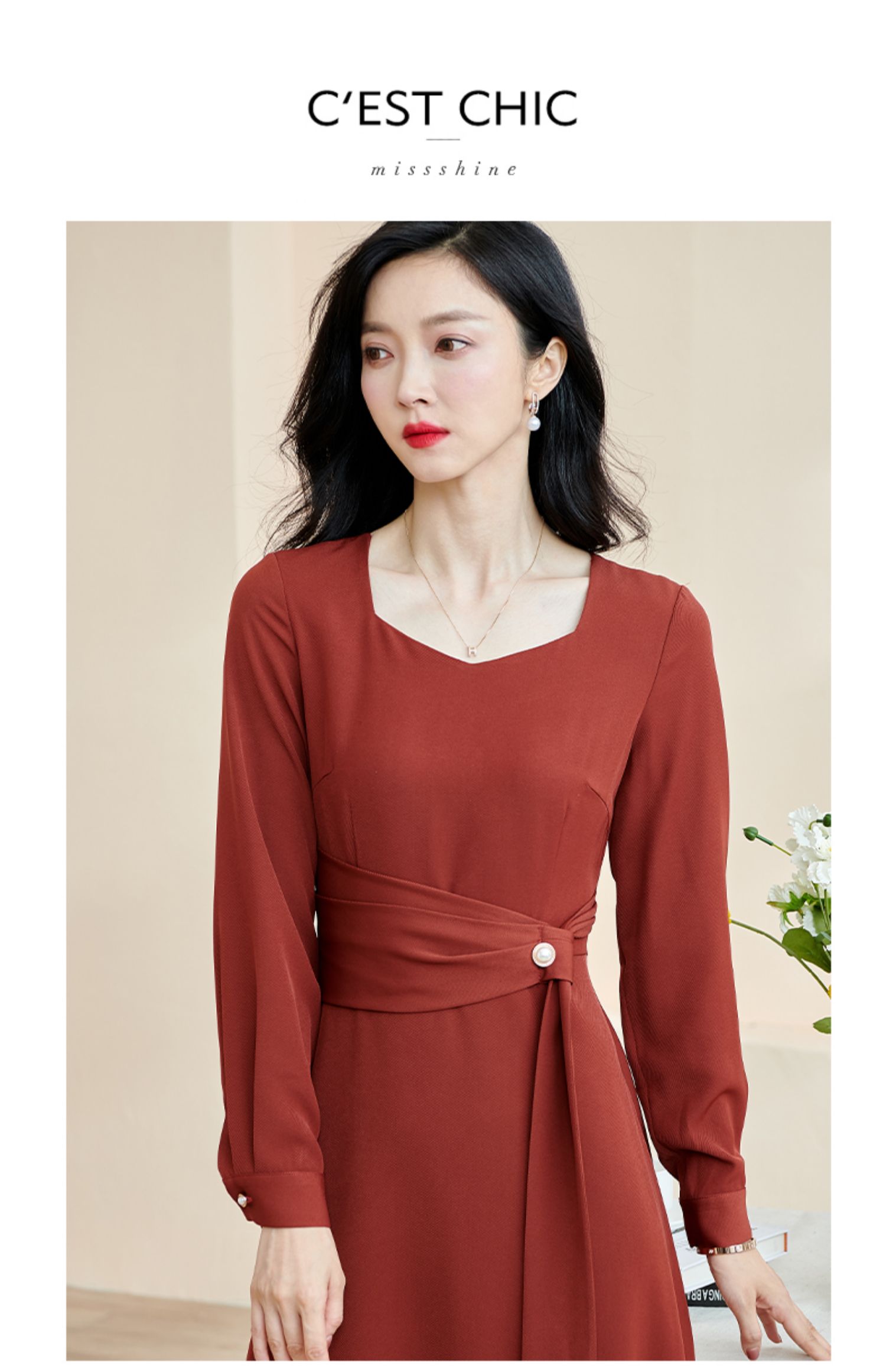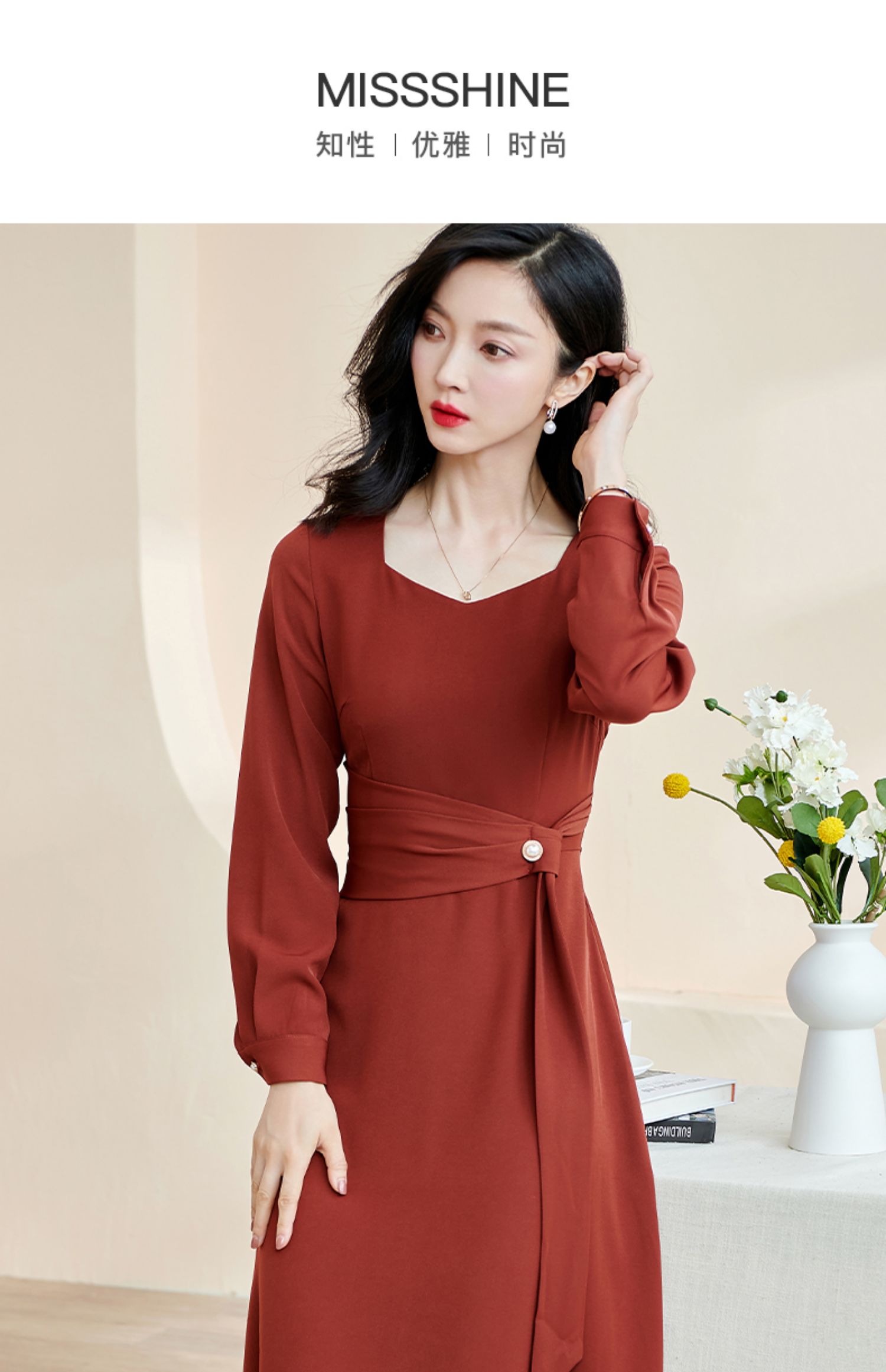剩S/M 米思阳2026春季新款复古知性优雅方领连衣裙收腰显瘦中长裙2287