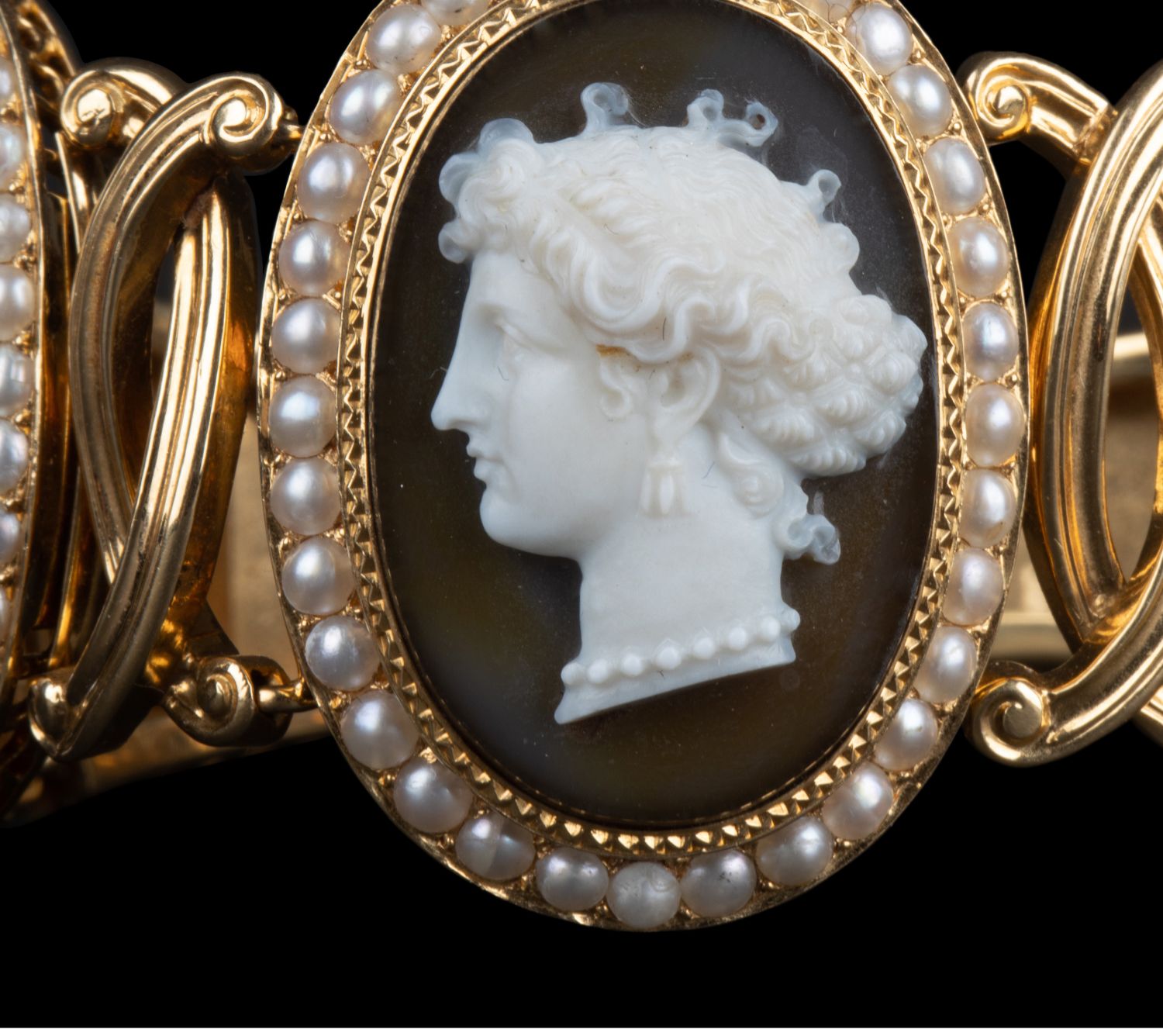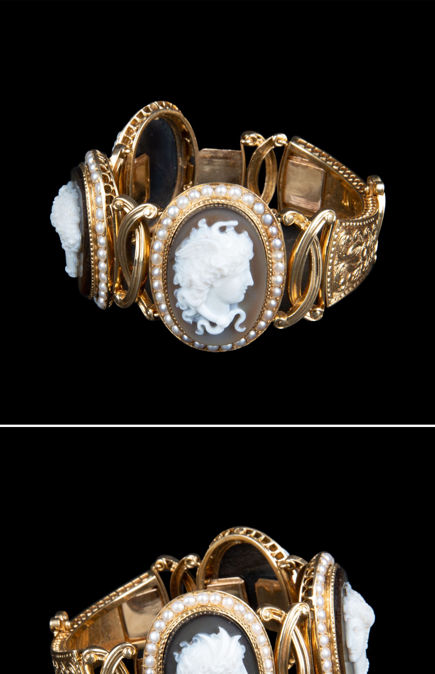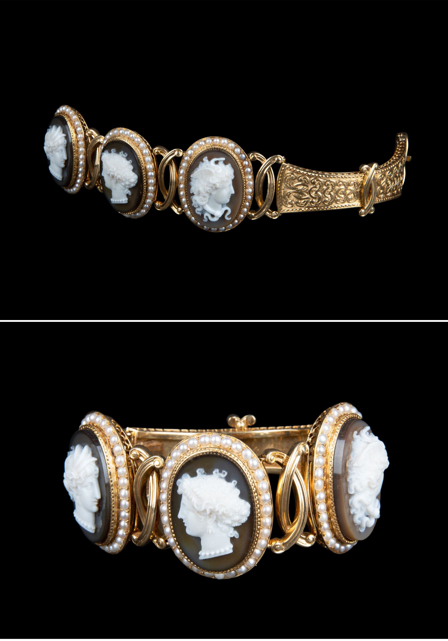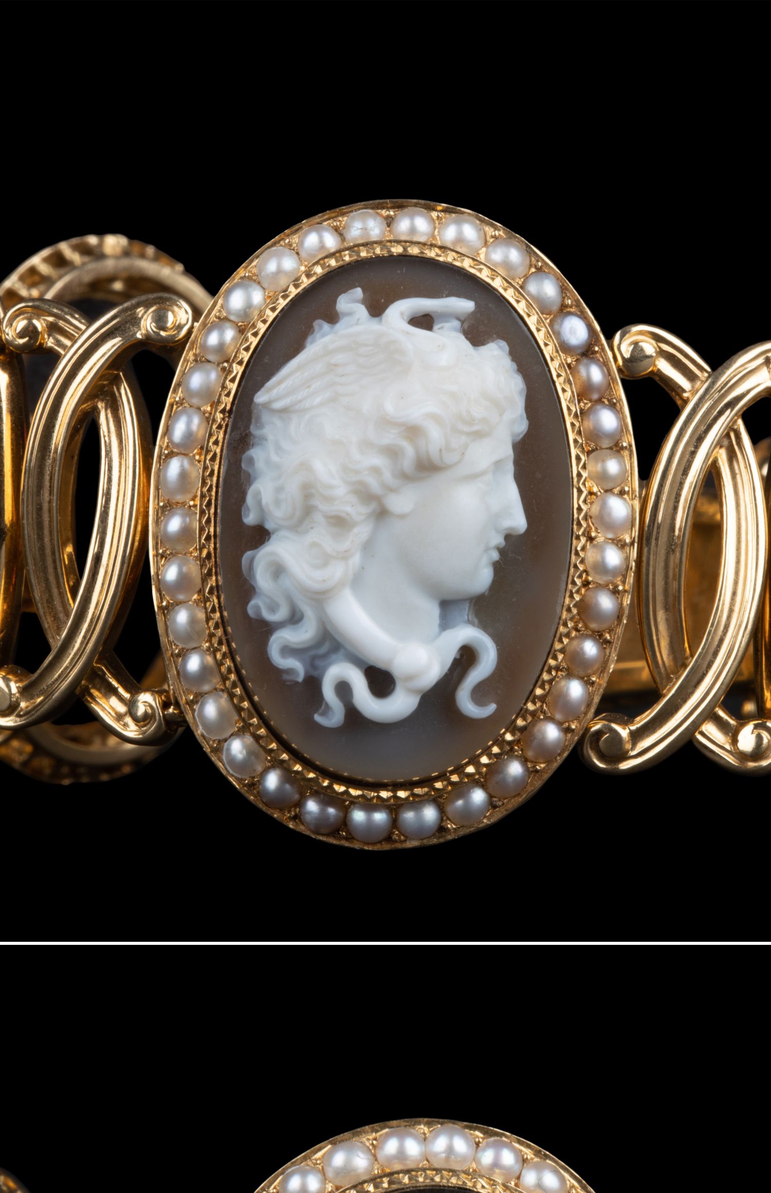 独角鹿西洋古董珠宝法国18K金镶珍珠玛瑙浮雕卡梅奥cameo手镯手链