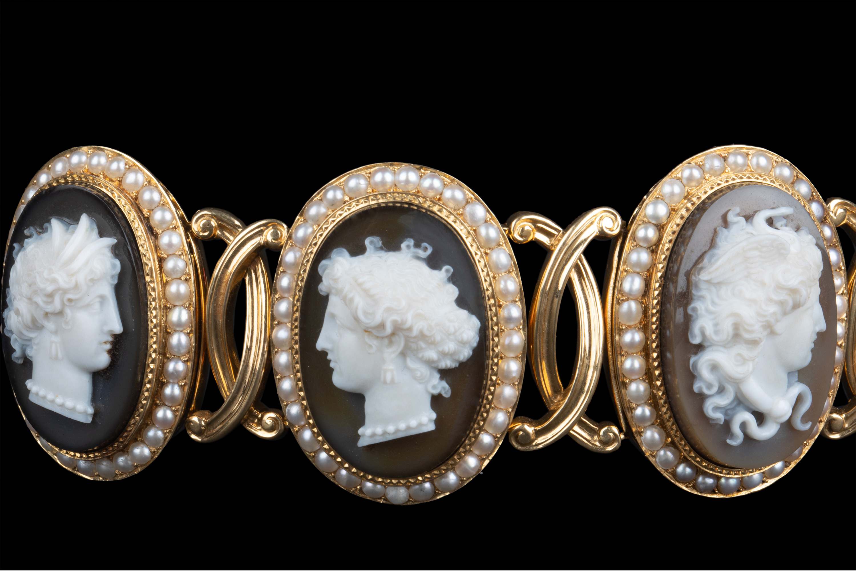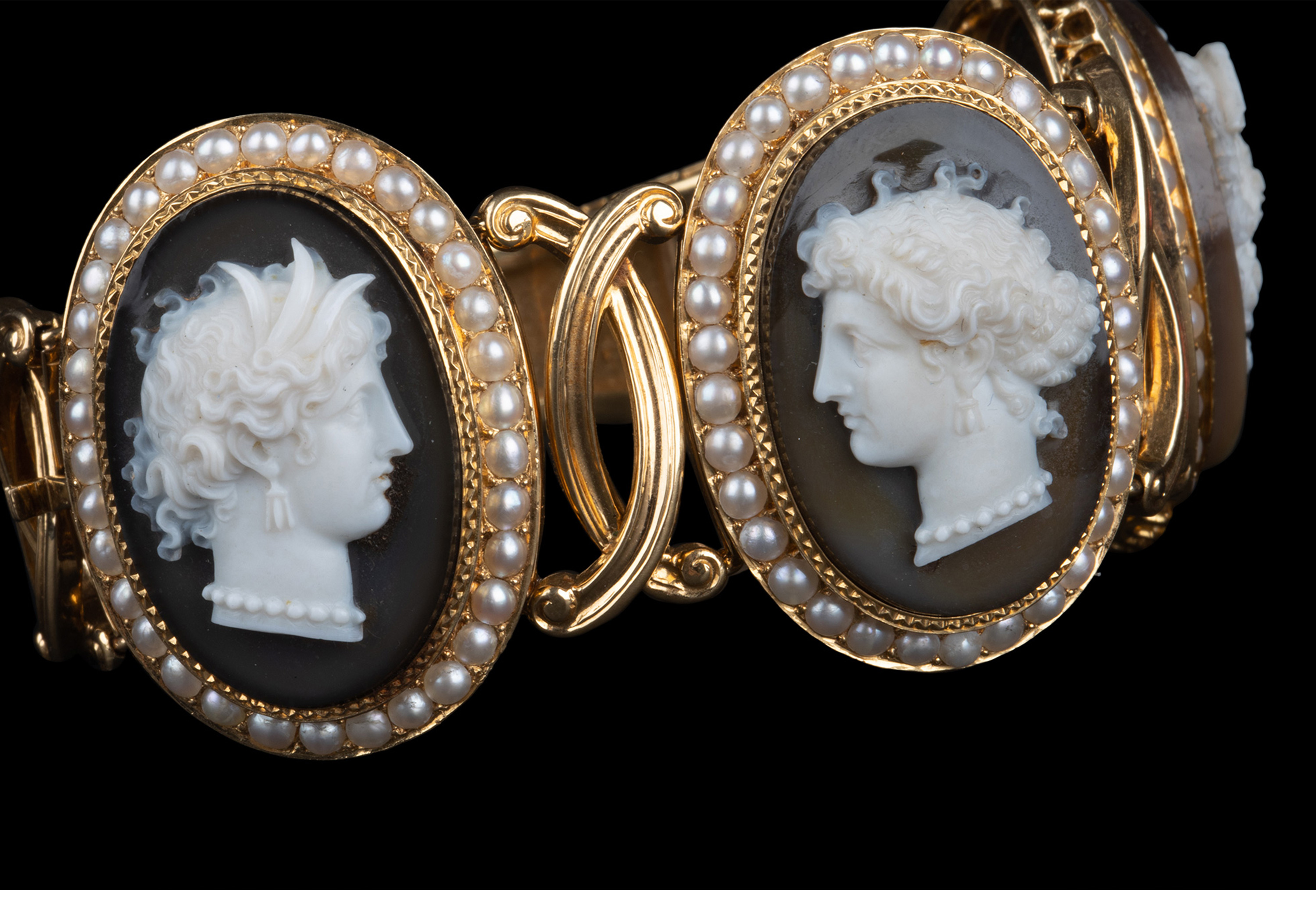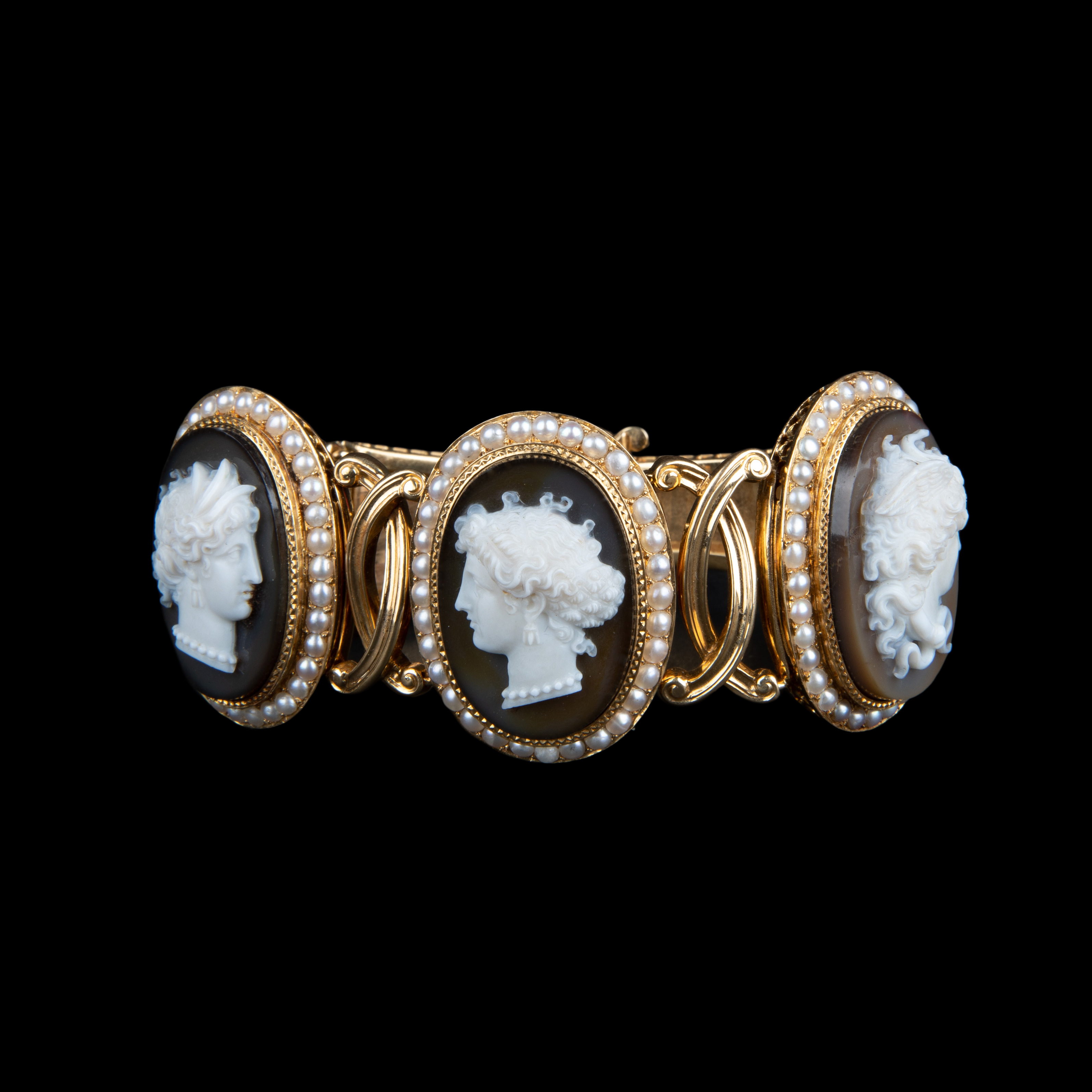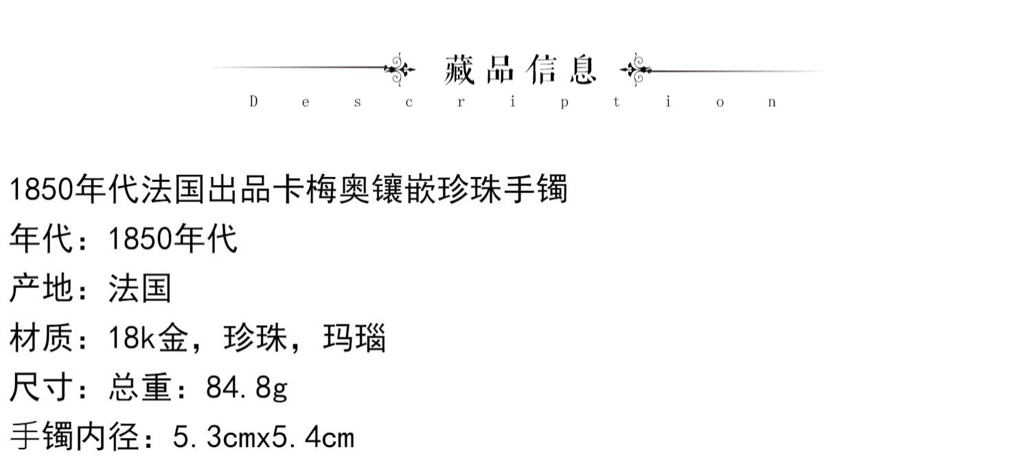 独角鹿西洋古董珠宝法国18K金镶珍珠玛瑙浮雕卡梅奥cameo手镯手链