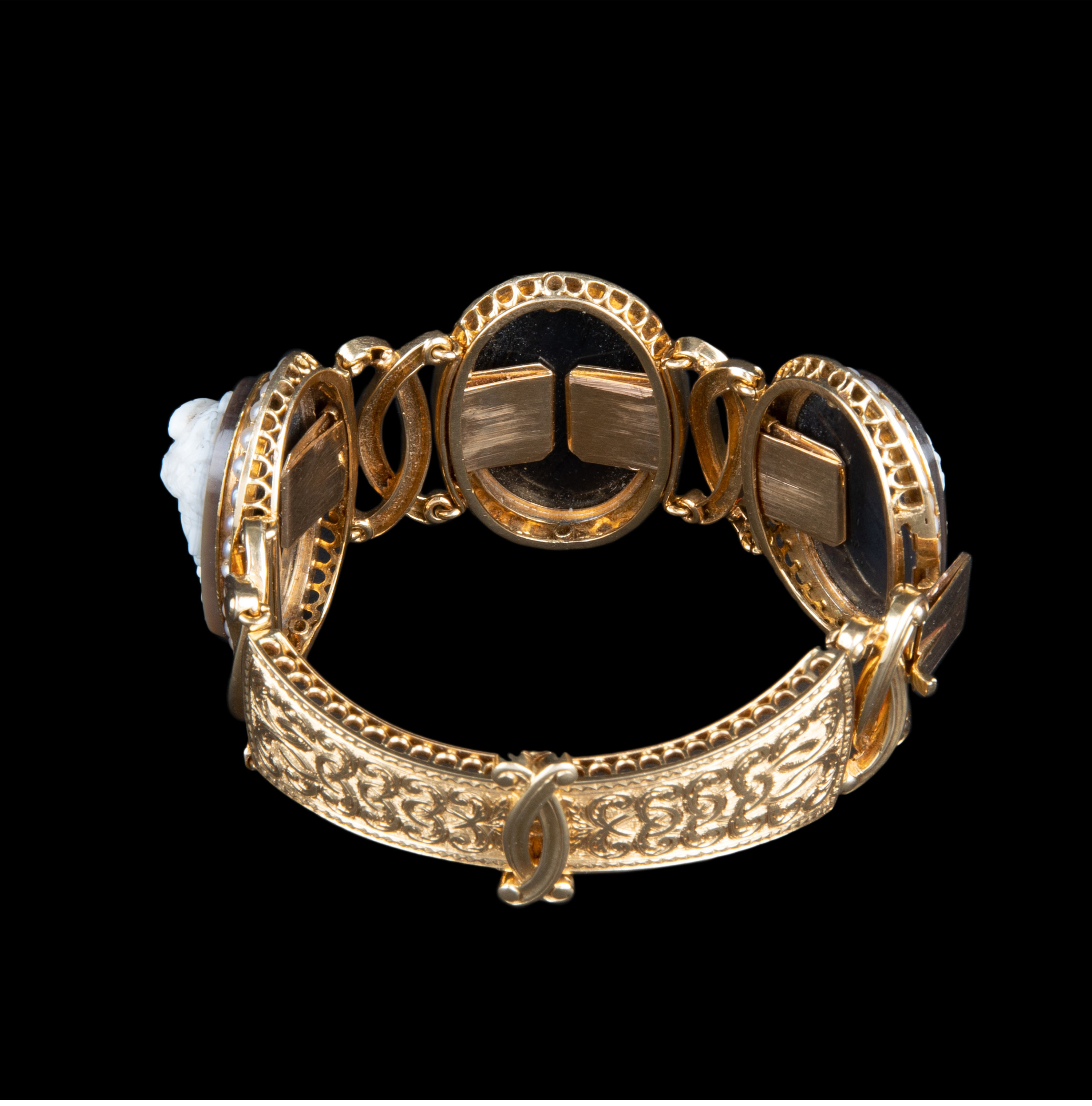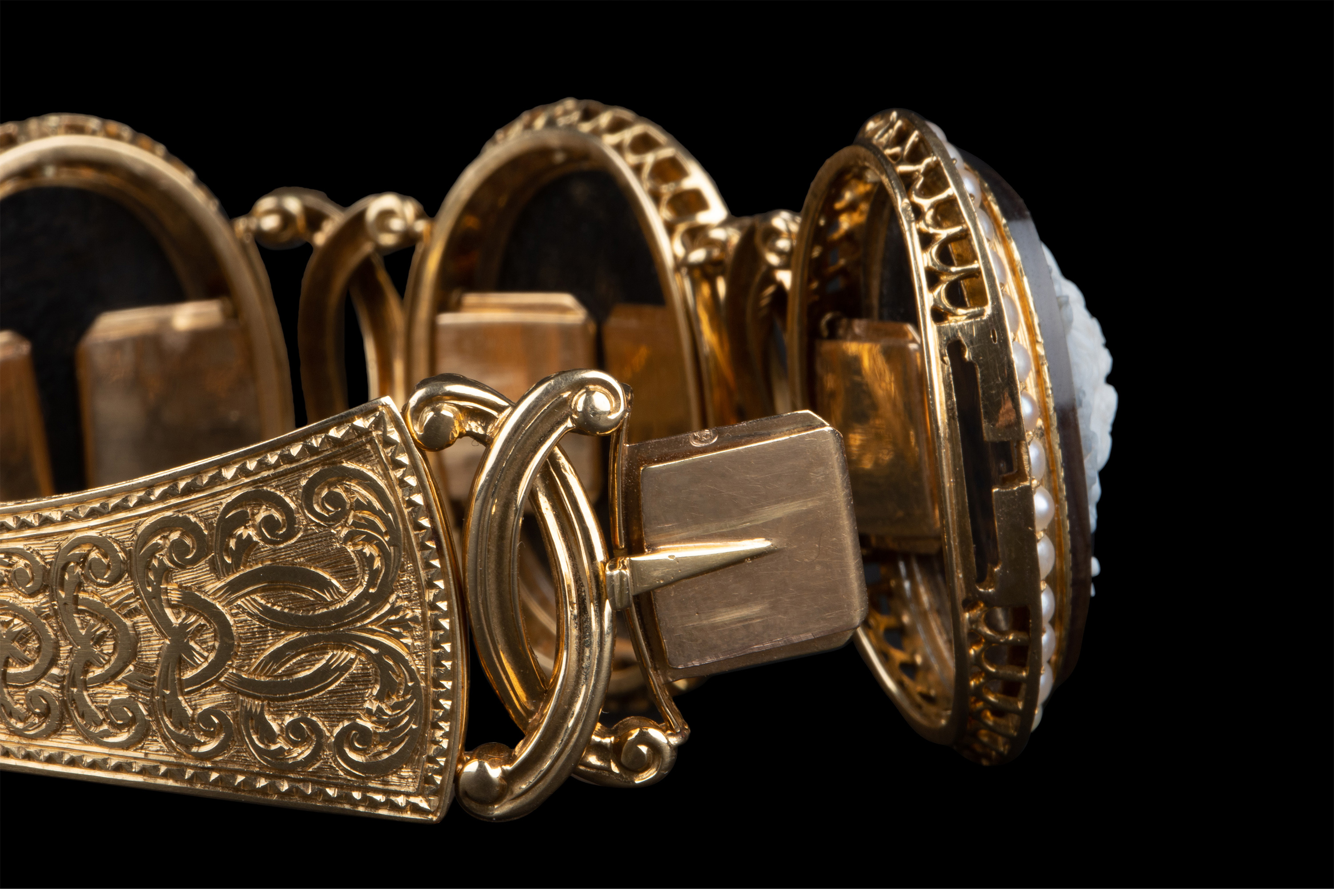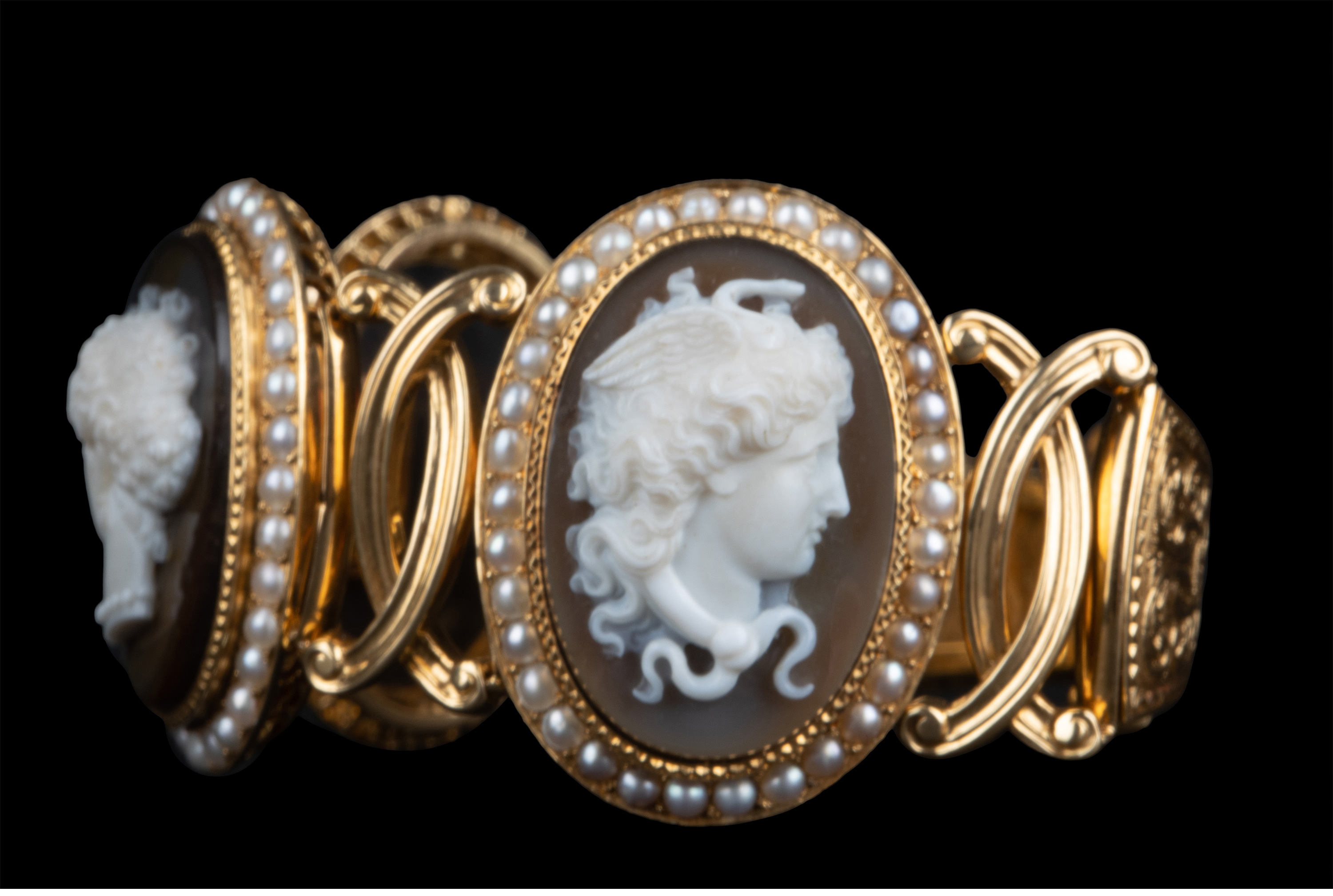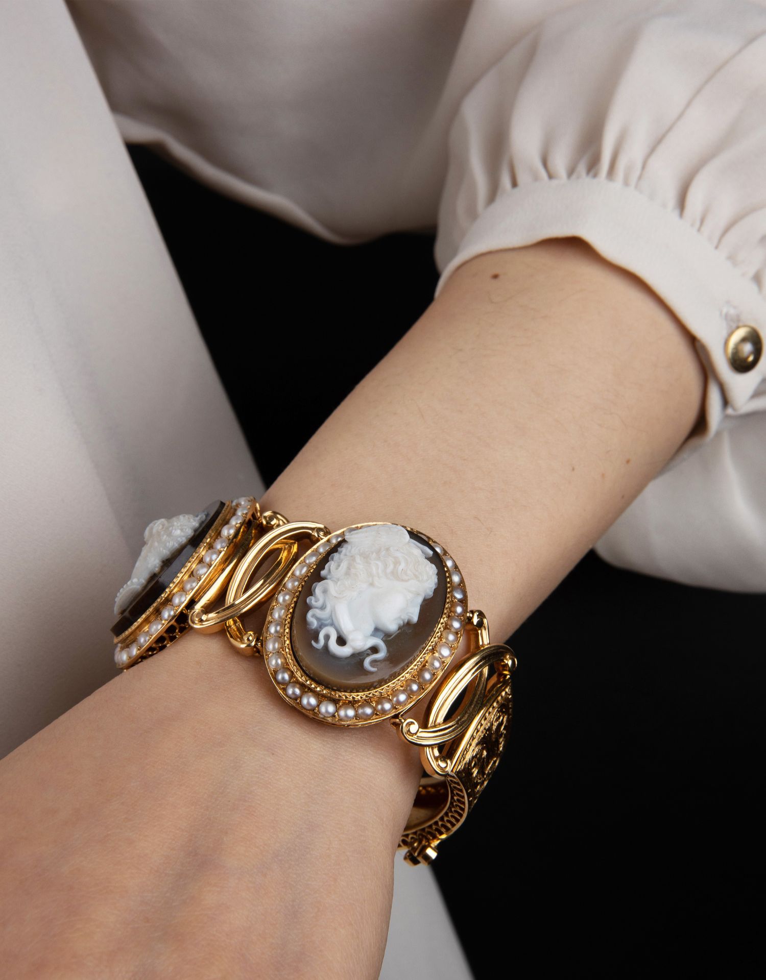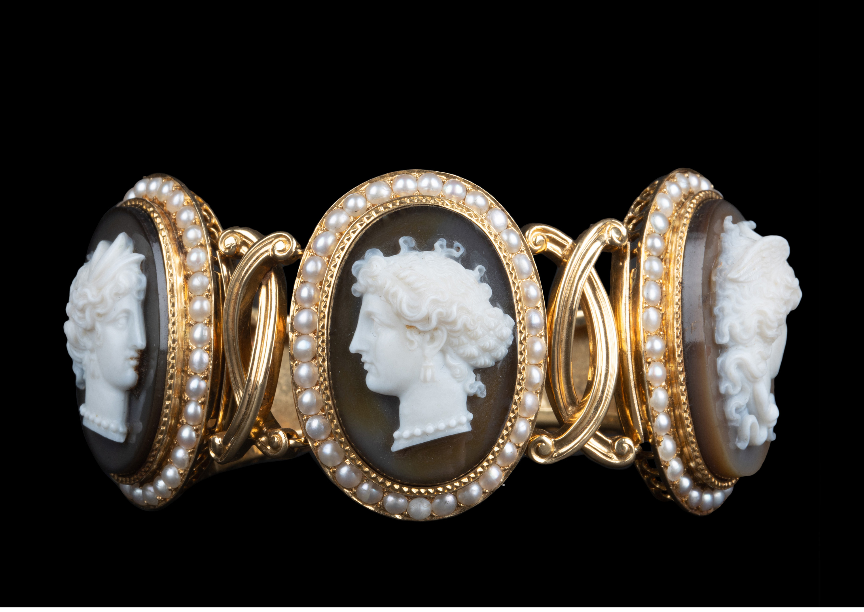 独角鹿西洋古董珠宝法国18K金镶珍珠玛瑙浮雕卡梅奥cameo手镯手链