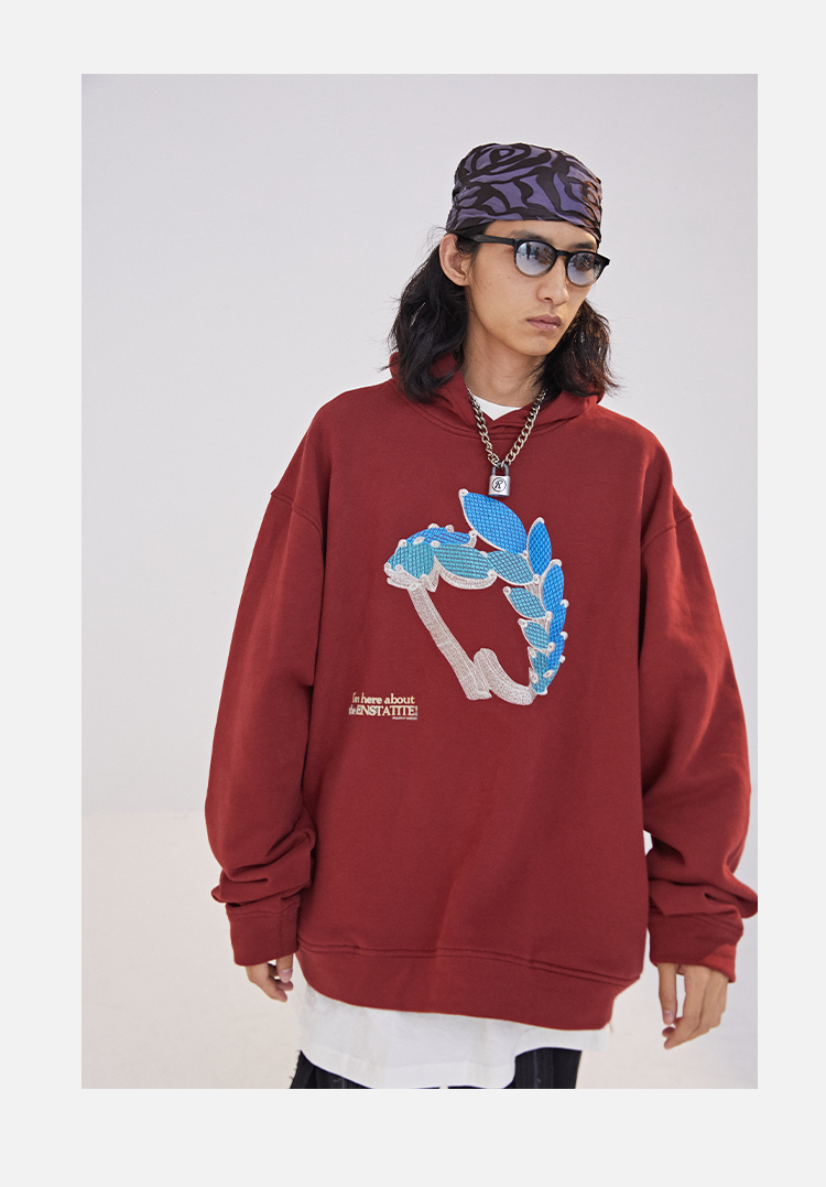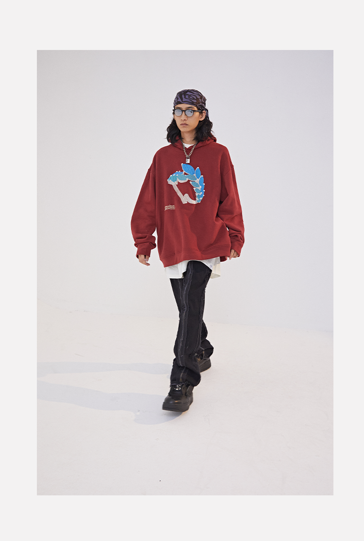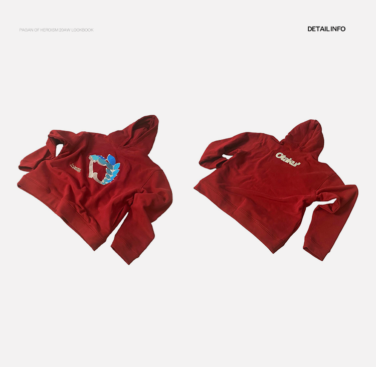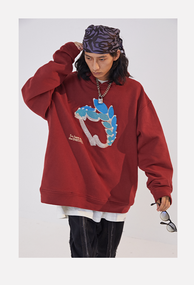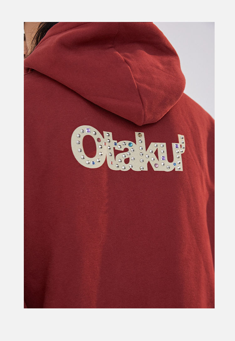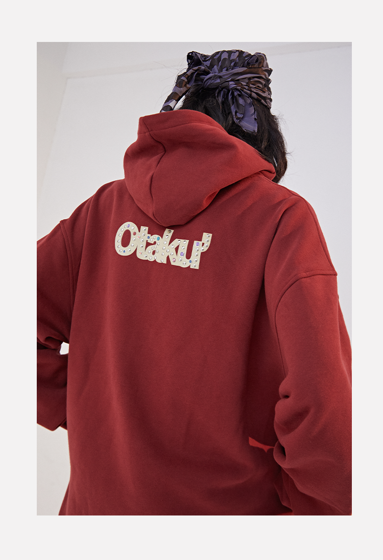 POH 水晶钻戒宝石重工刺绣上衣字母印花烫钻酒红色长袖连帽卫衣男