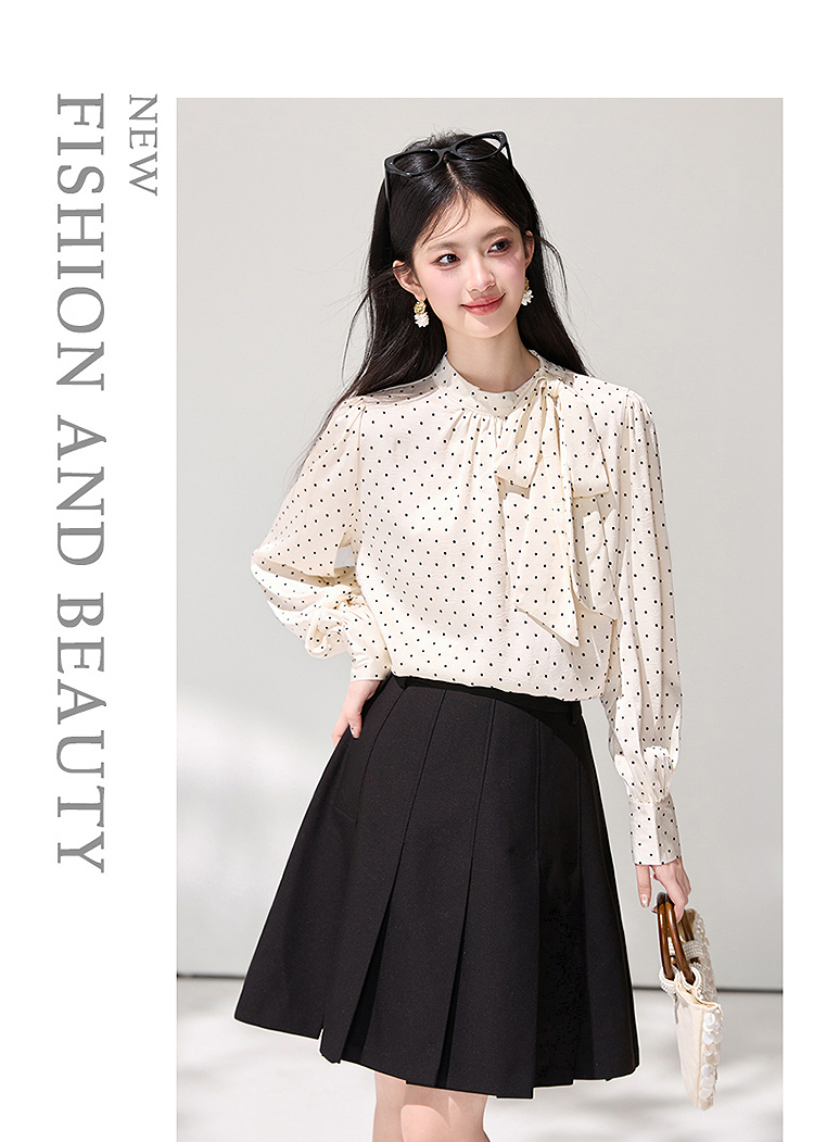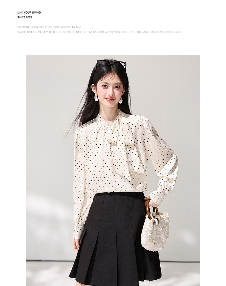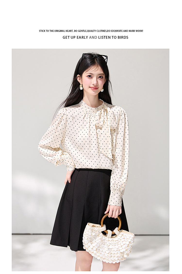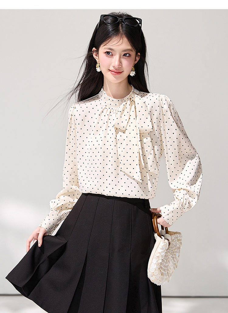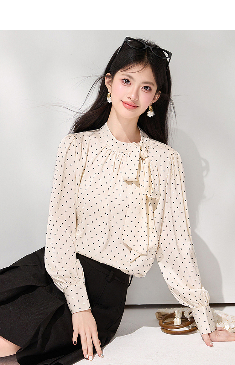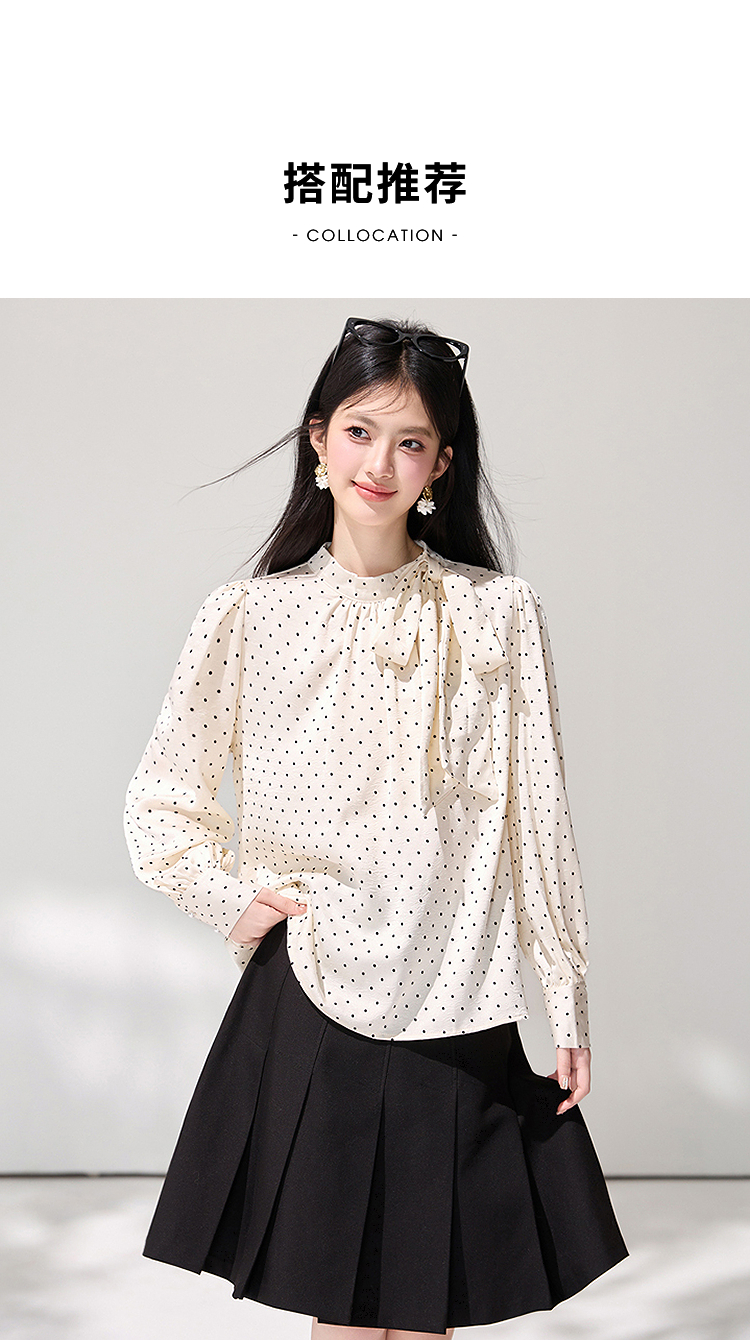 西遇法式波点立领衬衫女2026春季新款蝴蝶结飘带气质通勤长袖衬衣SS060148