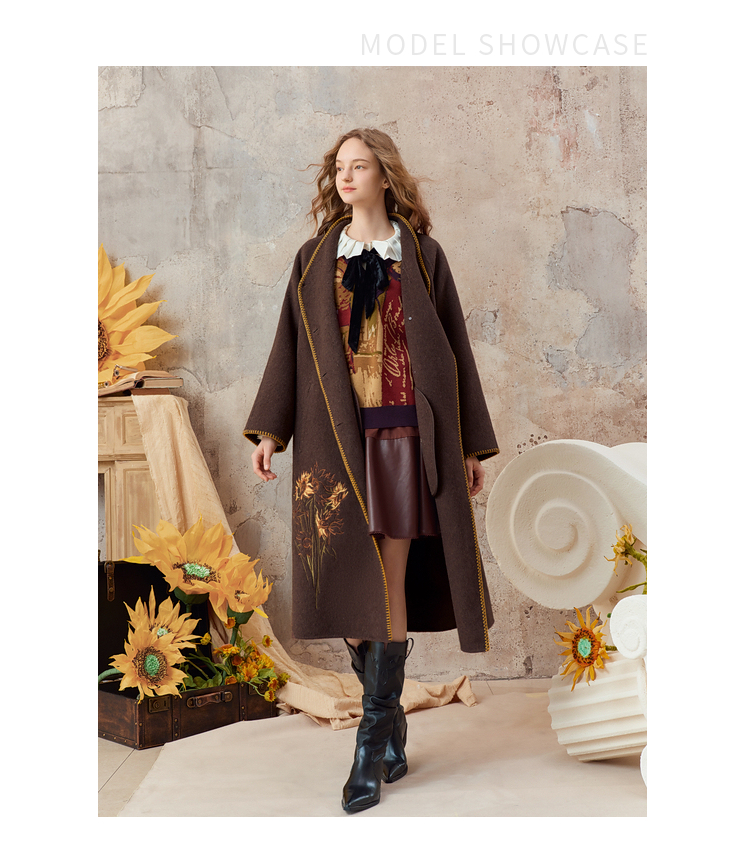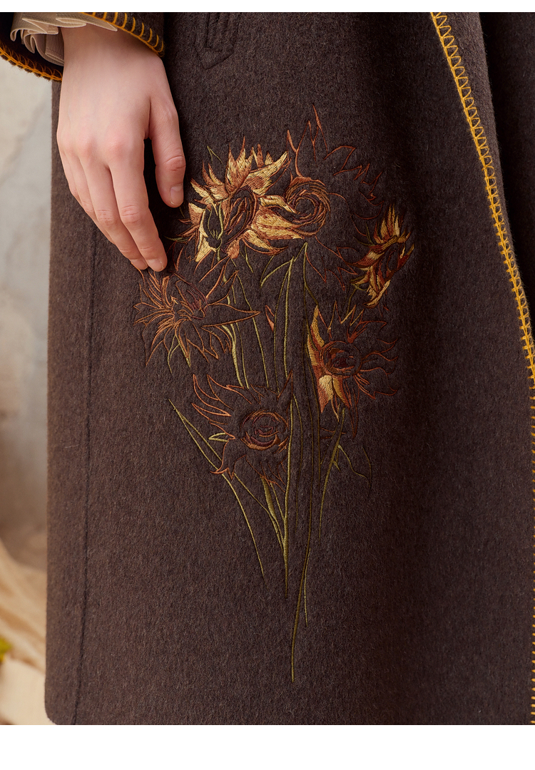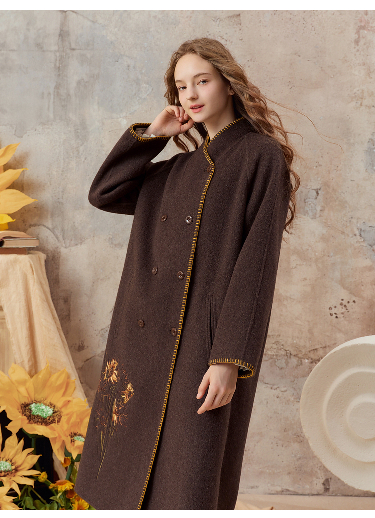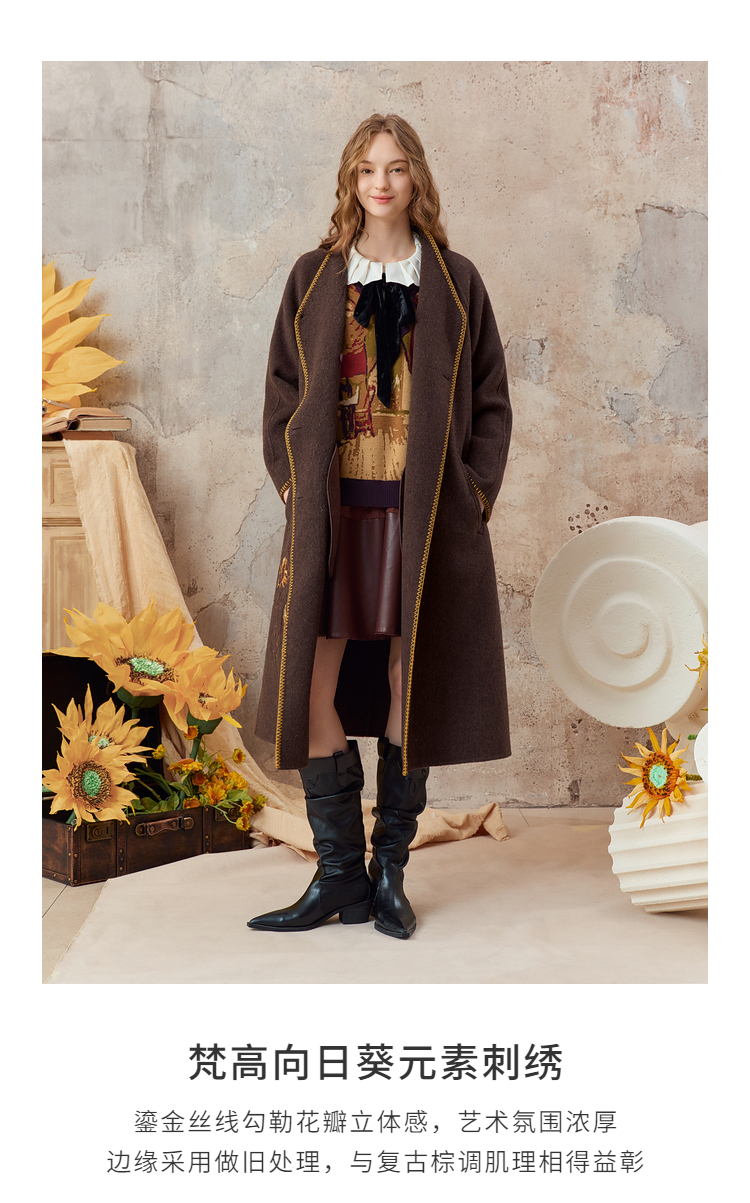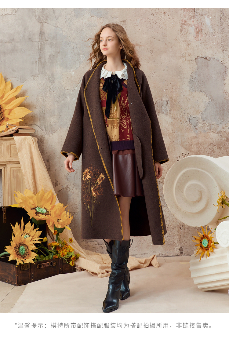【暖冬内购】两三事梵高文艺原野焦糖2025秋冬新款绣花双排扣羊毛呢外套女宽松