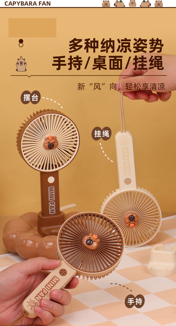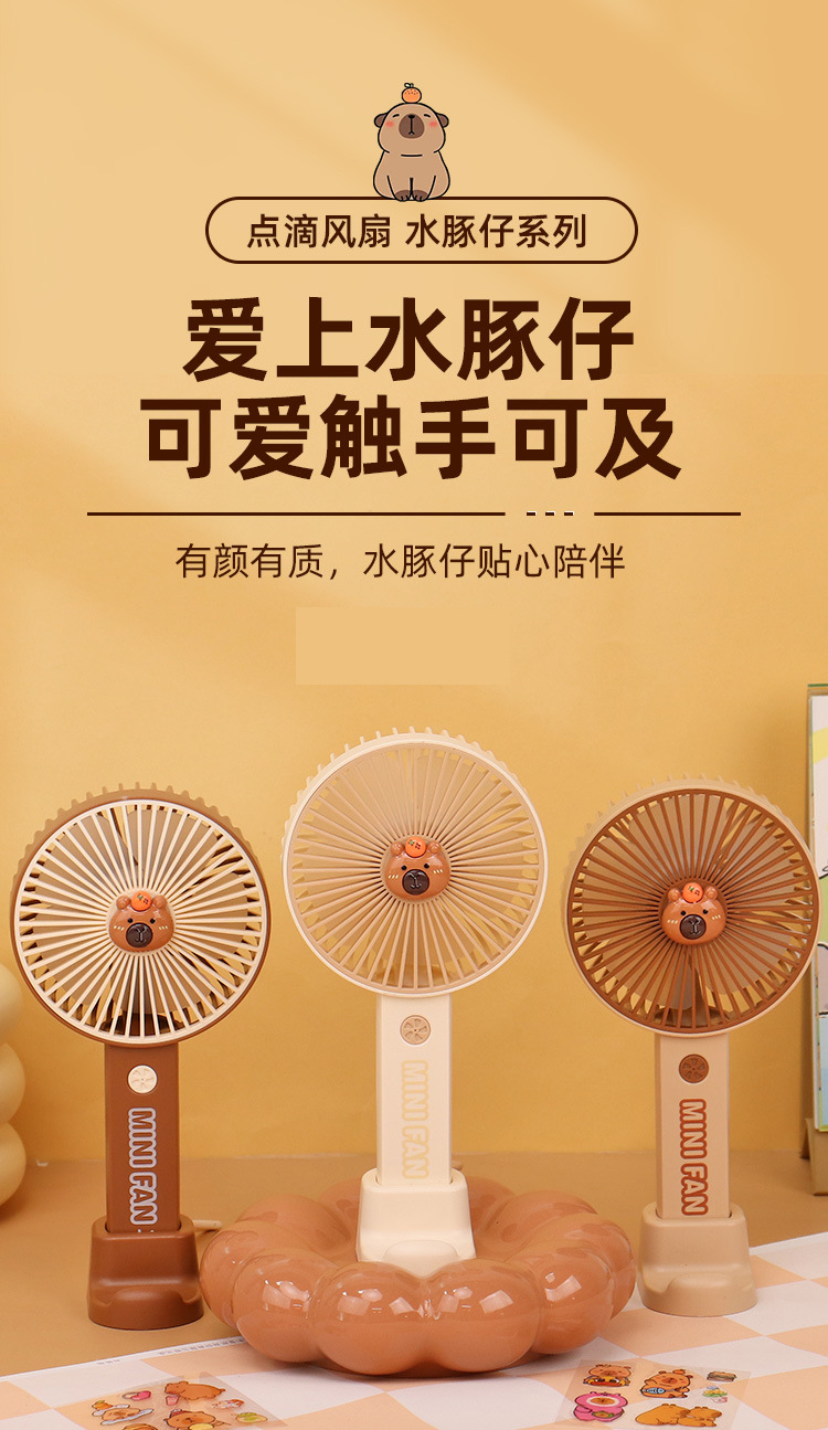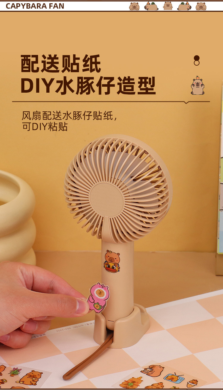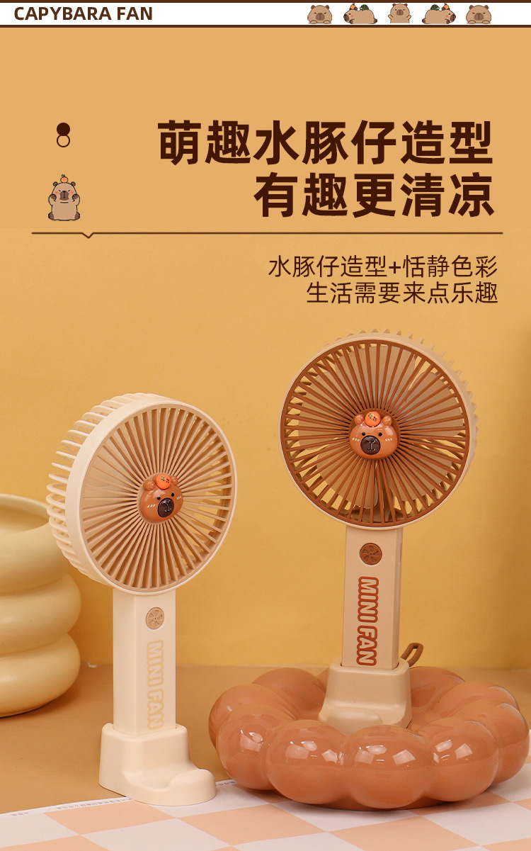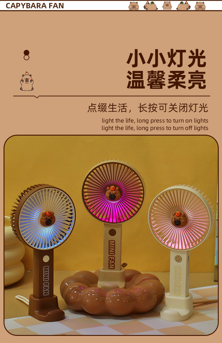 【送贴纸❗️灯光便携水豚风扇】手持出行皆可用,还能当桌面手机支架!USB充电办公室学校用静音带补光灯卡皮巴拉迷你小风扇