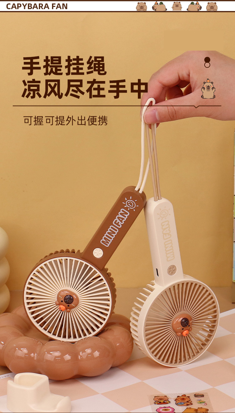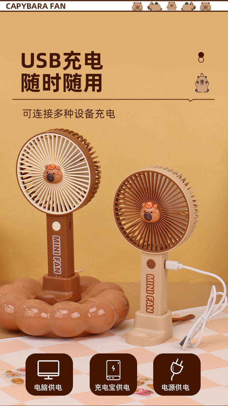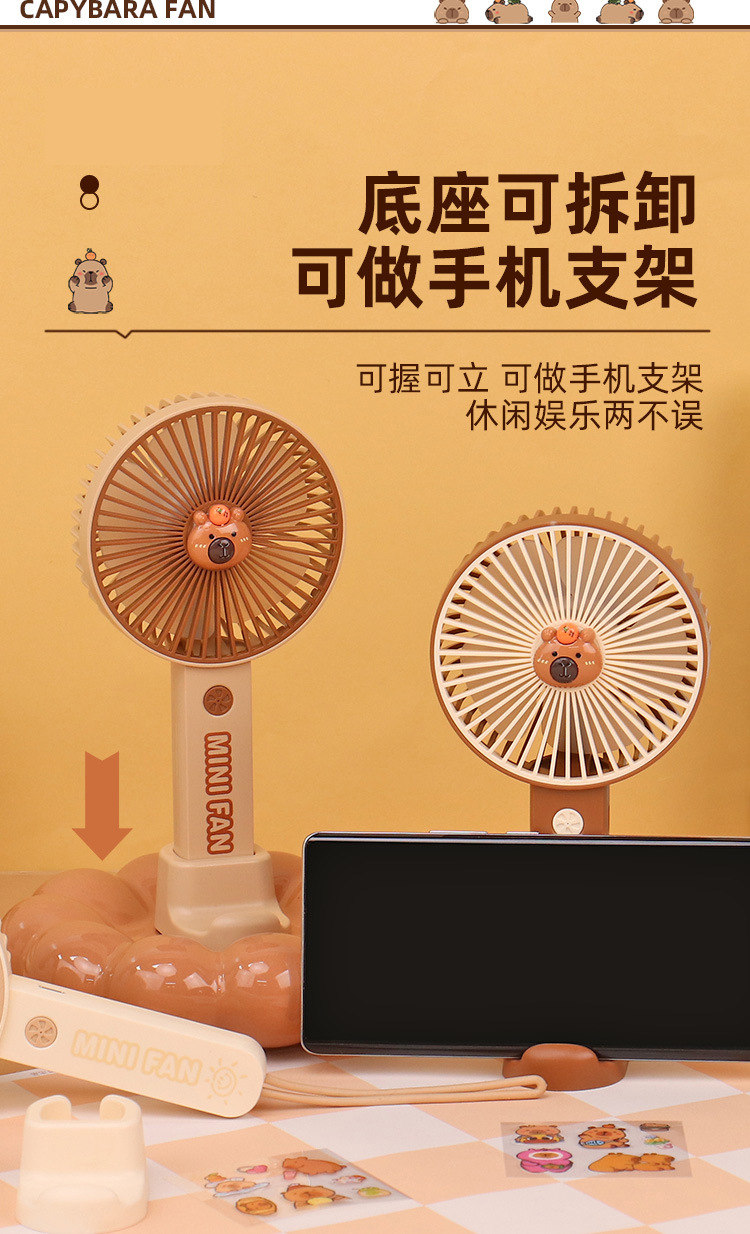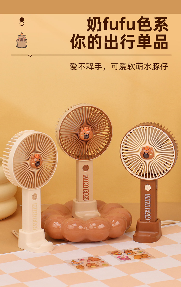 【送贴纸❗️灯光便携水豚风扇】手持出行皆可用,还能当桌面手机支架!USB充电办公室学校用静音带补光灯卡皮巴拉迷你小风扇
