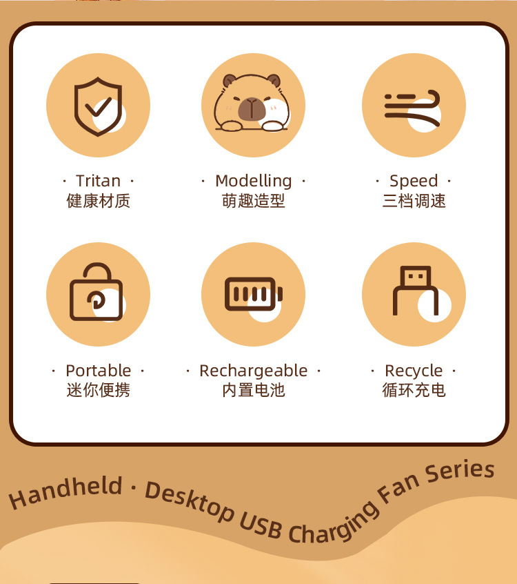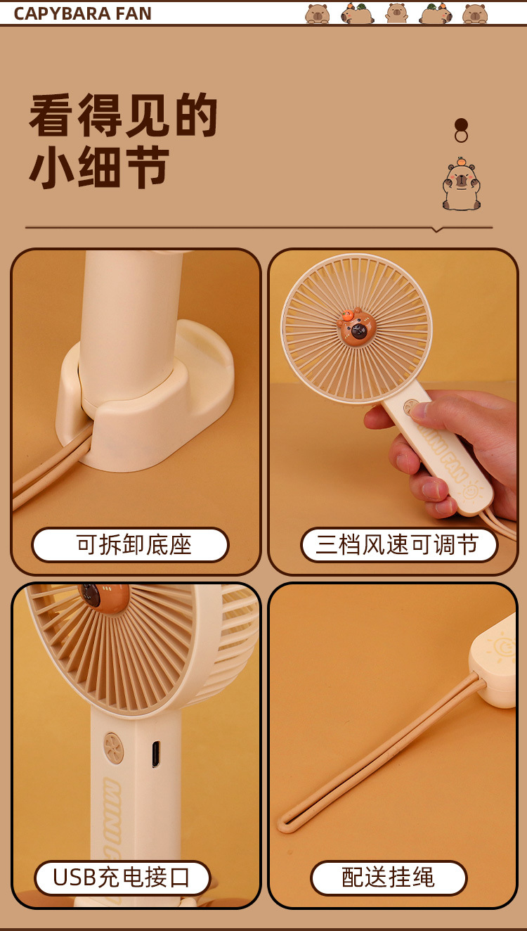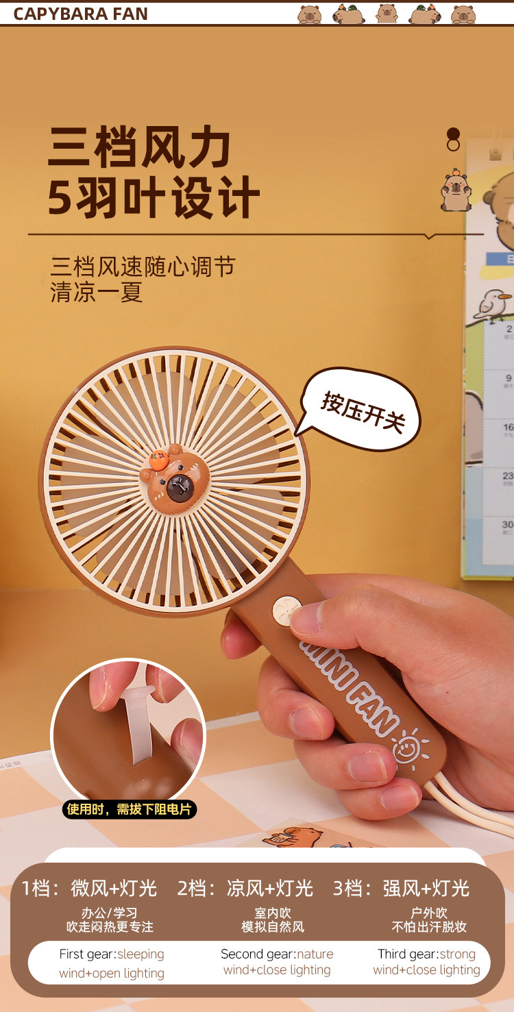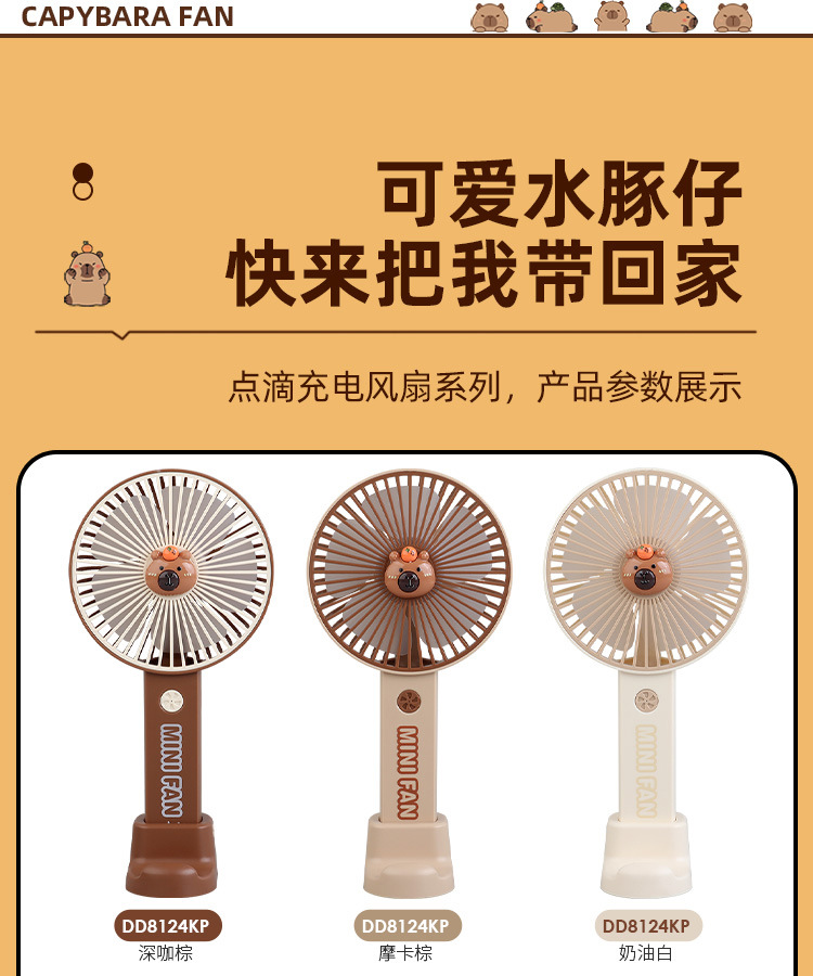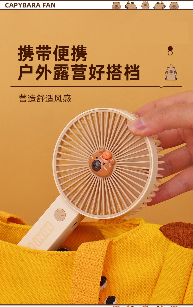 【送贴纸❗️灯光便携水豚风扇】手持出行皆可用,还能当桌面手机支架!USB充电办公室学校用静音带补光灯卡皮巴拉迷你小风扇