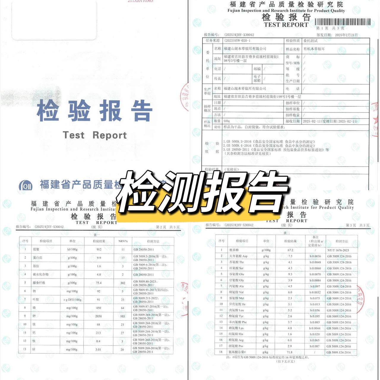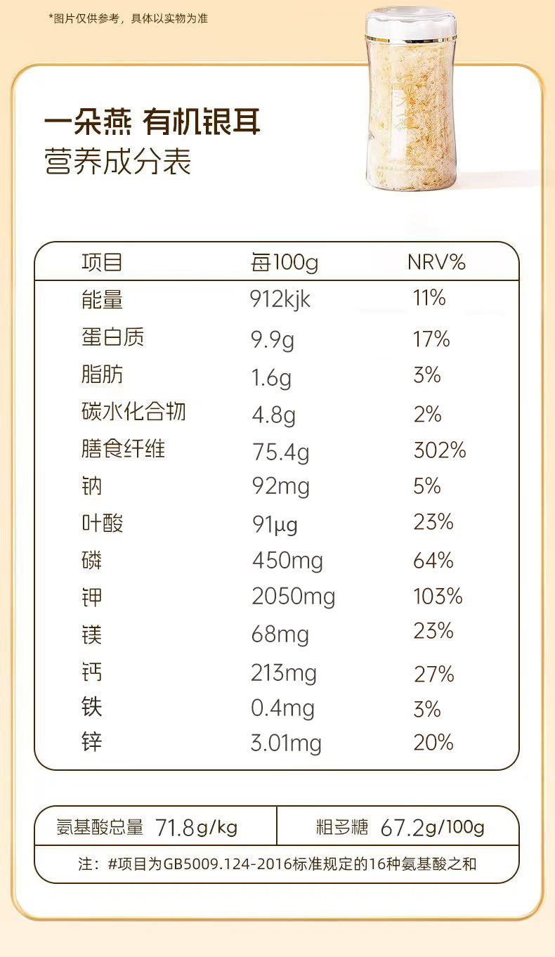 最让我安心的是它的安全度 —— 选食养的东西,安全比啥都重要。实打实的有机认证,还过了 SGS 602 项检测,结果全是 0 检出,彻底跟硫磺熏的 “毒银耳” 划清界限。配料表更让人放心,从头到尾就 “银耳” 俩字,没有任何额外添加,这种干净劲儿,才符合我对健康食材的期待。
