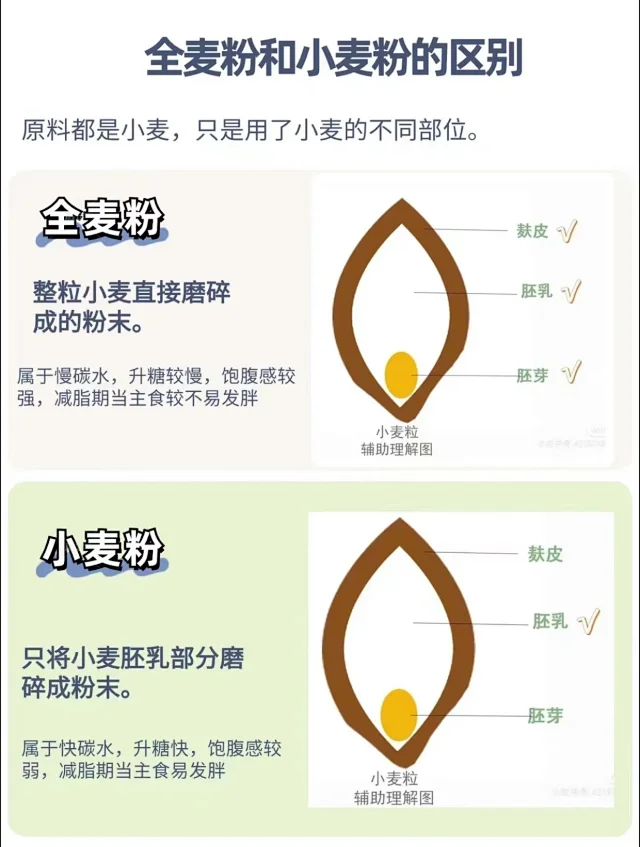 而普通面粉(小麦面粉)是由去掉了外皮的小麦研磨而成,只保留了胚乳部分。