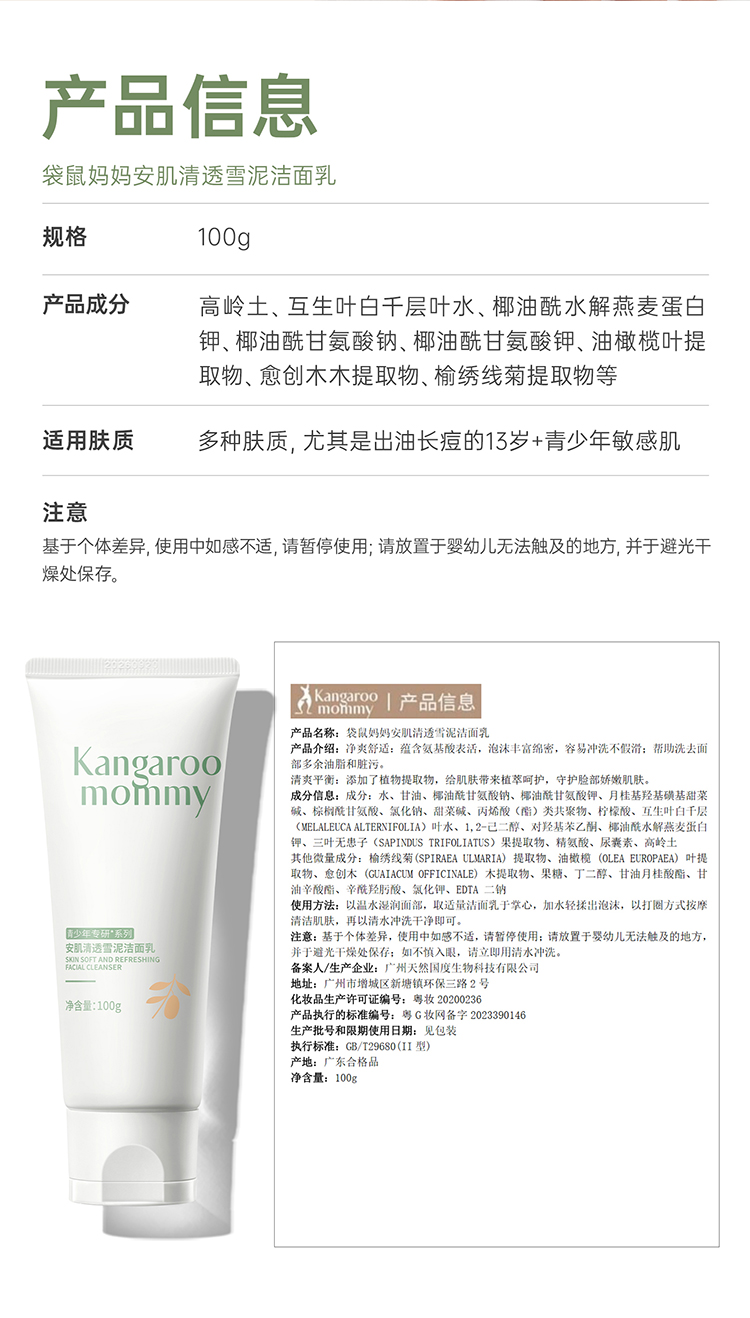 袋鼠妈妈安肌清透雪泥洁面100g