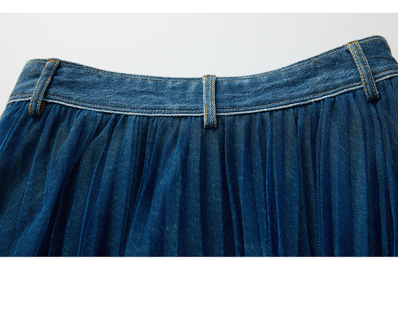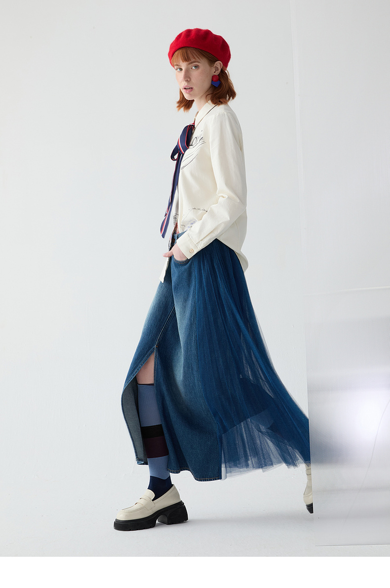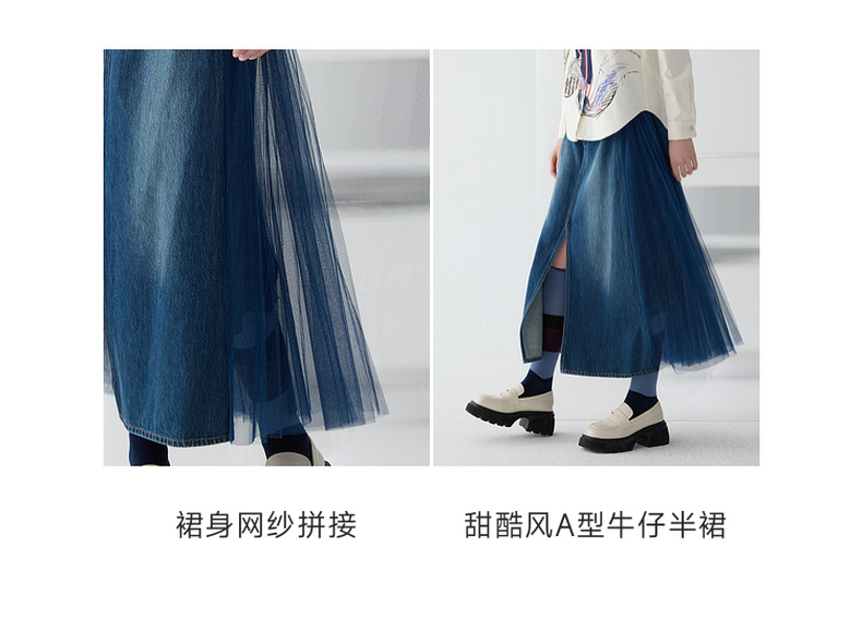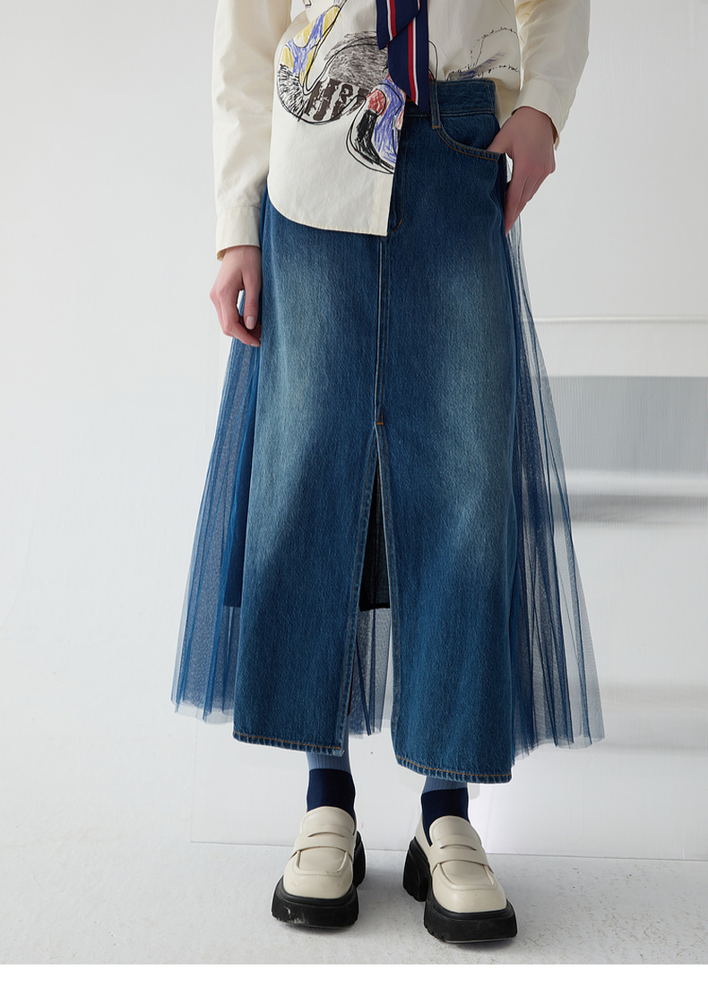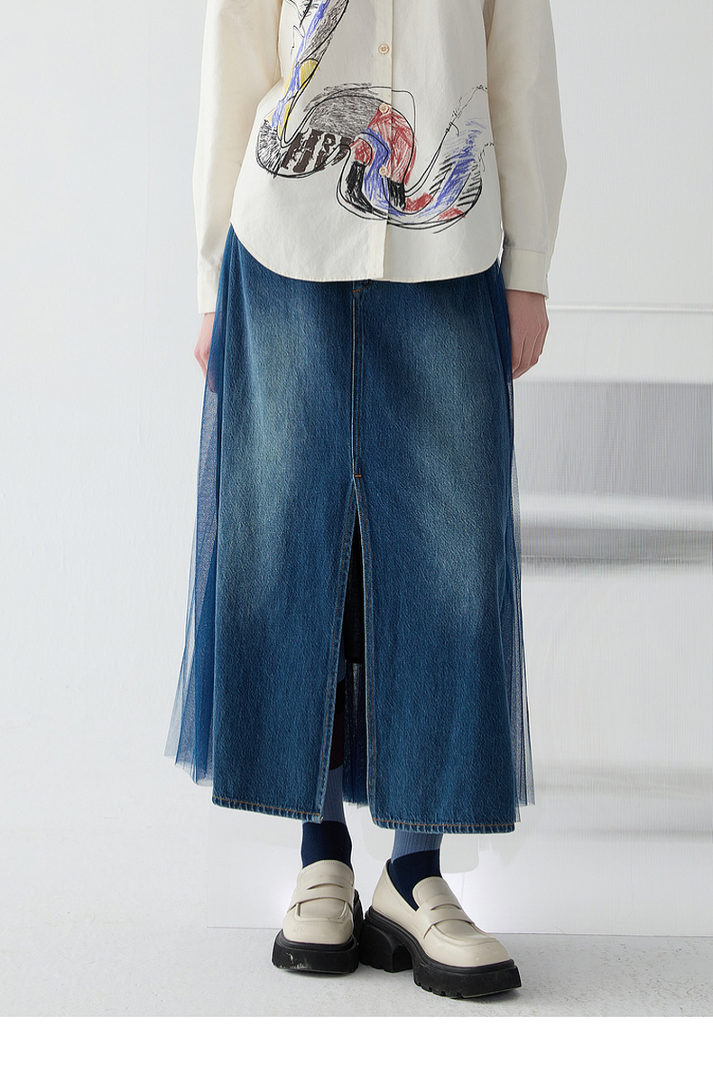 谜底牛仔拼接网纱半身裙2025春新品复古文艺宽松中长裙251MB0035