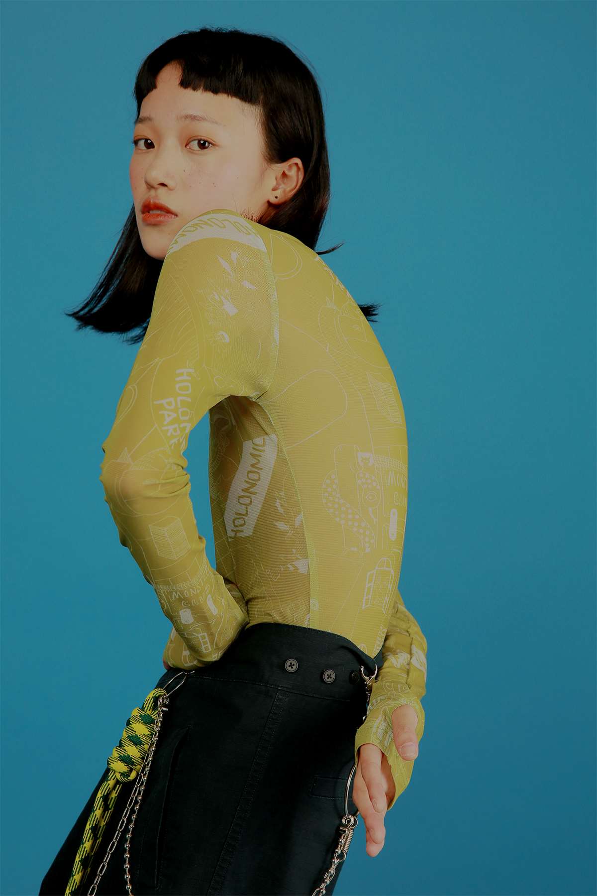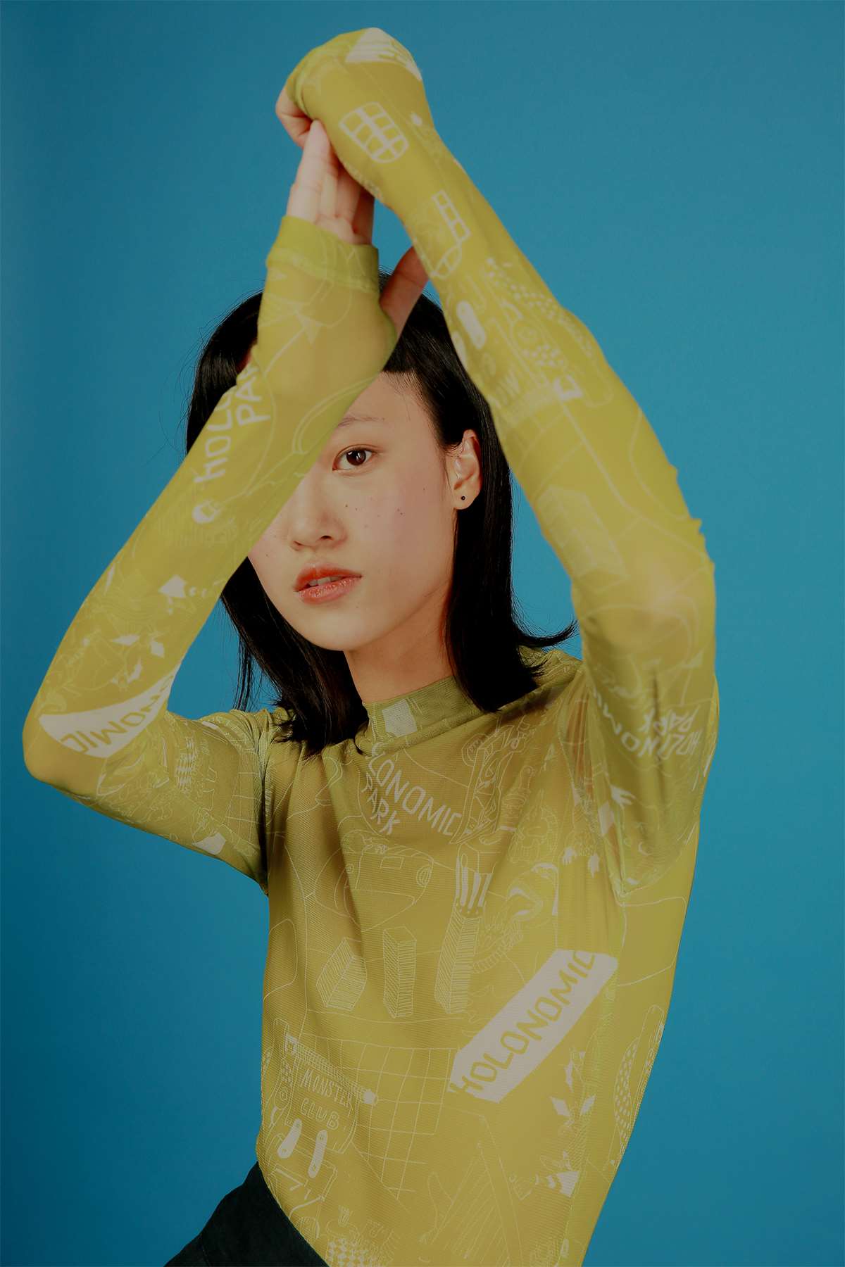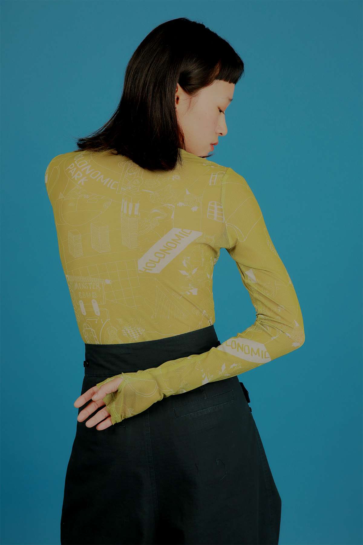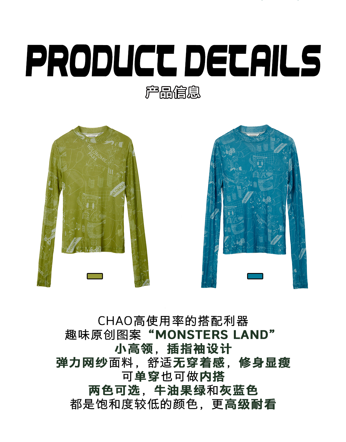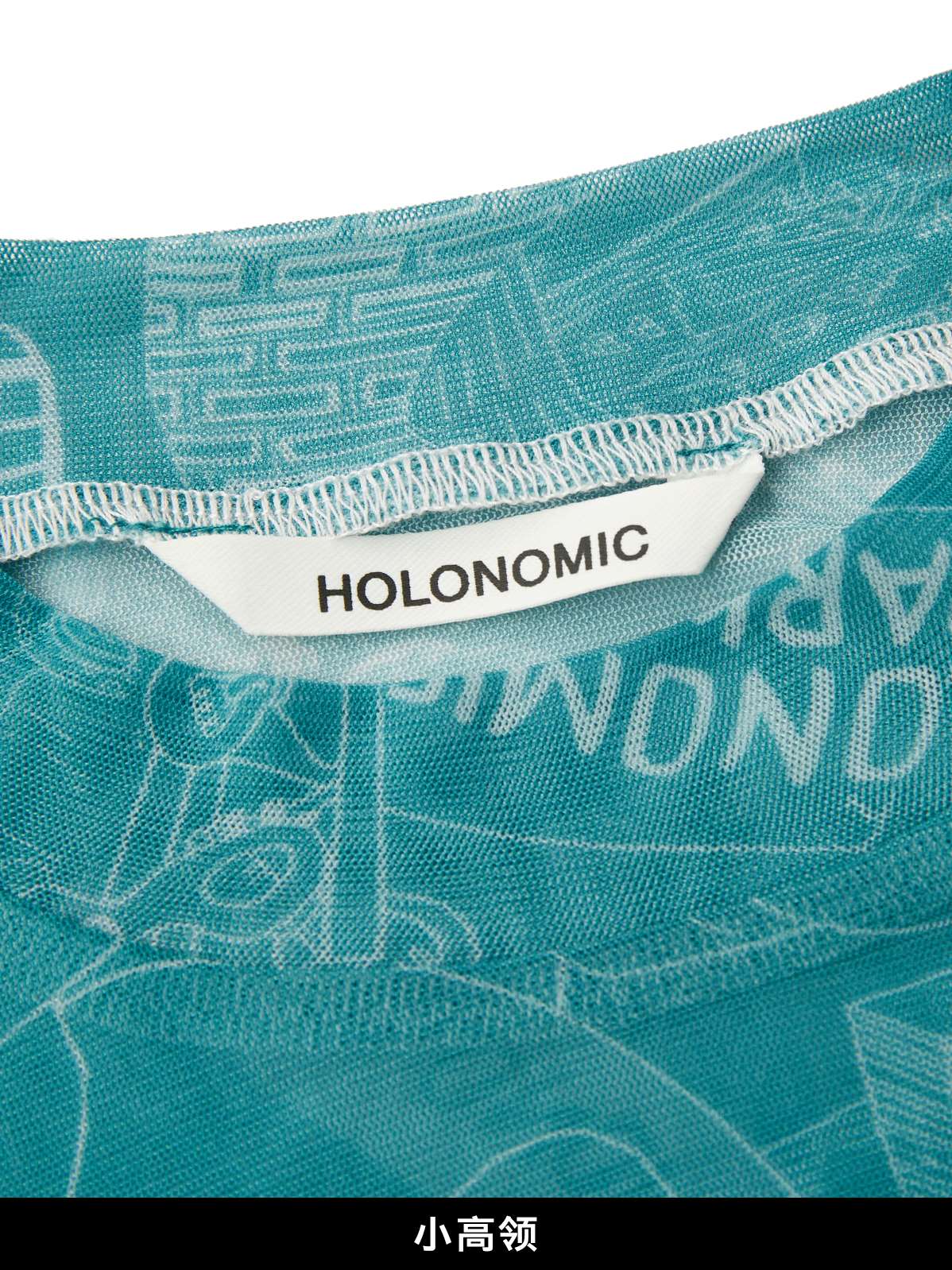 HOLONOMIC 原创设计印花网纱弹力修身长袖打底衫