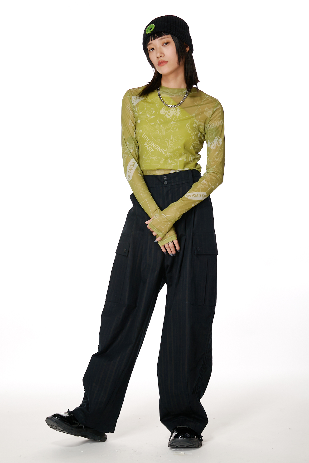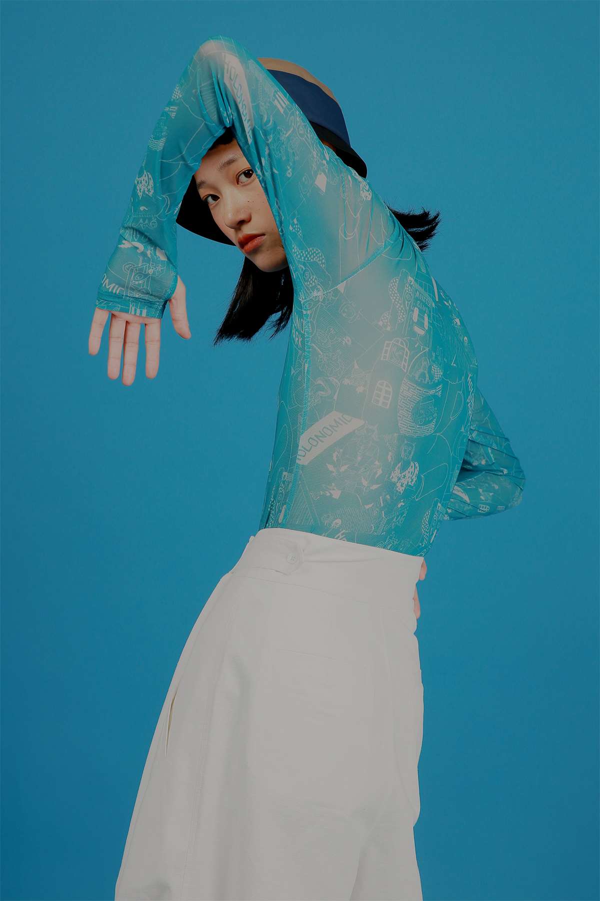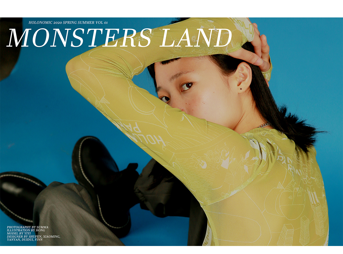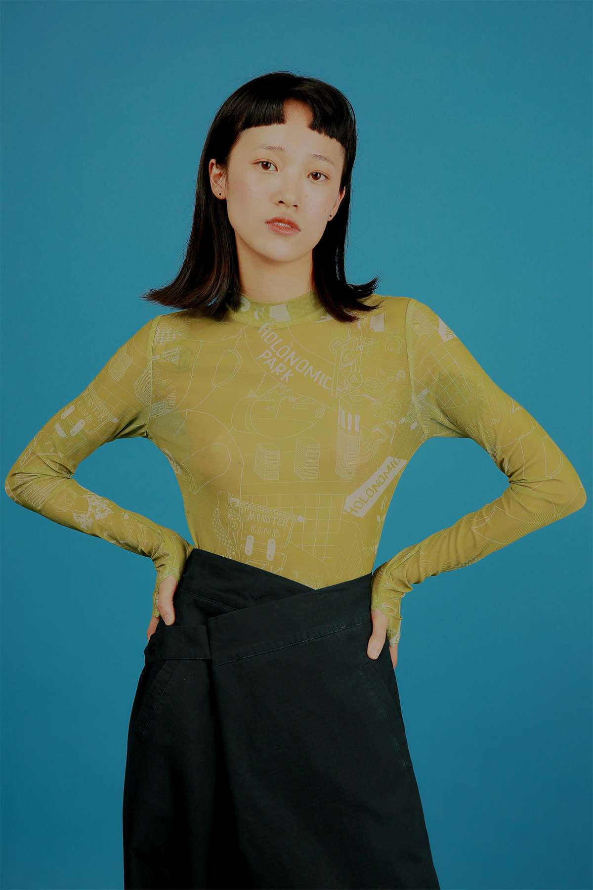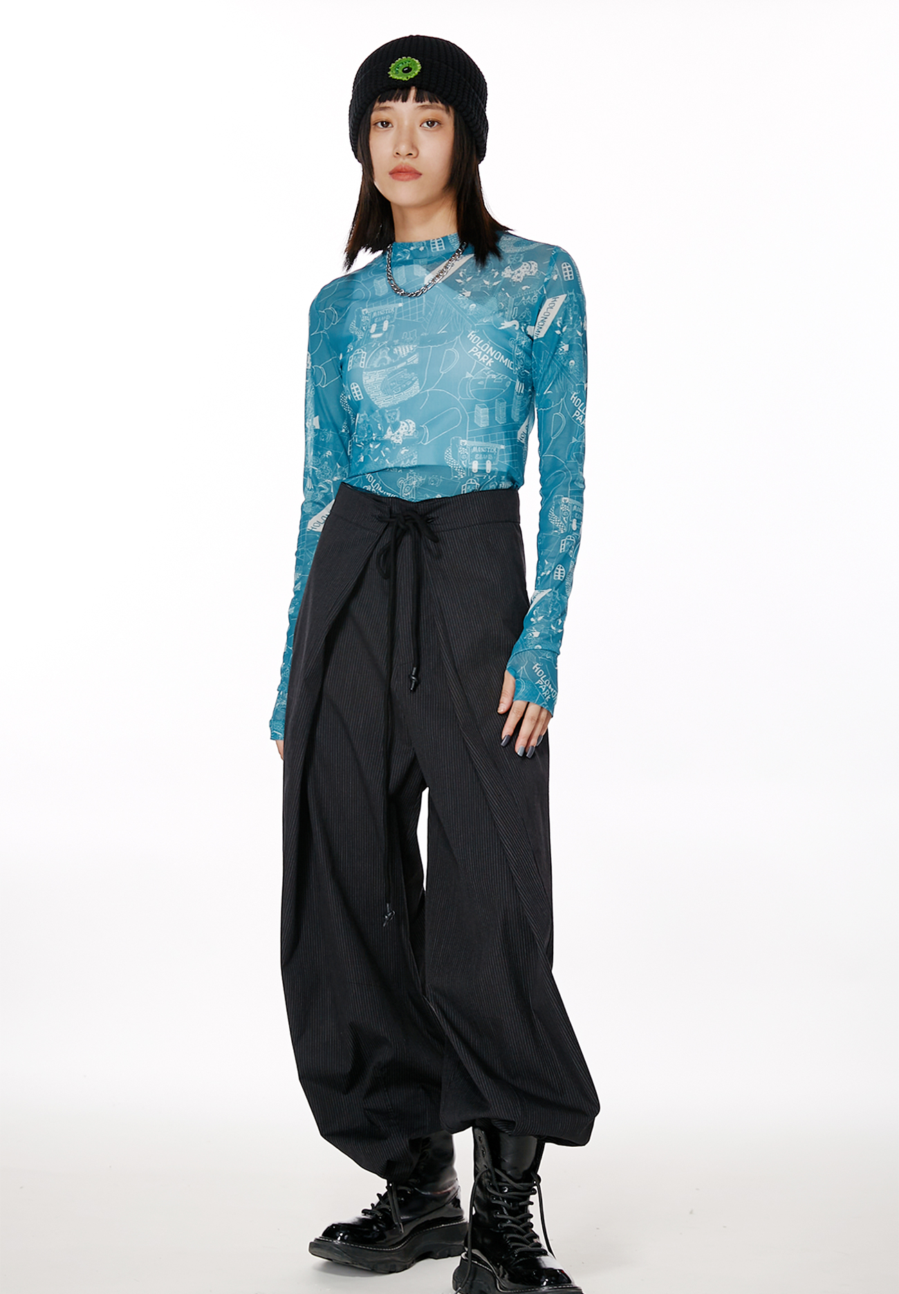 HOLONOMIC 原创设计印花网纱弹力修身长袖打底衫