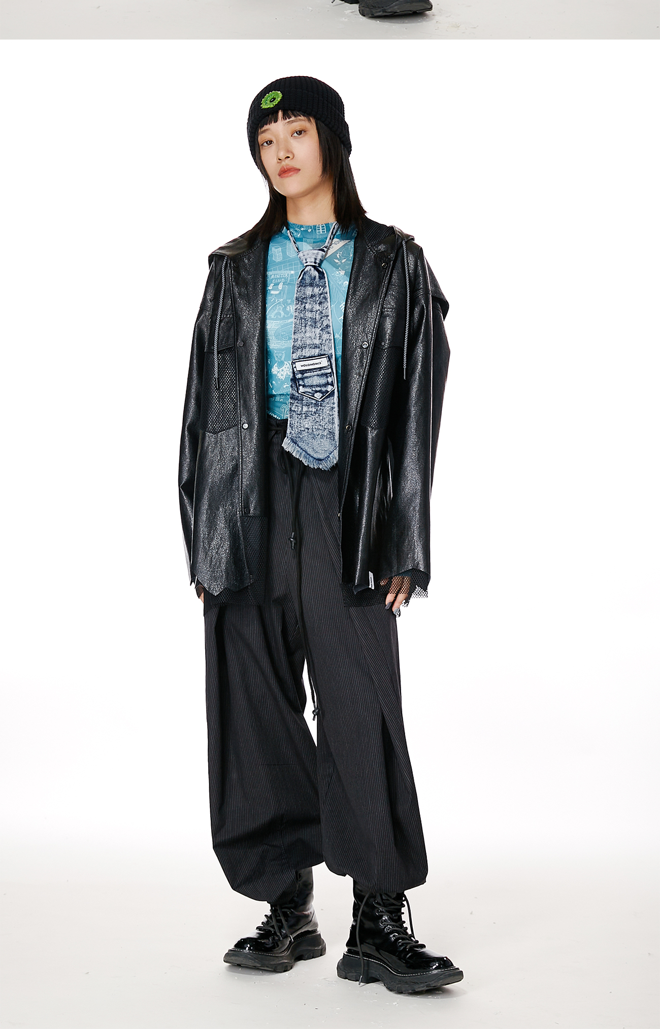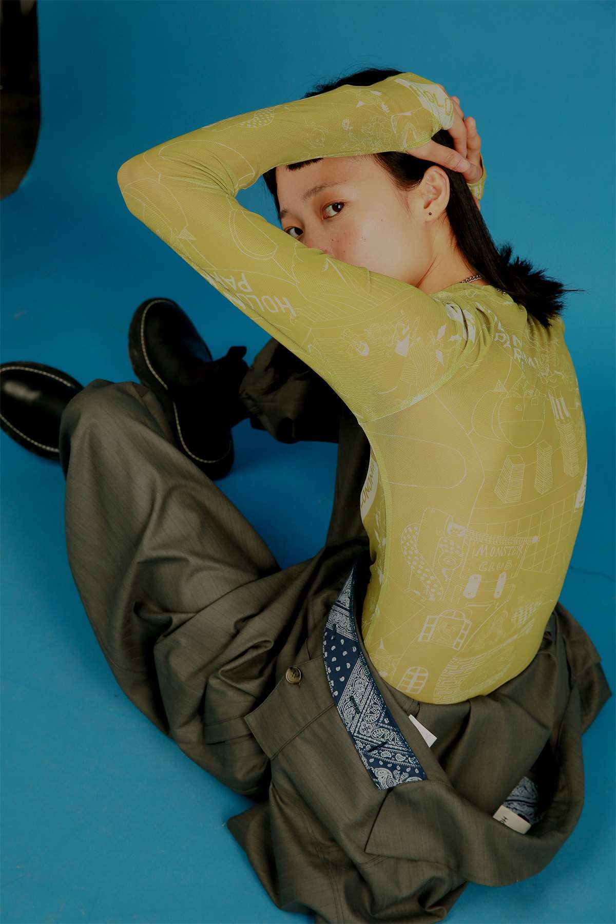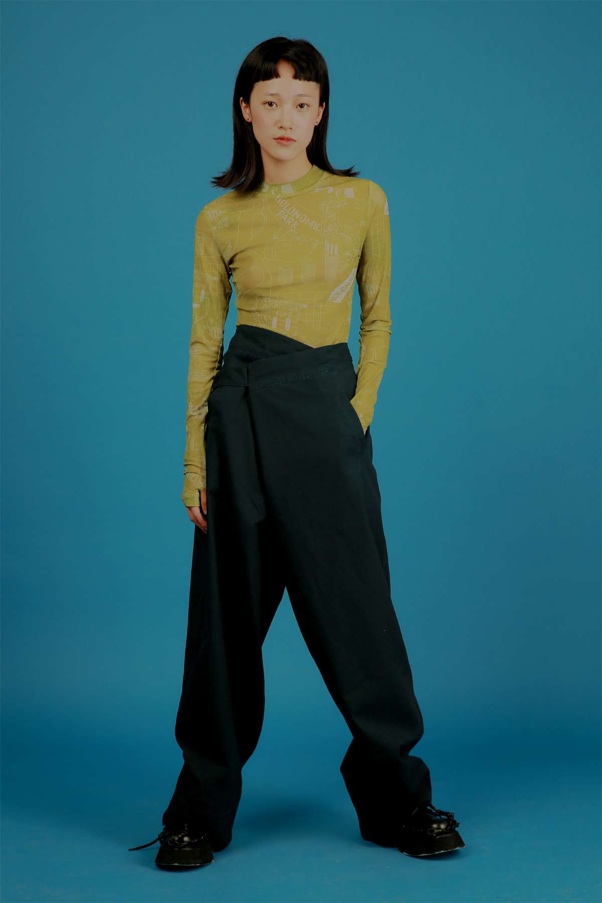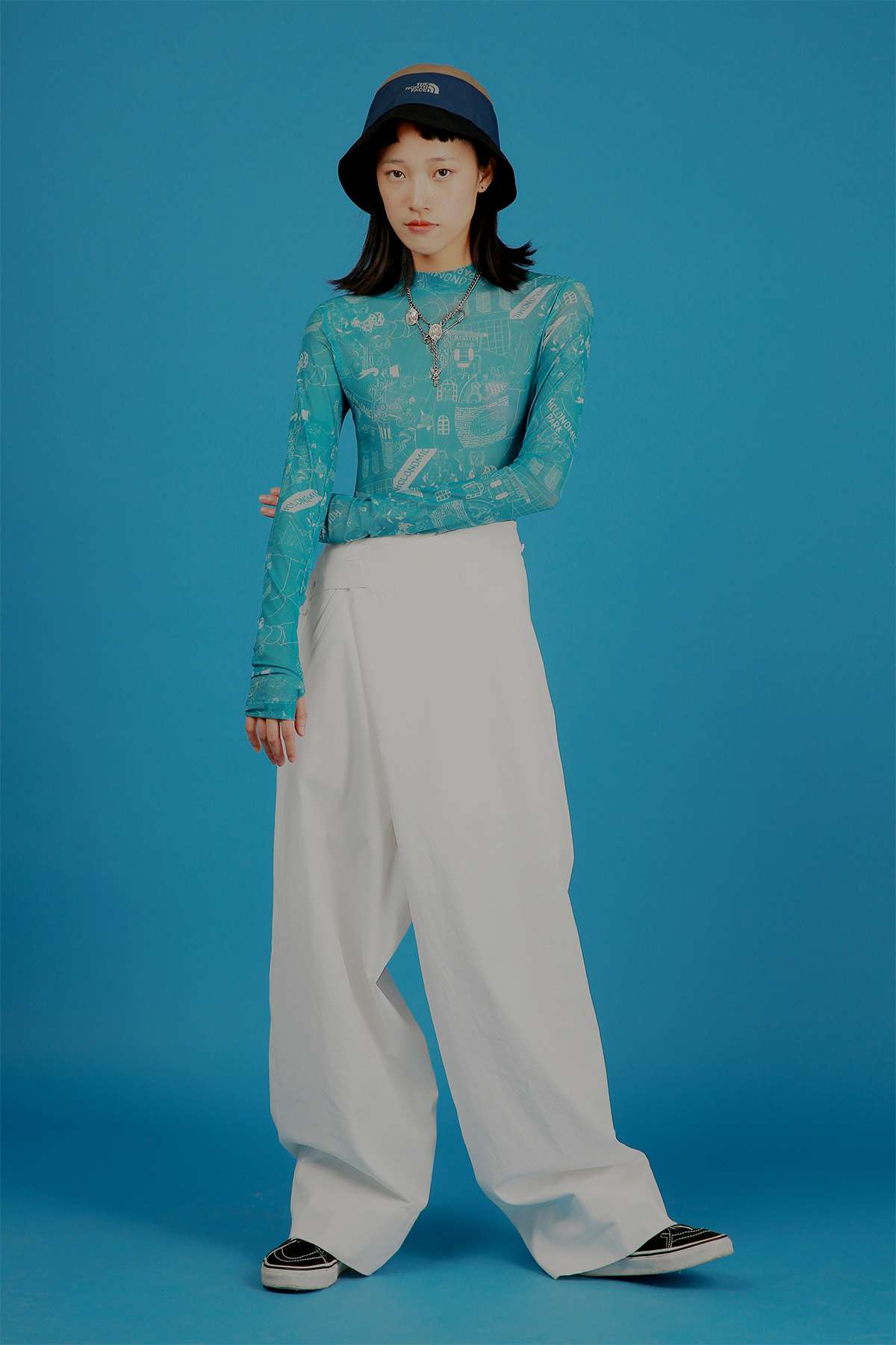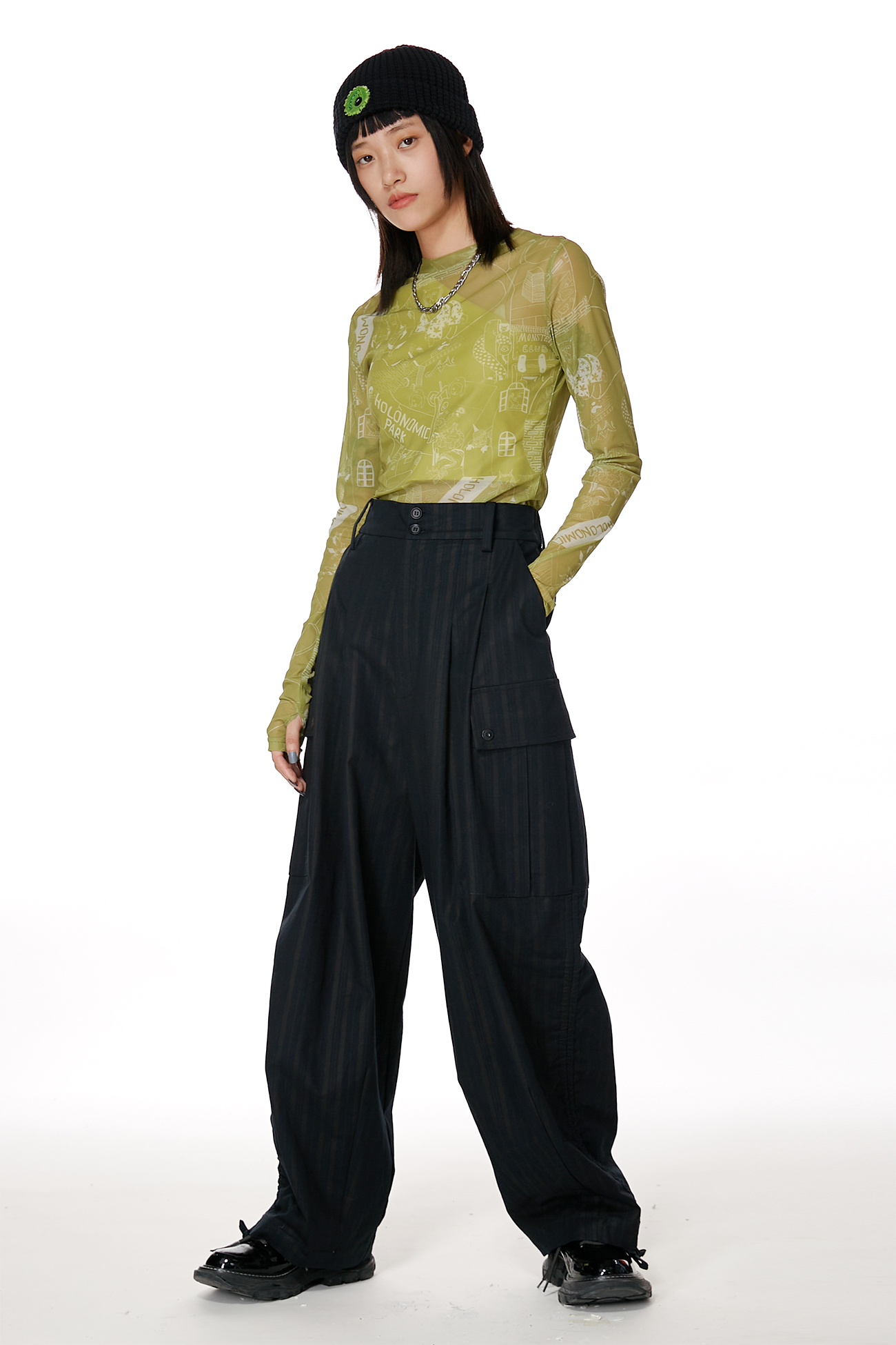 HOLONOMIC 原创设计印花网纱弹力修身长袖打底衫