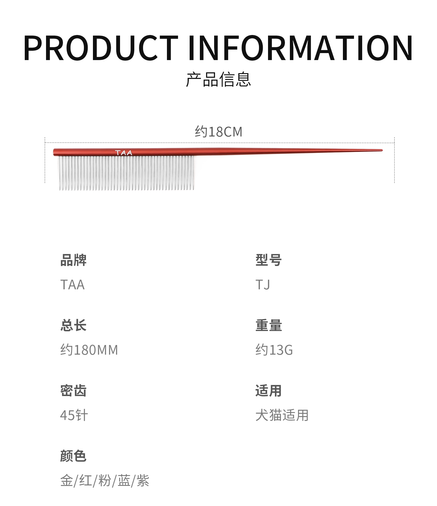 TAA它它宠物美容分界尖尾梳TJ猫犬用去除浮毛挑毛