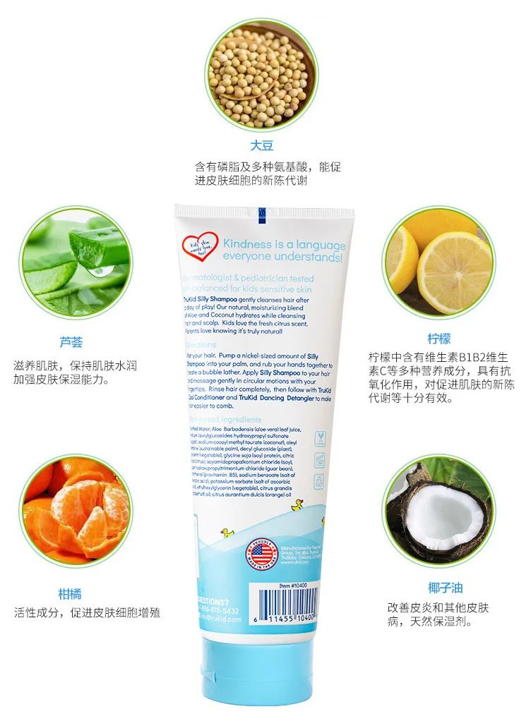 TruKid洗发水温和安全、能有效去除头皮表面的油脂、污垢,且不会过度清洁头发天然油脂。