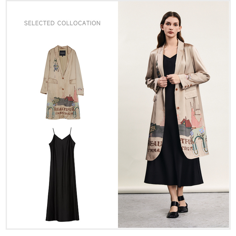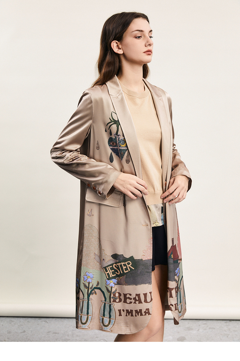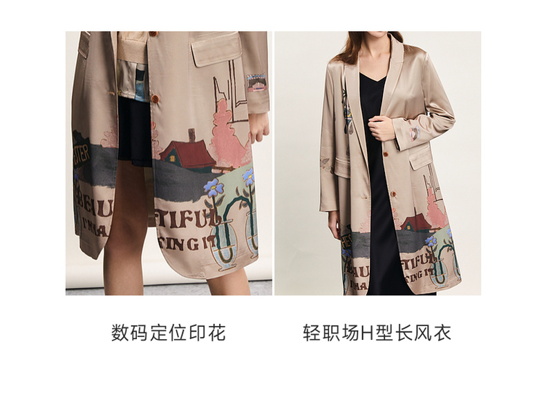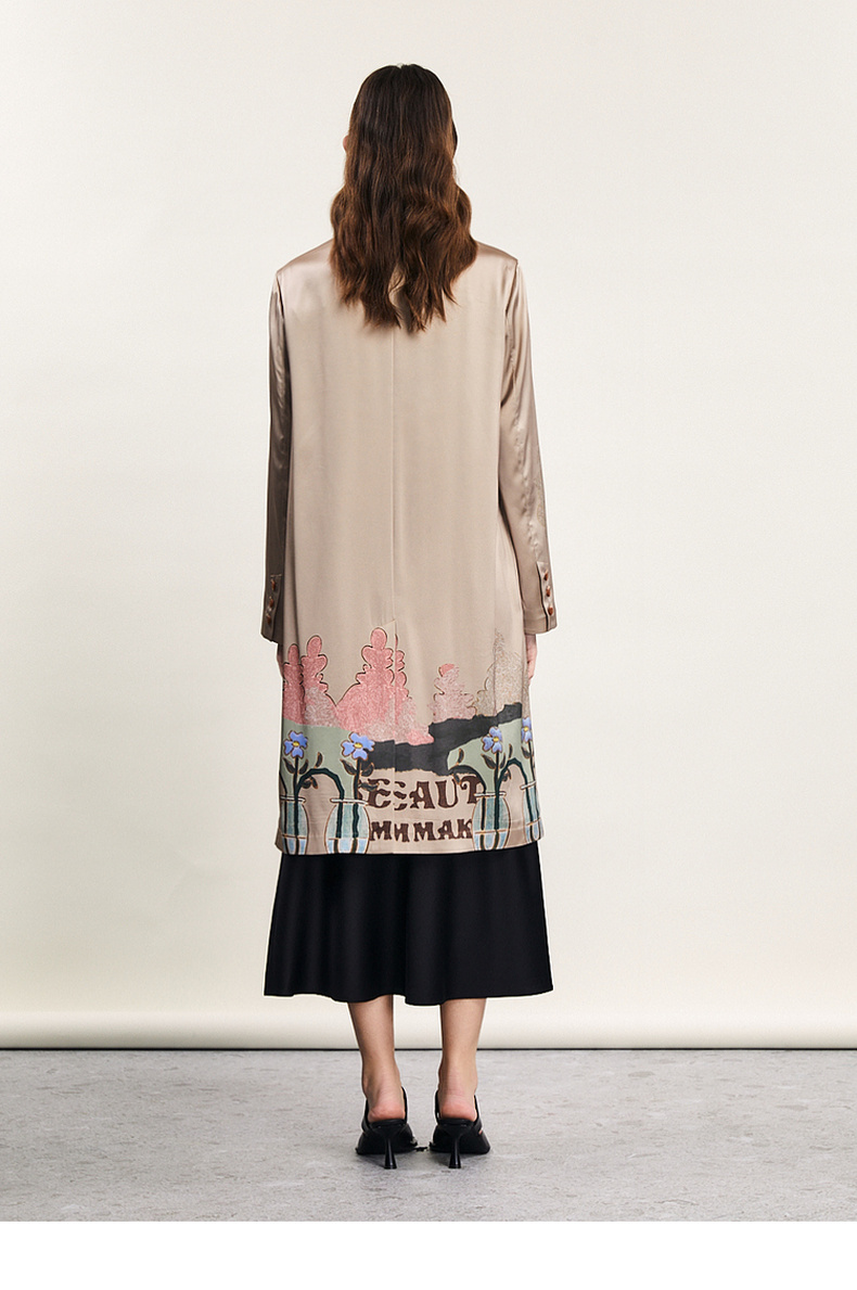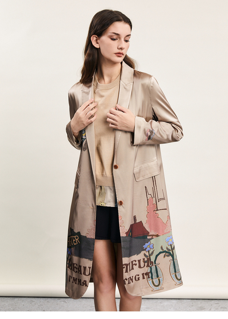 谜底长款风衣女2024春新款高端西装领原创印花宽松外套241GE0163