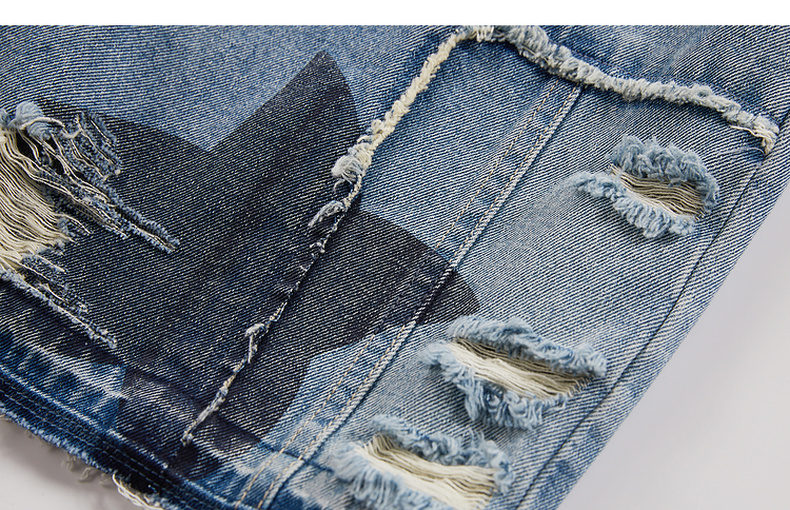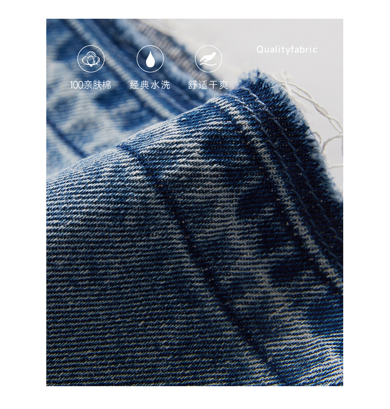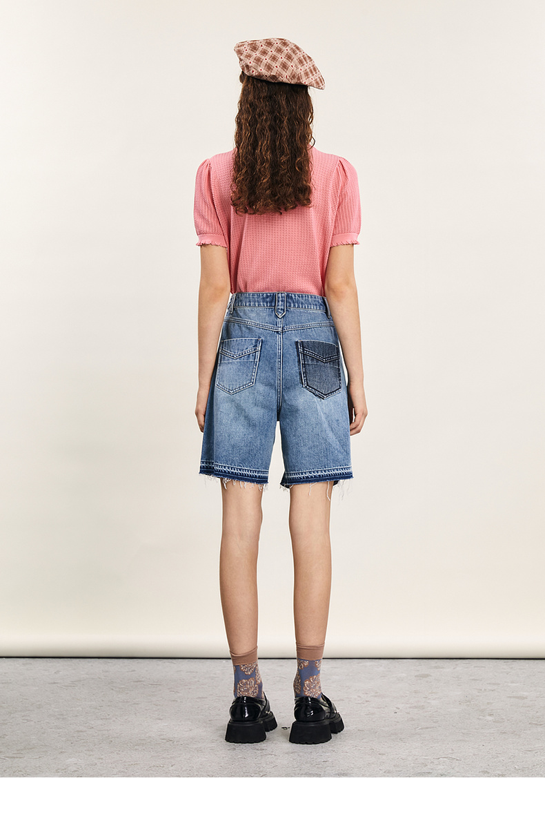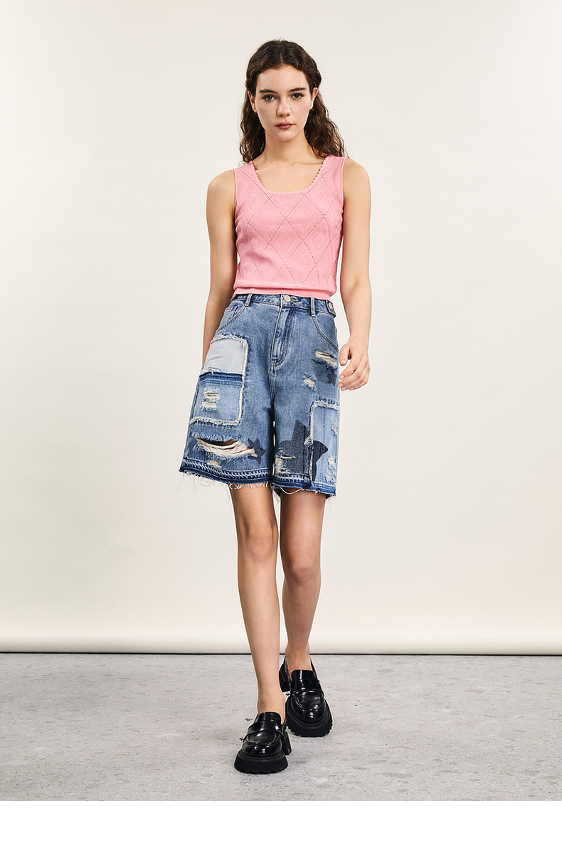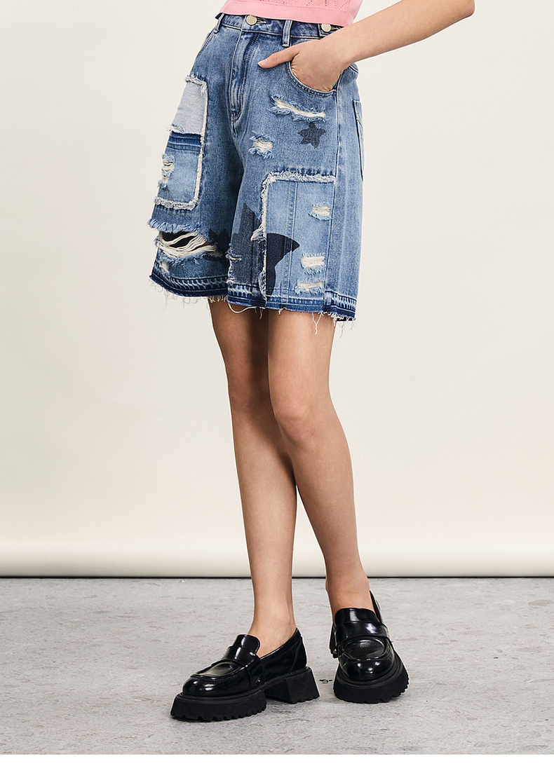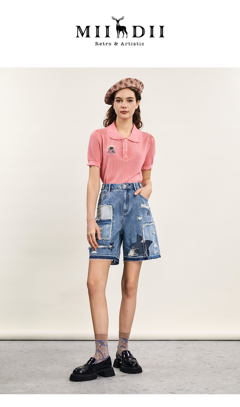 谜底牛仔短裤女2024年夏新品复古时尚贴布绣破洞直筒裤242MK0543