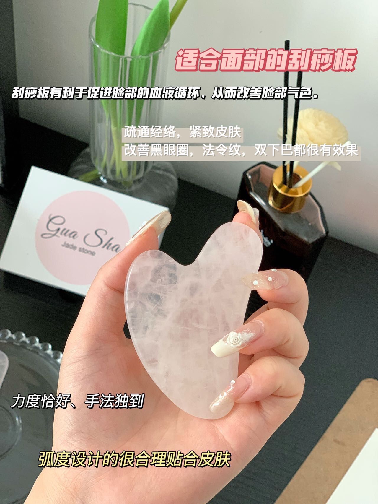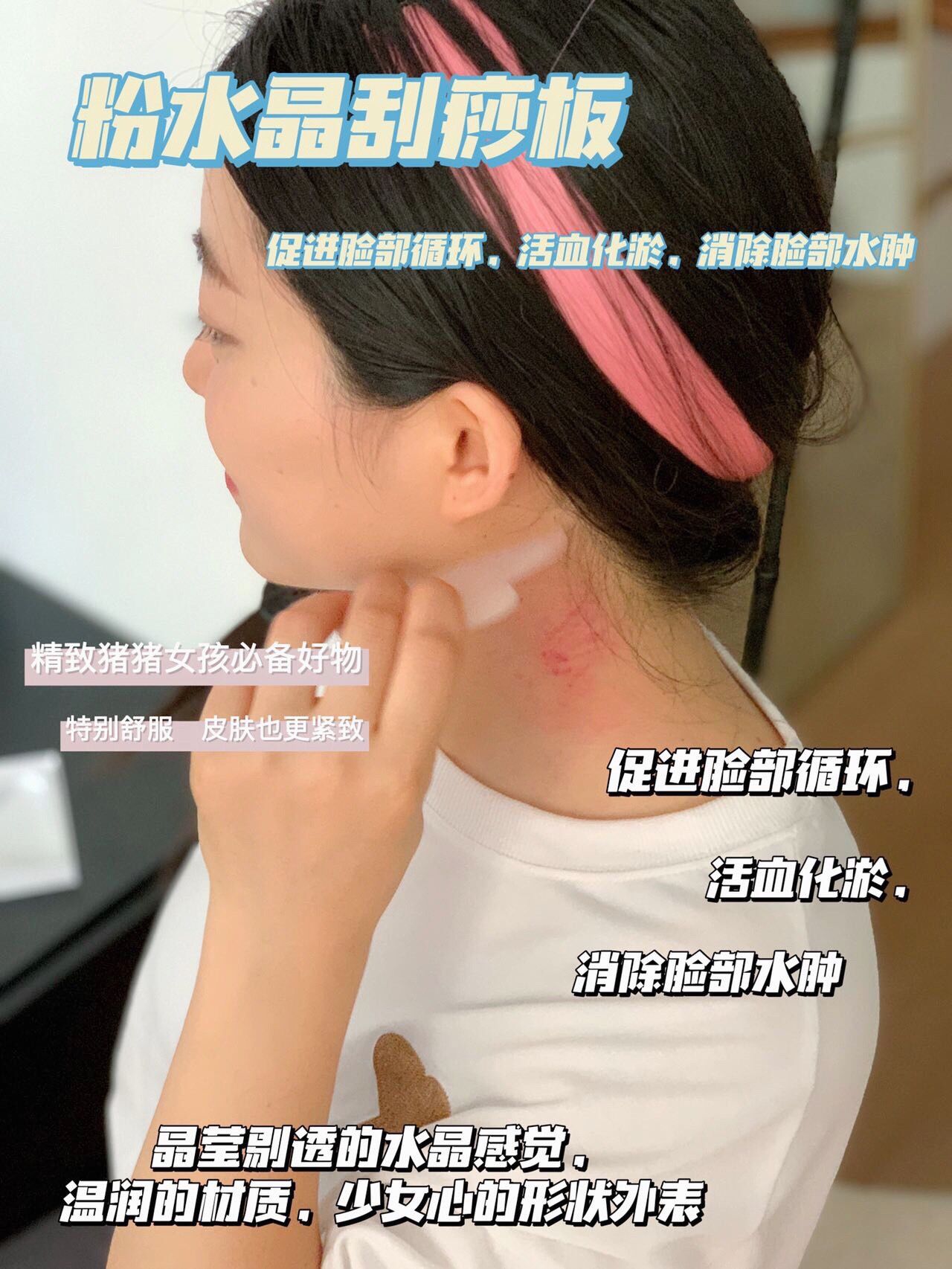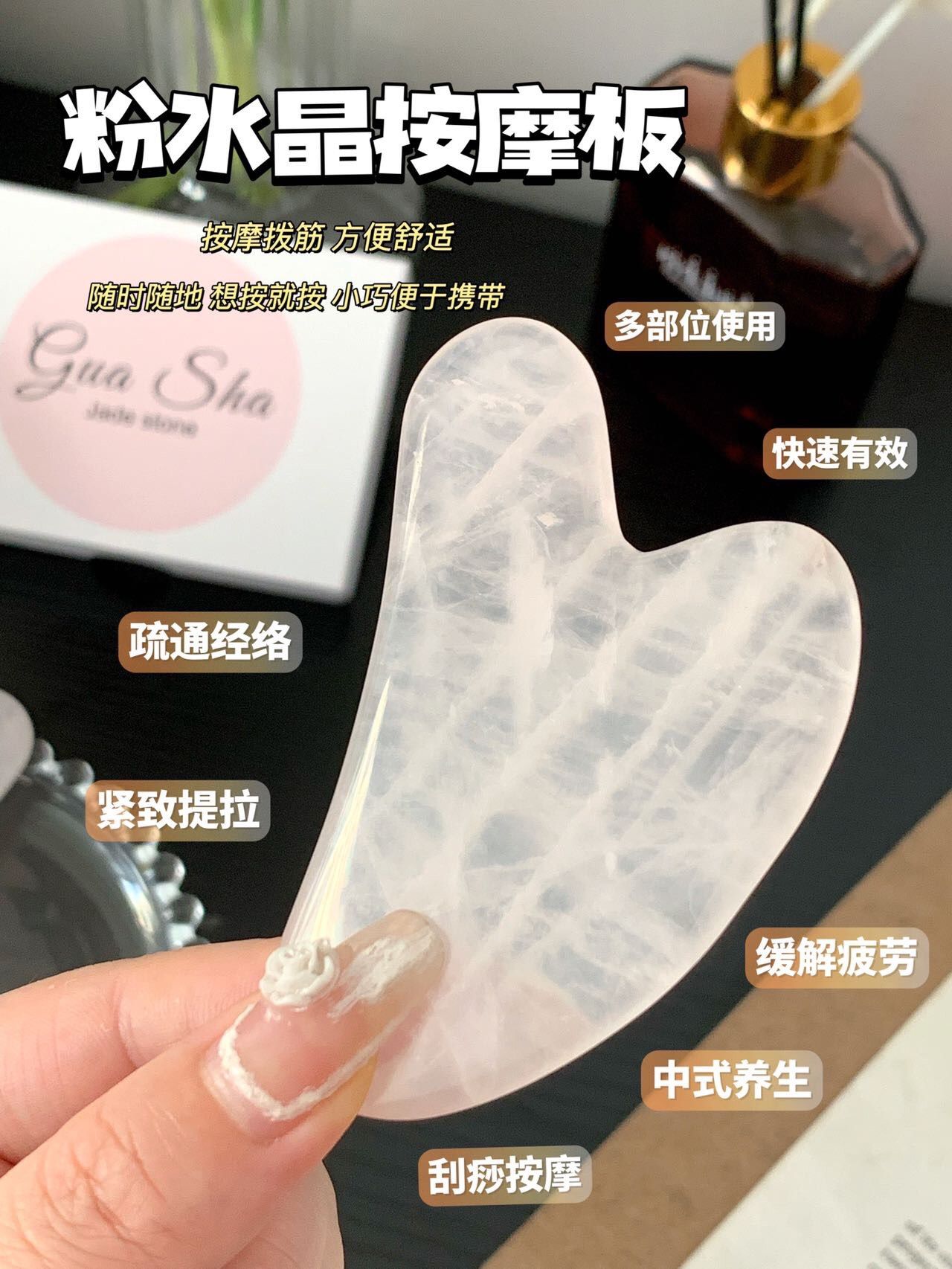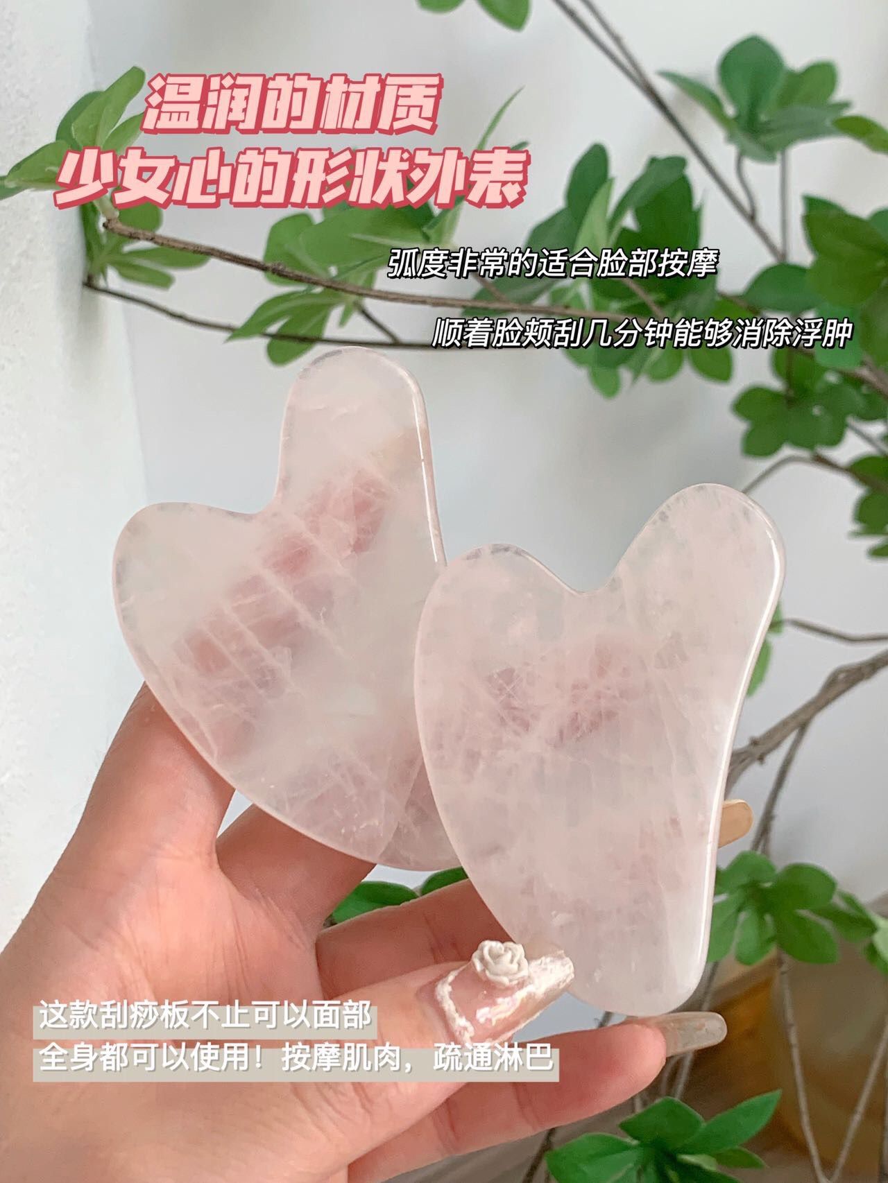 粉水晶刮痧板我妈妈则用于刮身体、腿部经络,有效疏通经络,促进排毒,
