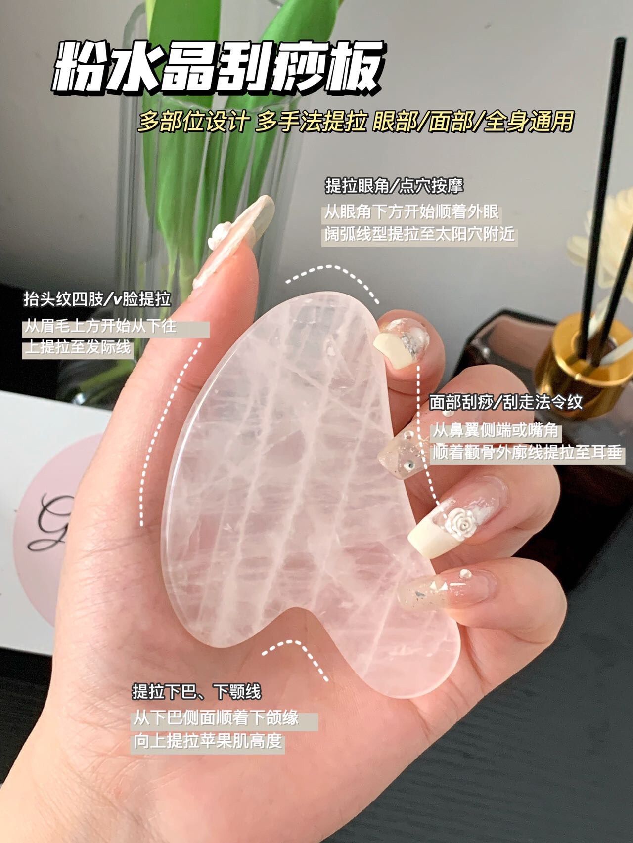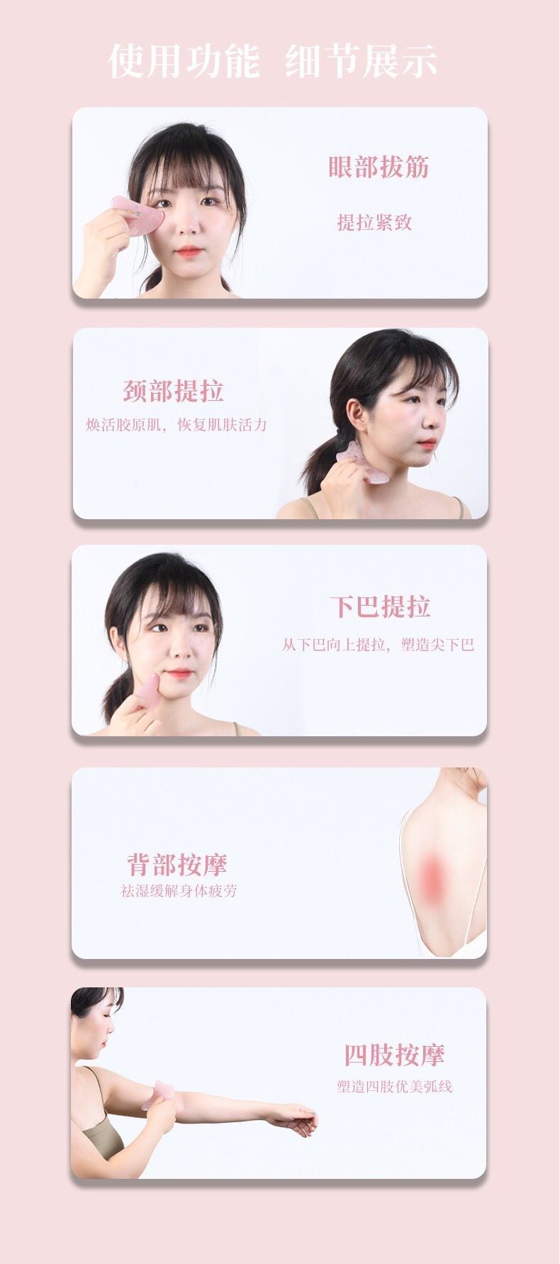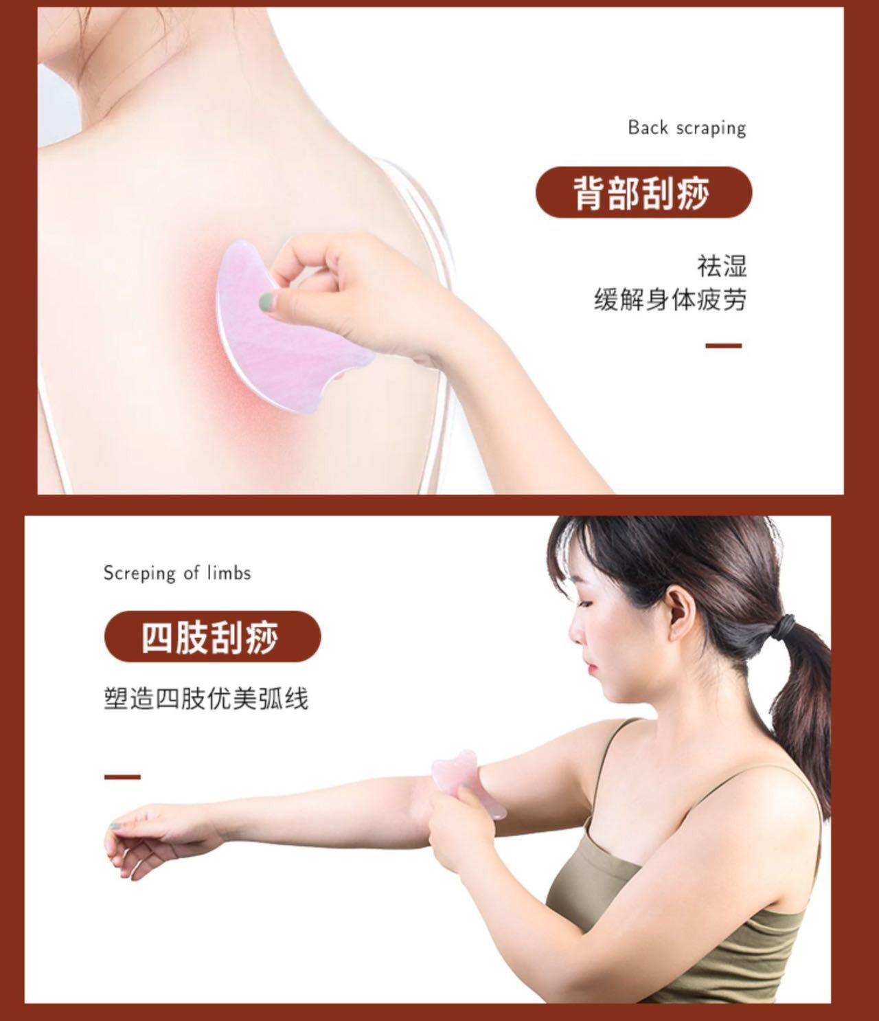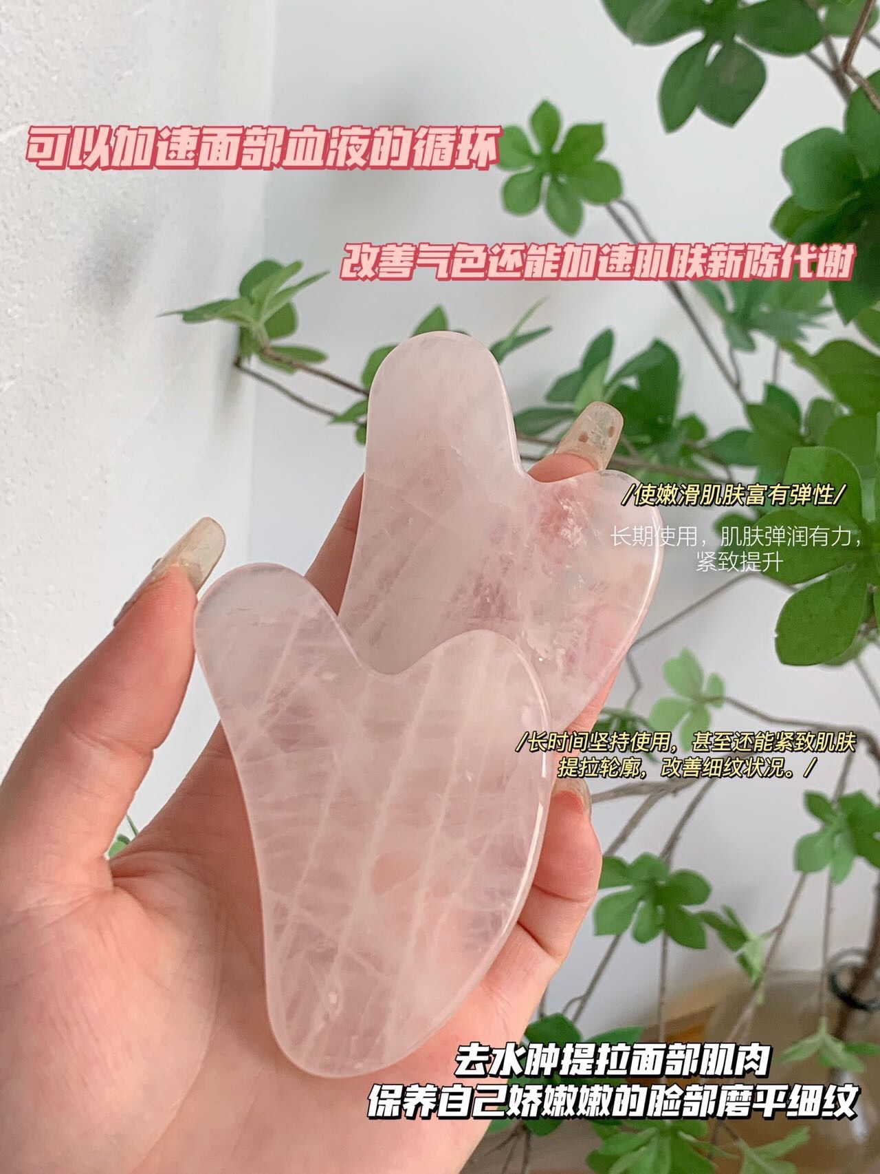 粉水晶刮痧板我妈妈则用于刮身体、腿部经络,有效疏通经络,促进排毒,