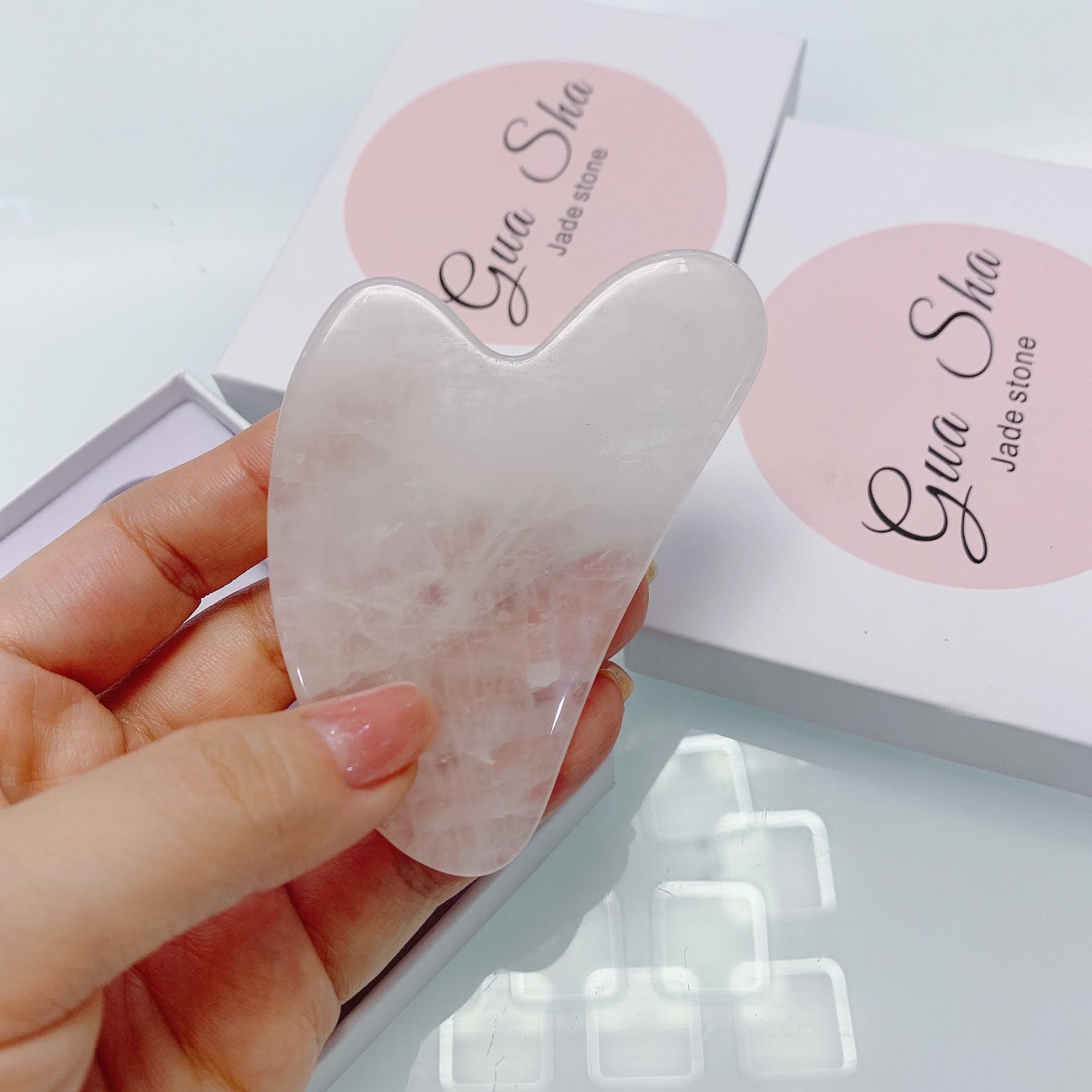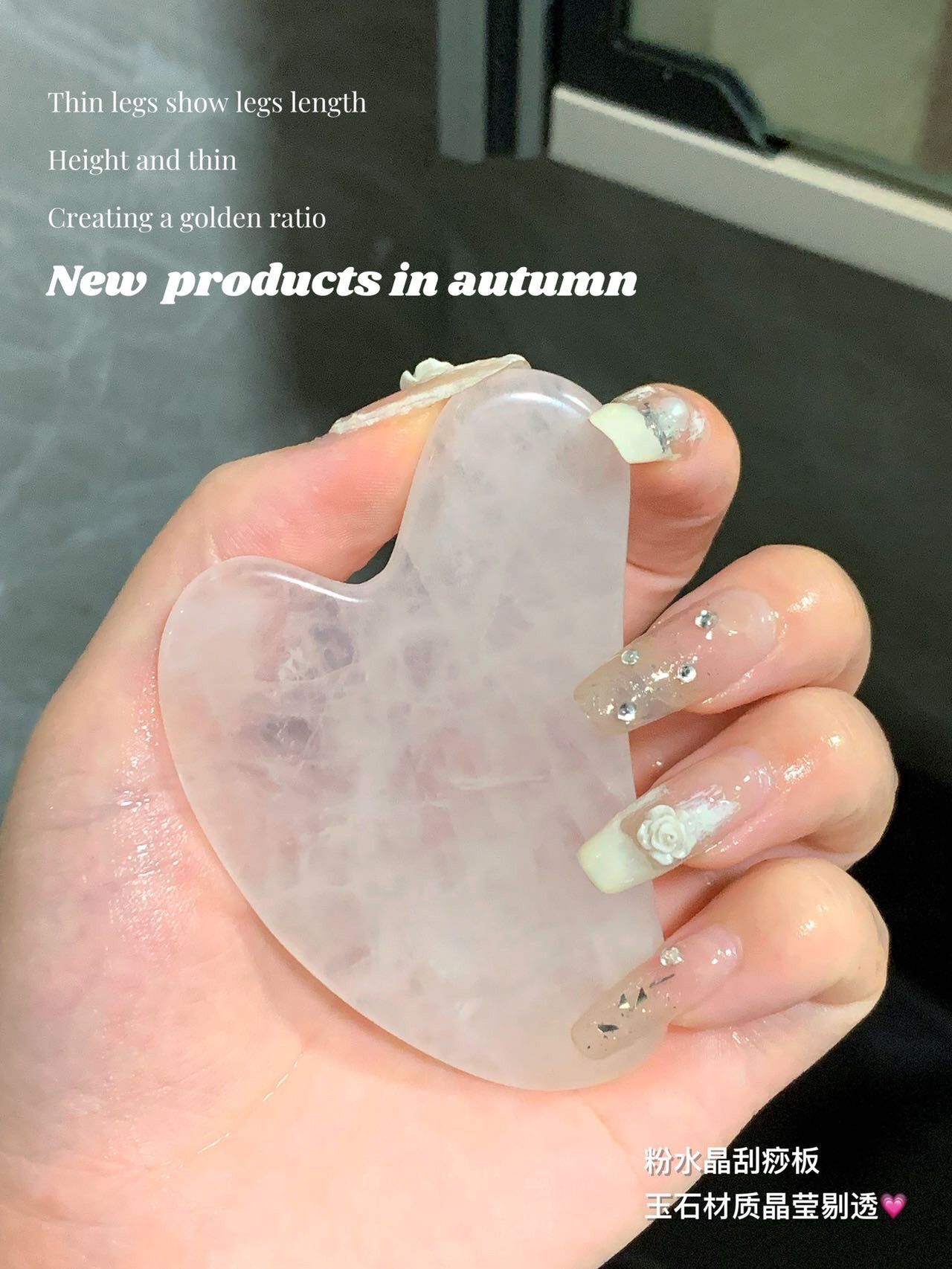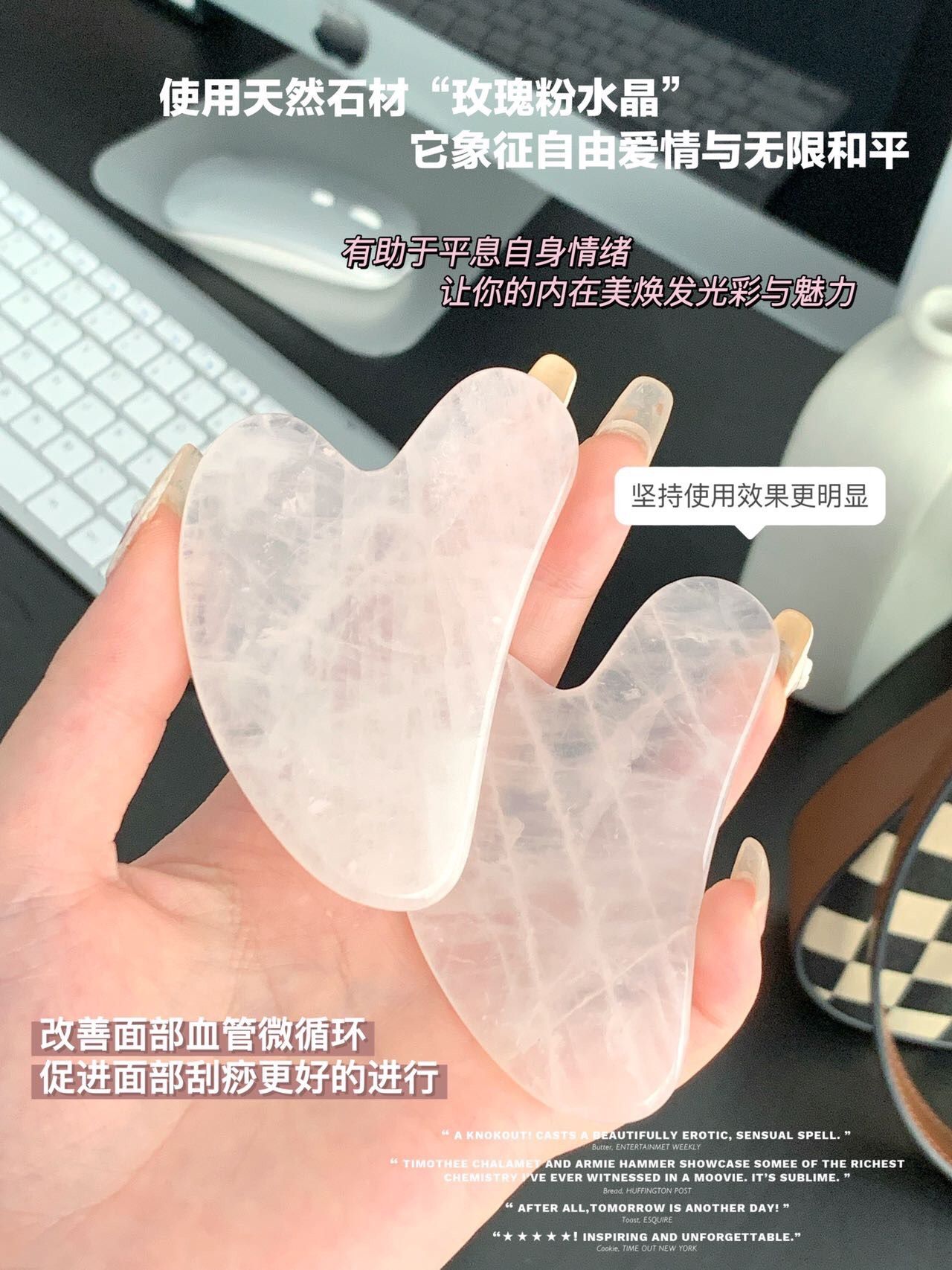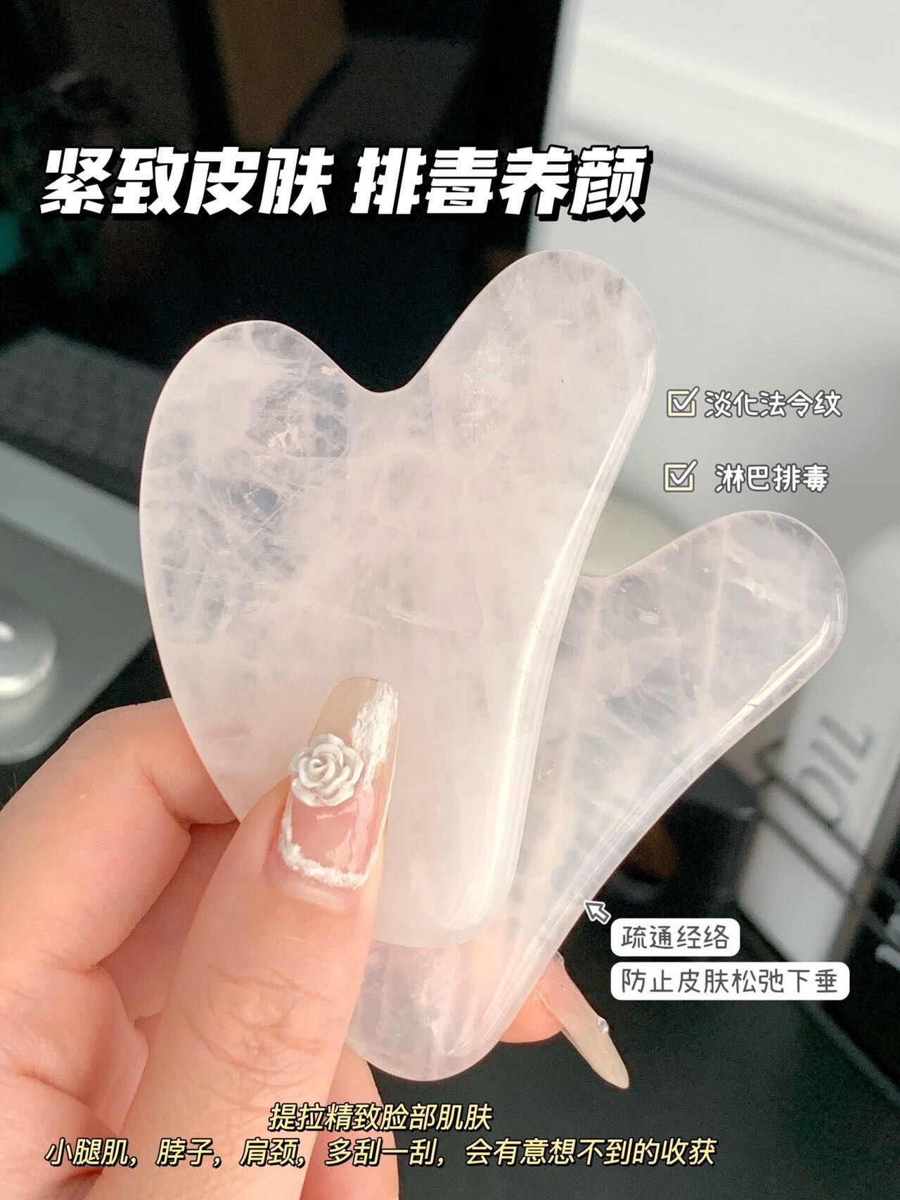 粉水晶刮痧板我妈妈则用于刮身体、腿部经络,有效疏通经络,促进排毒,