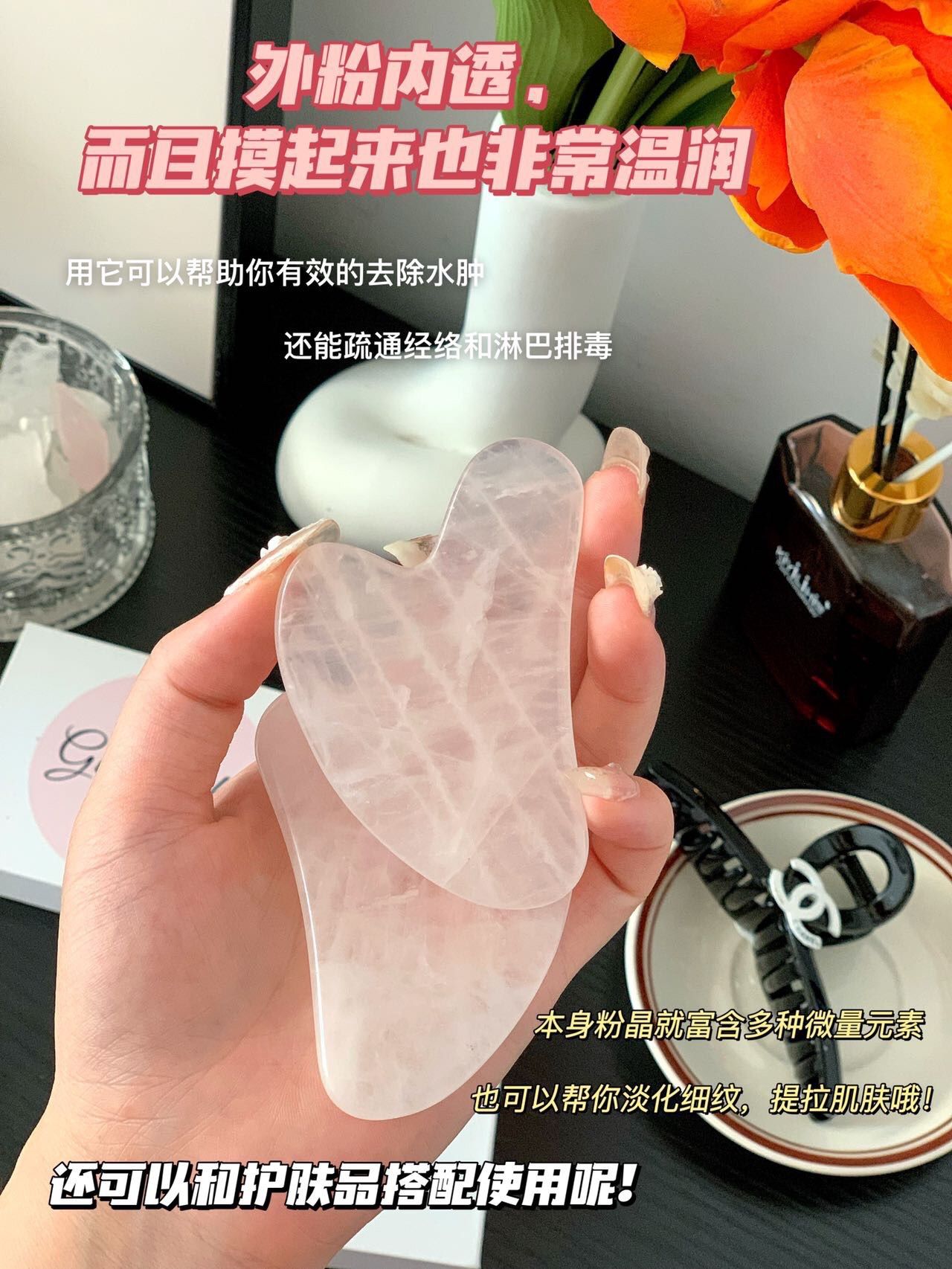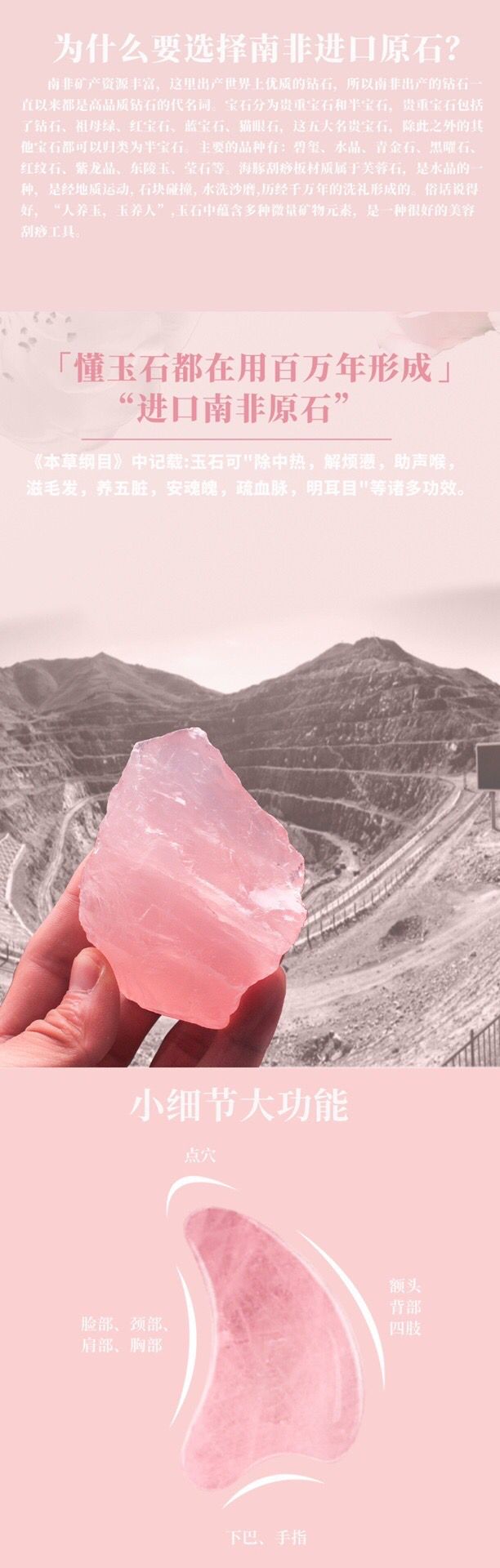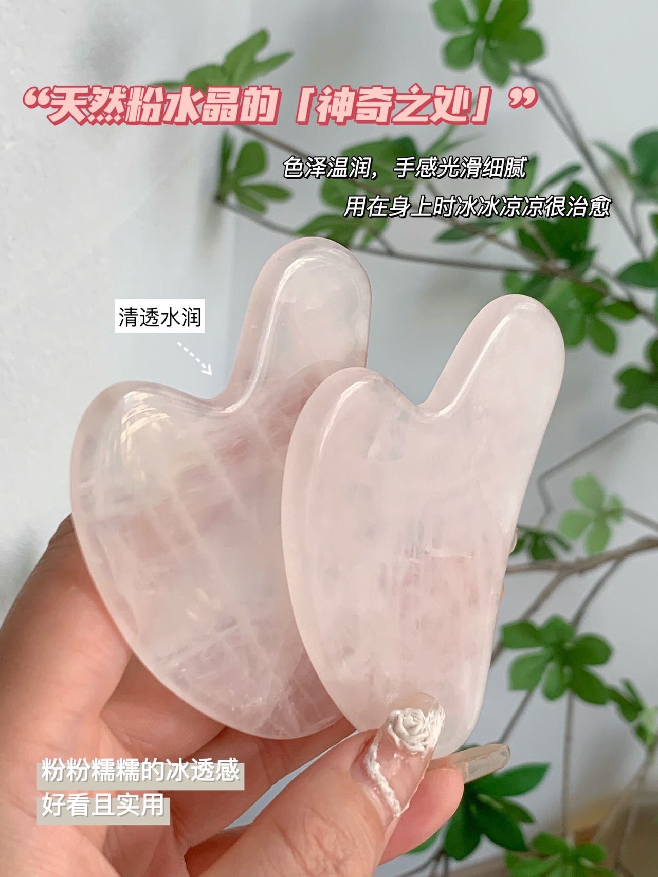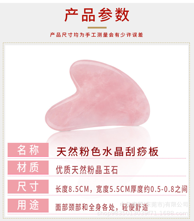 粉水晶具有润肤生肌,清热解毒,镇静安神等作用,触感舒适,非常适合面部刮痧,且无需保养,喜欢脸部按摩的姐妹们推荐入手哦!