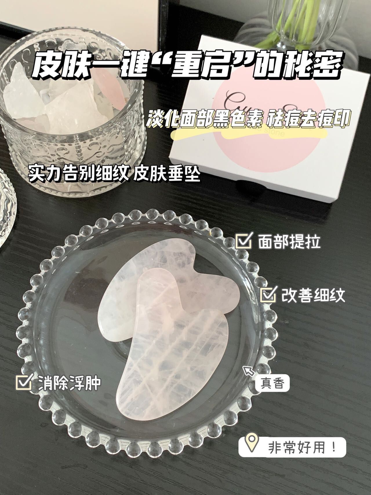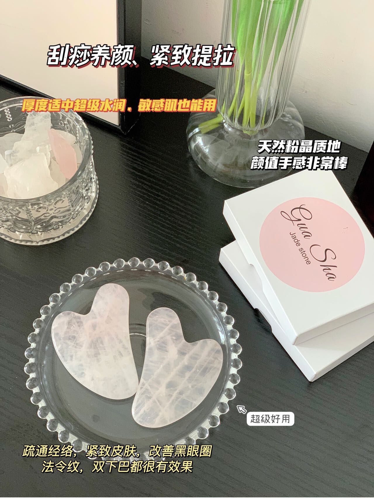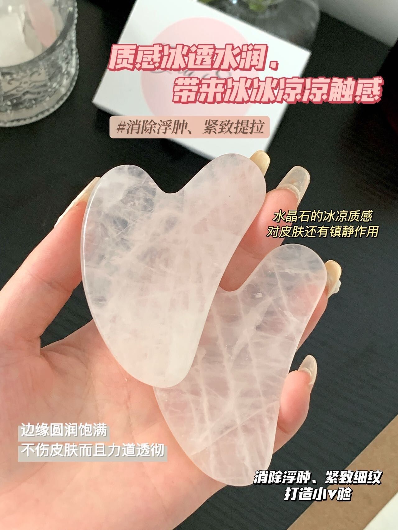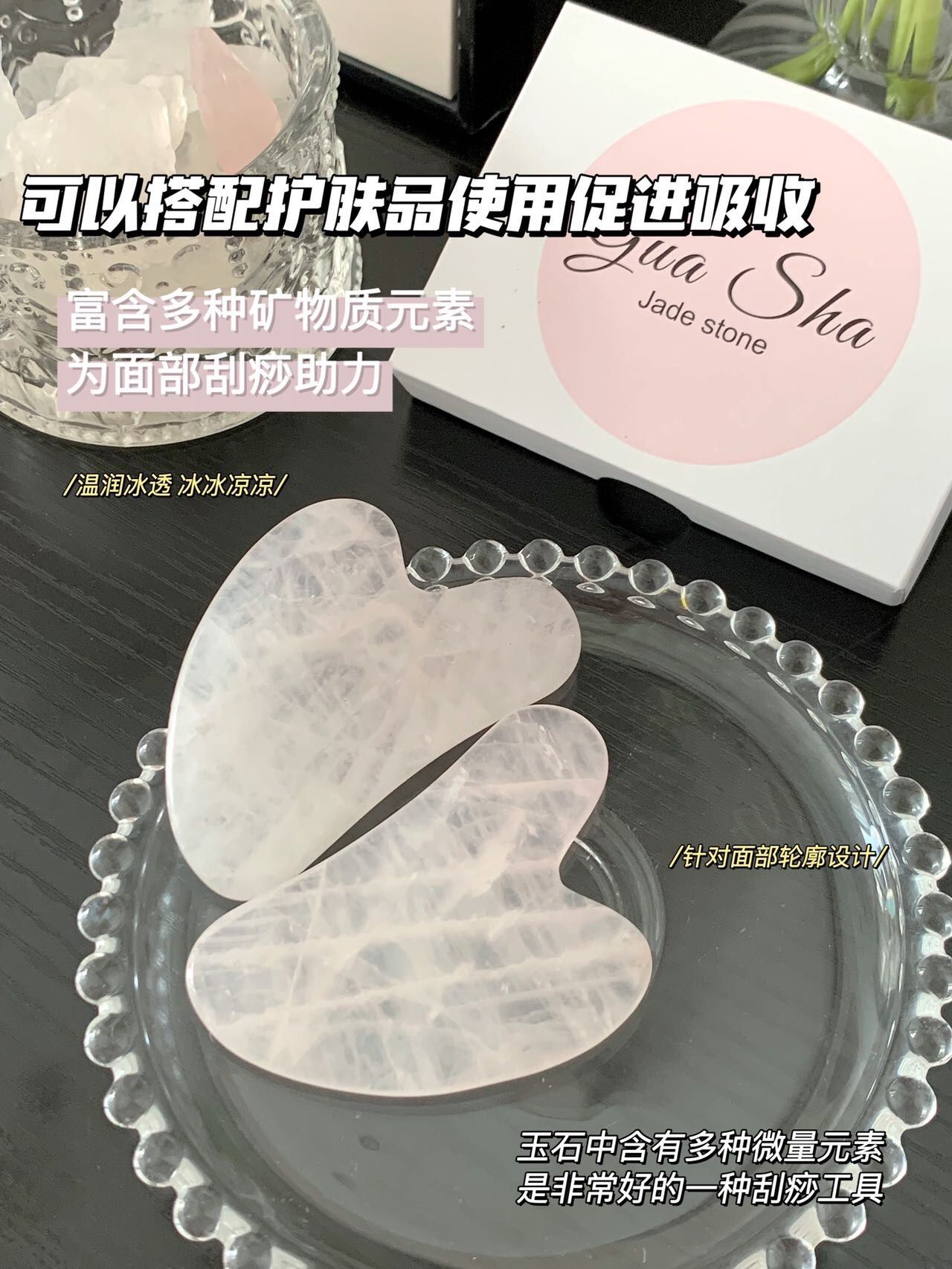粉水晶具有润肤生肌,清热解毒,镇静安神等作用,触感舒适,非常适合面部刮痧,且无需保养,喜欢脸部按摩的姐妹们推荐入手哦!