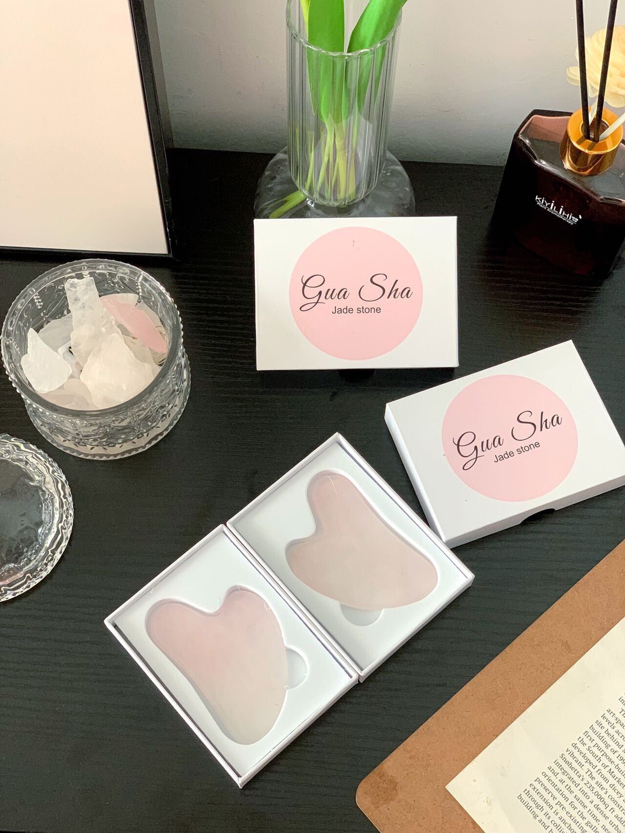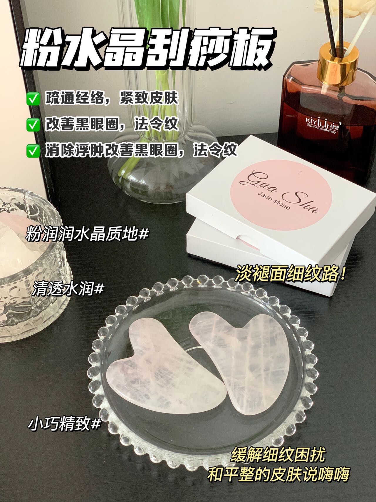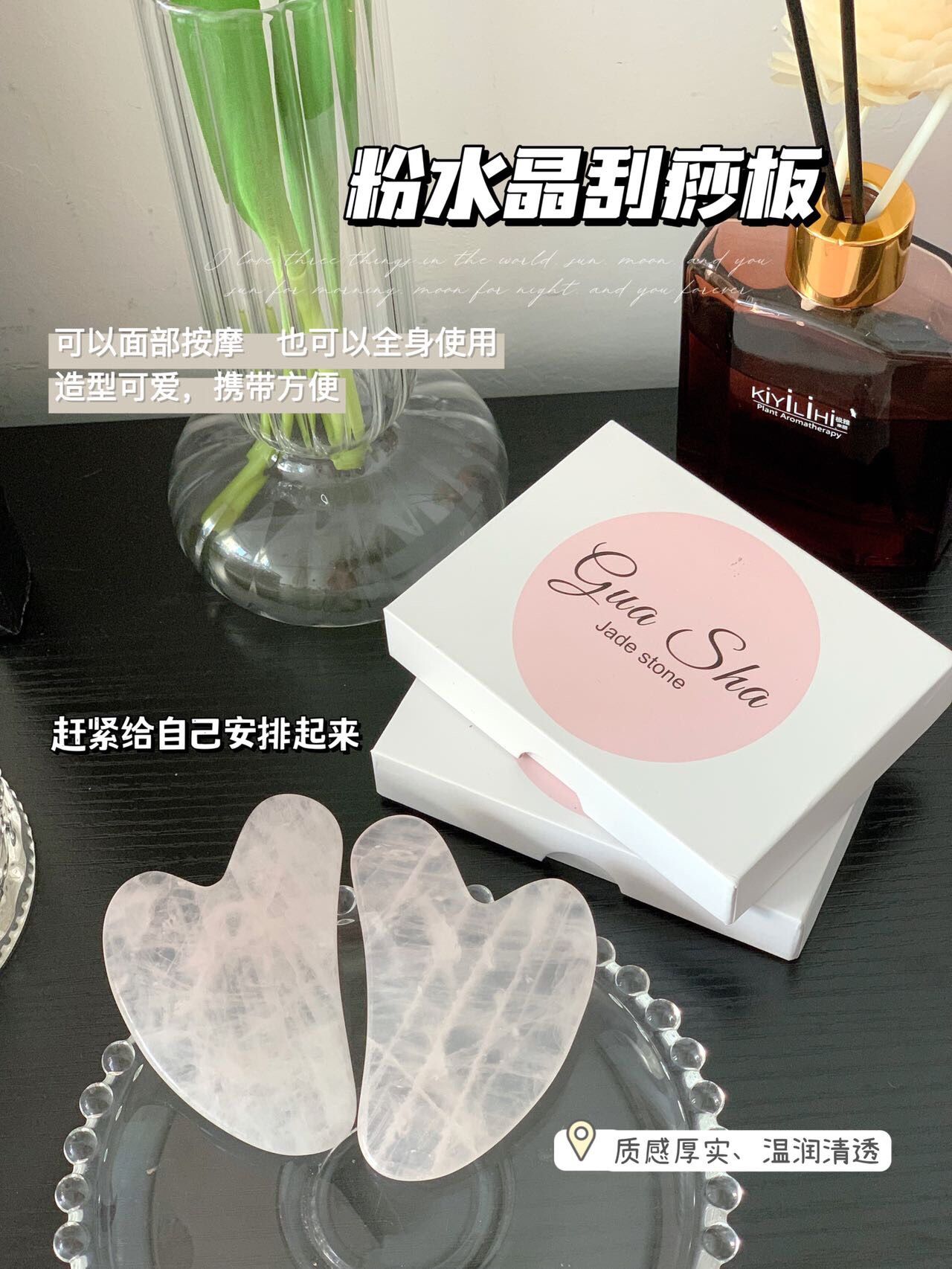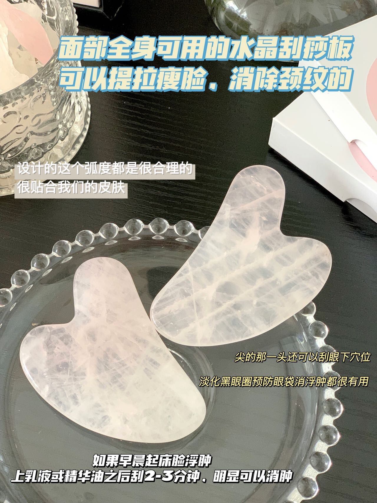 姐妹们!今天给大家种草一款超高颜值刮痧板!平时洗完脸最喜欢搭配精油刮痧。超适合懒人的一款刮痧板。炎夏觉得湿气重,可以适当进行刮痧,排毒疏通经络,促进血液循环~特别是现在这个天气开始热了,空调吹多了皮肤容易敏感干燥。这个刮痧板太绝了!粉晶本来就可以镇静肌肤,舒缓疲劳!配合刮痧教程,还可以提拉紧致瘦脸!坚持使用效果更明显,我们一起变美吧!