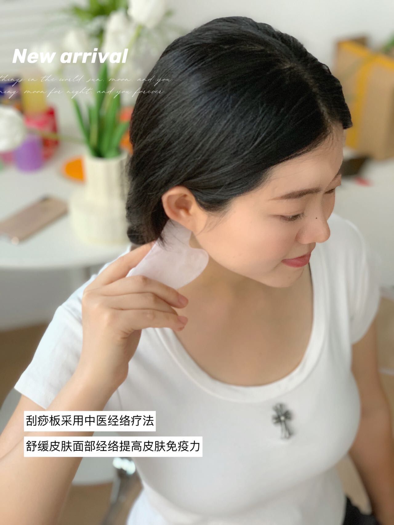 在皮肤上刮痧质地是温润通透的,消除脸部水肿,不仅可以舒缓疲劳,还可以提升肌肤;