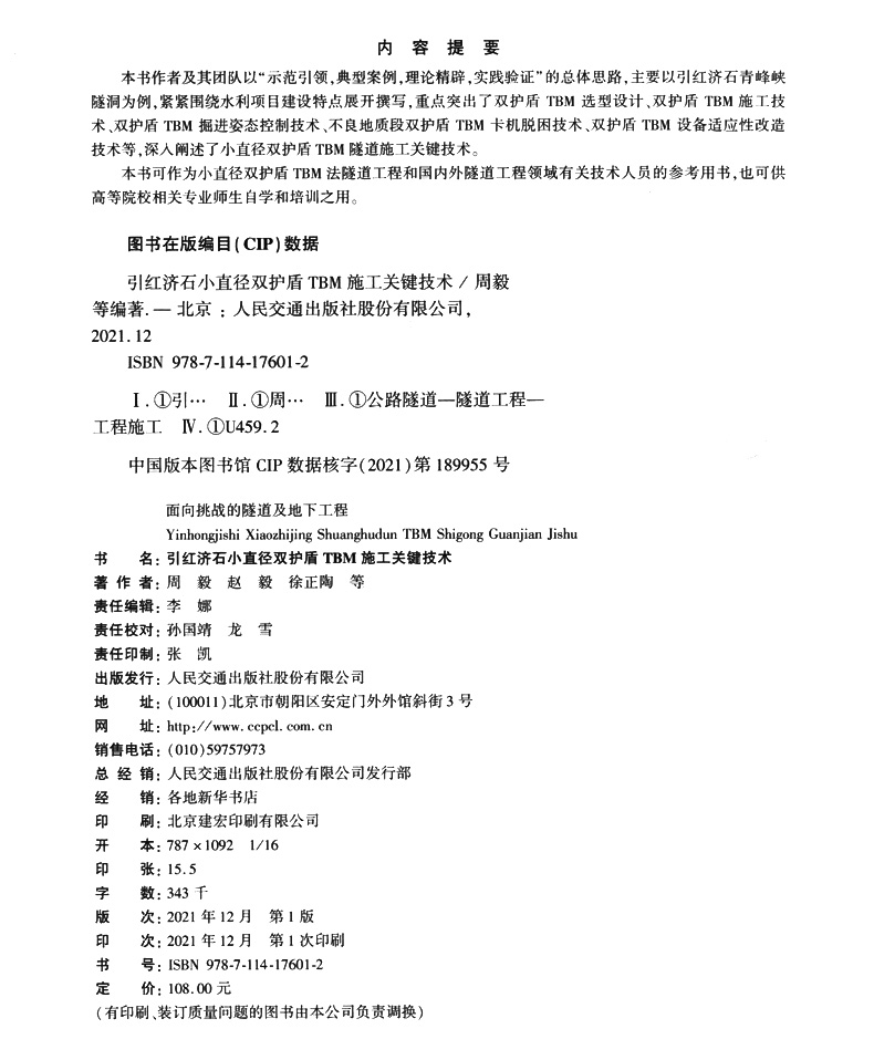 书名:引红济石小直径双护盾TBM施工关键技术
