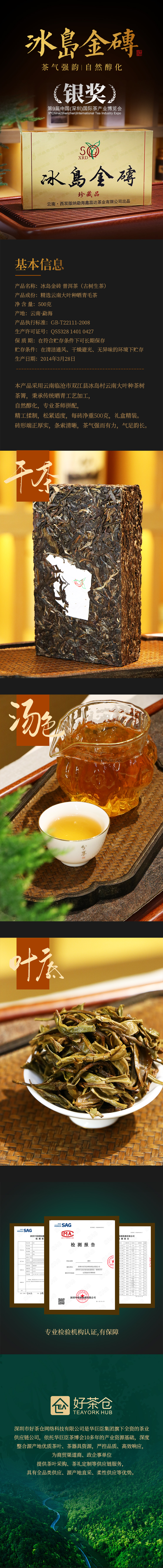 【普洱银奖】鑫蕊达 冰岛金砖 普洱古树生茶 珍藏品 500g/砖 礼盒装